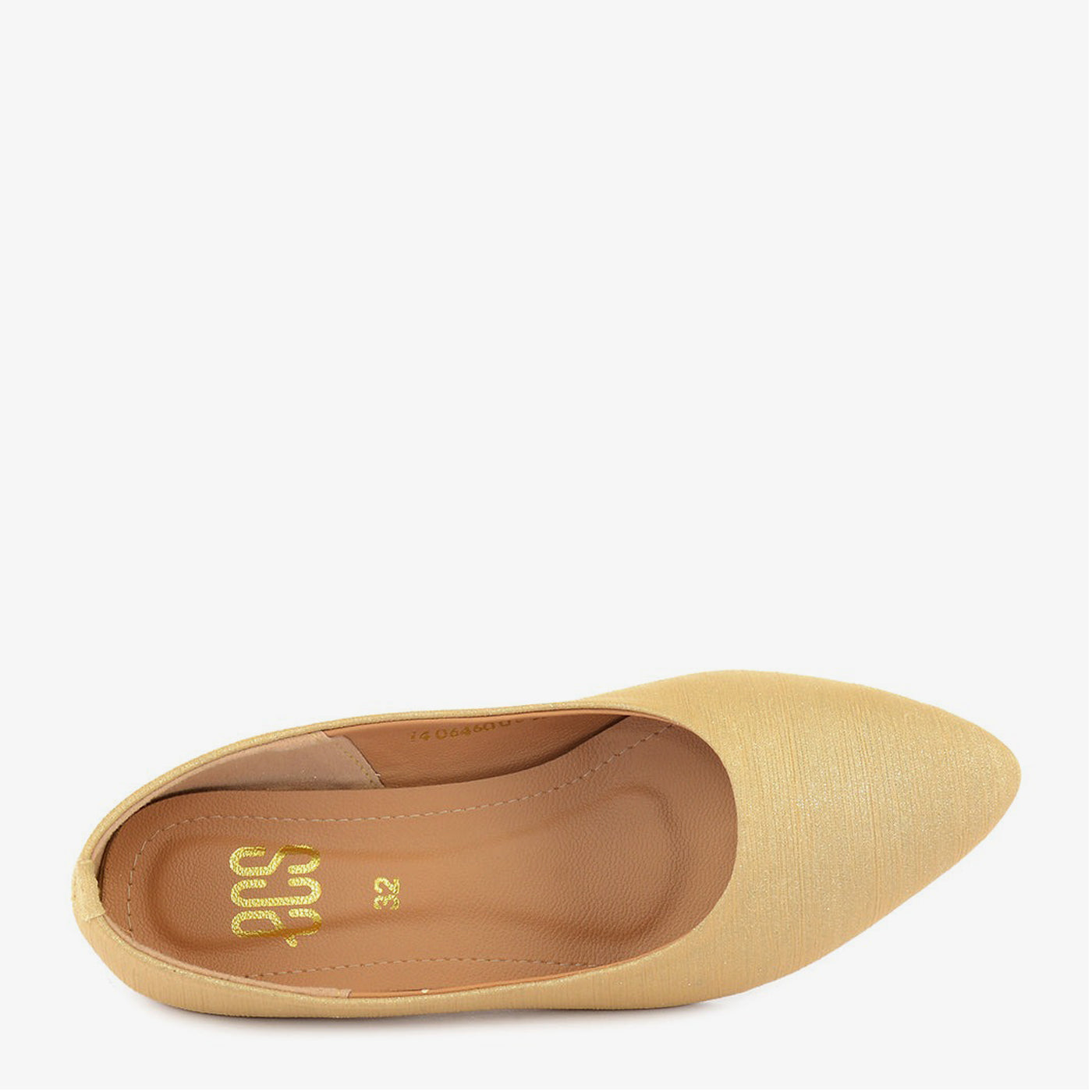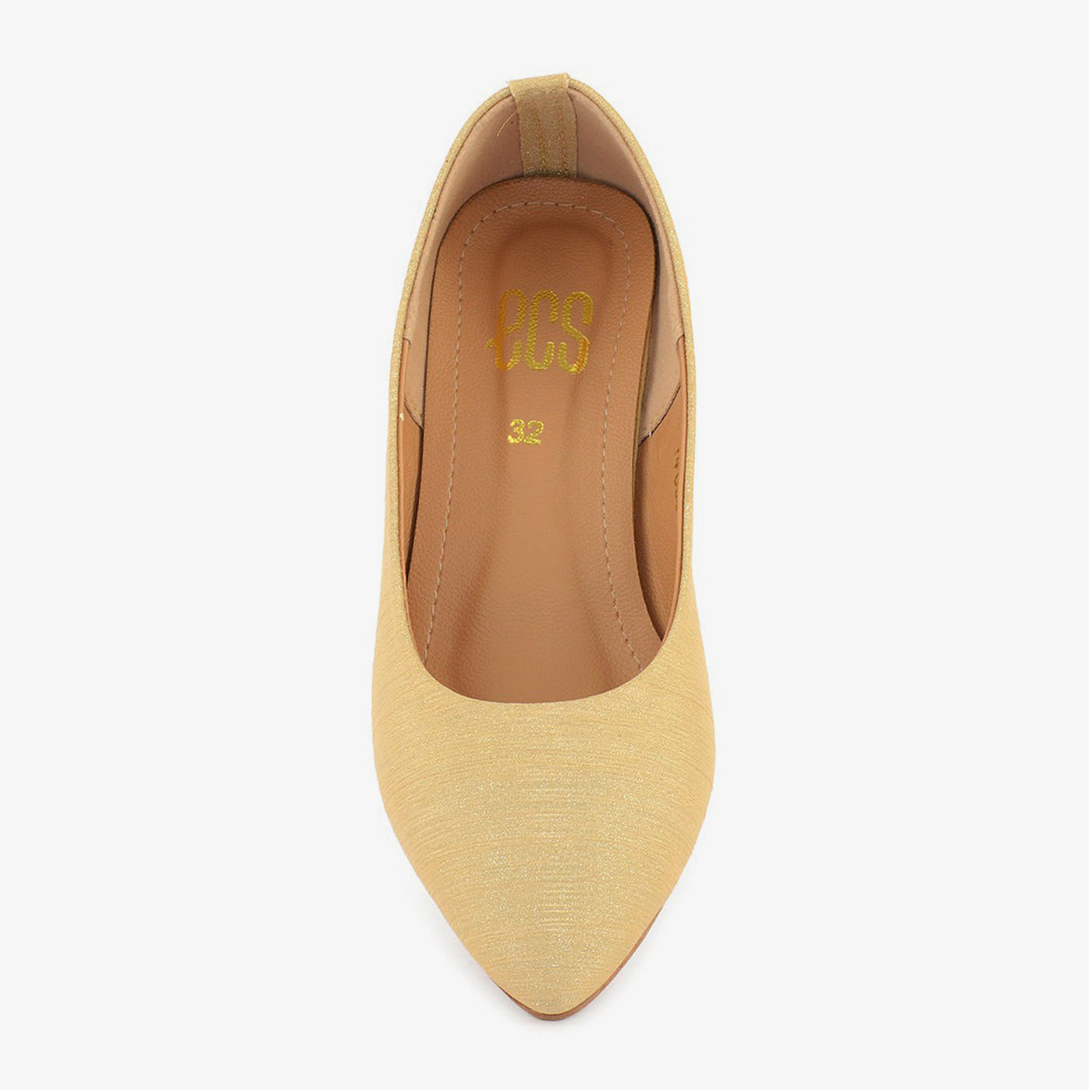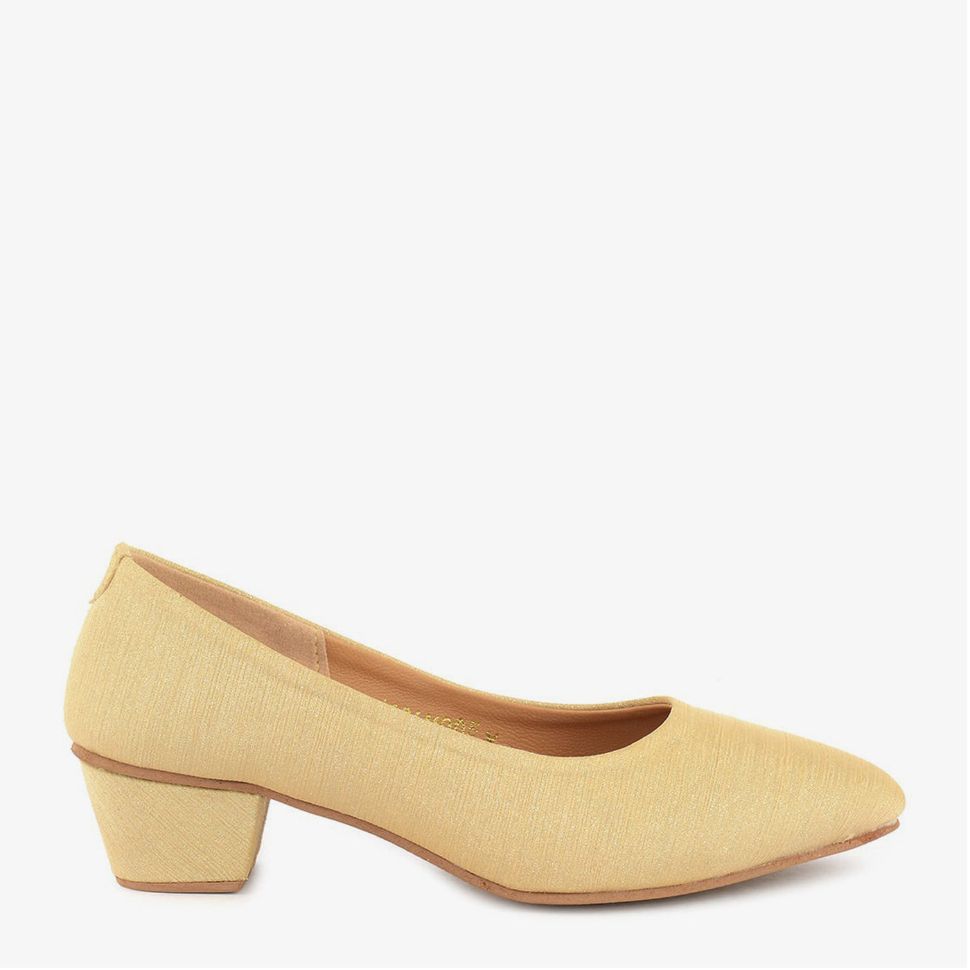 A refined pump in a soft, light gold fabric with a subtle shimmer. It has a pointed toe and a comfortable, low block heel, offering a touch of understated elegance.