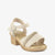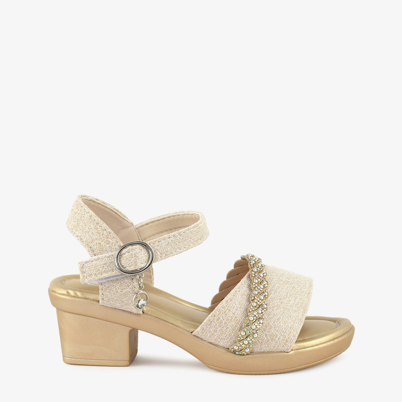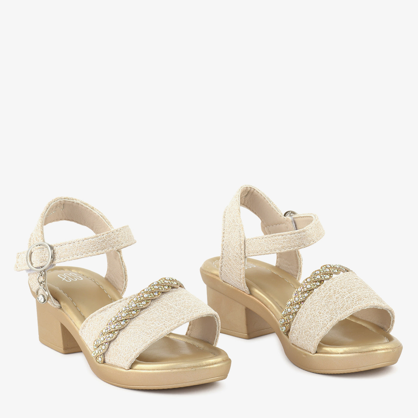 Step into refined elegance with these cream and gold heels. The textured straps, adorned with delicate braided detailing and subtle rhinestones, create a sophisticated and charming look. The low block heel offers a comfortable lift, perfect for special occasions around.