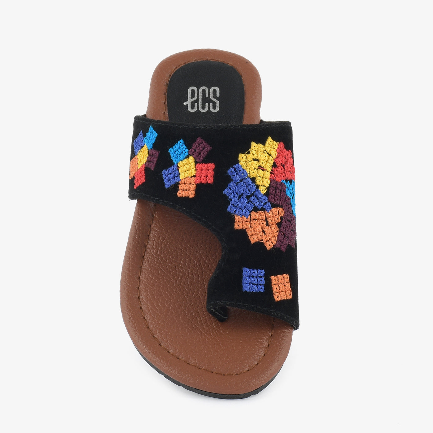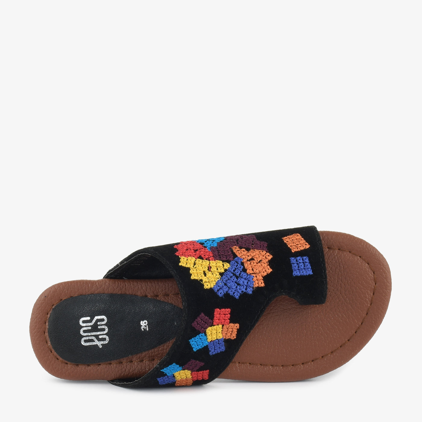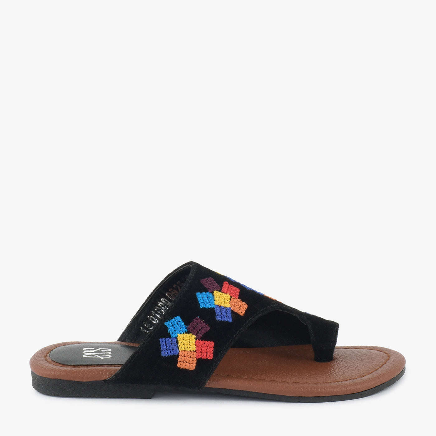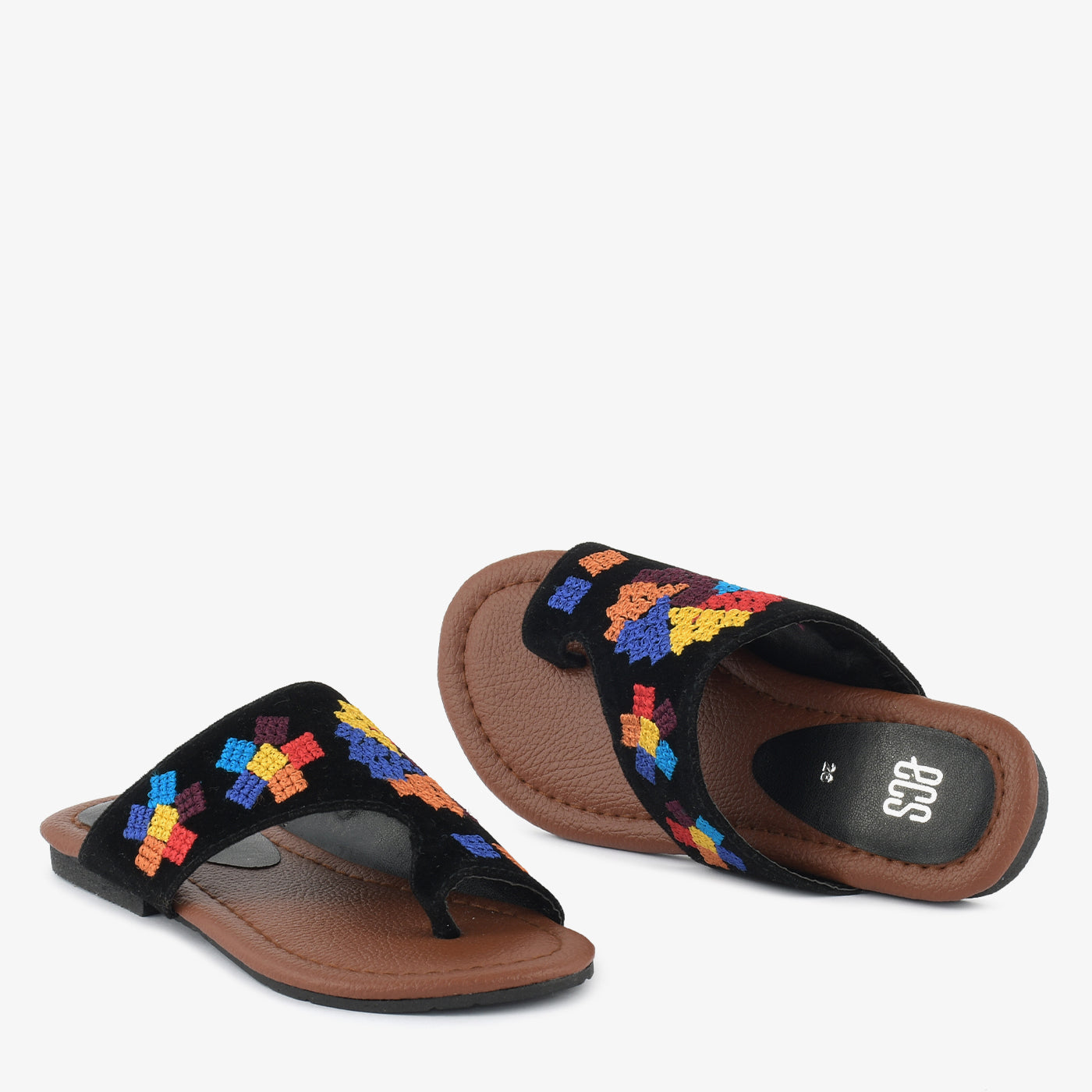 Step into distinctive style with these women's flat chappals. They feature a wide strap across the foot, adorned with an eye-catching geometric embroidered pattern, and include a toe post for comfort. The design is set on a comfortable flat sole.