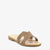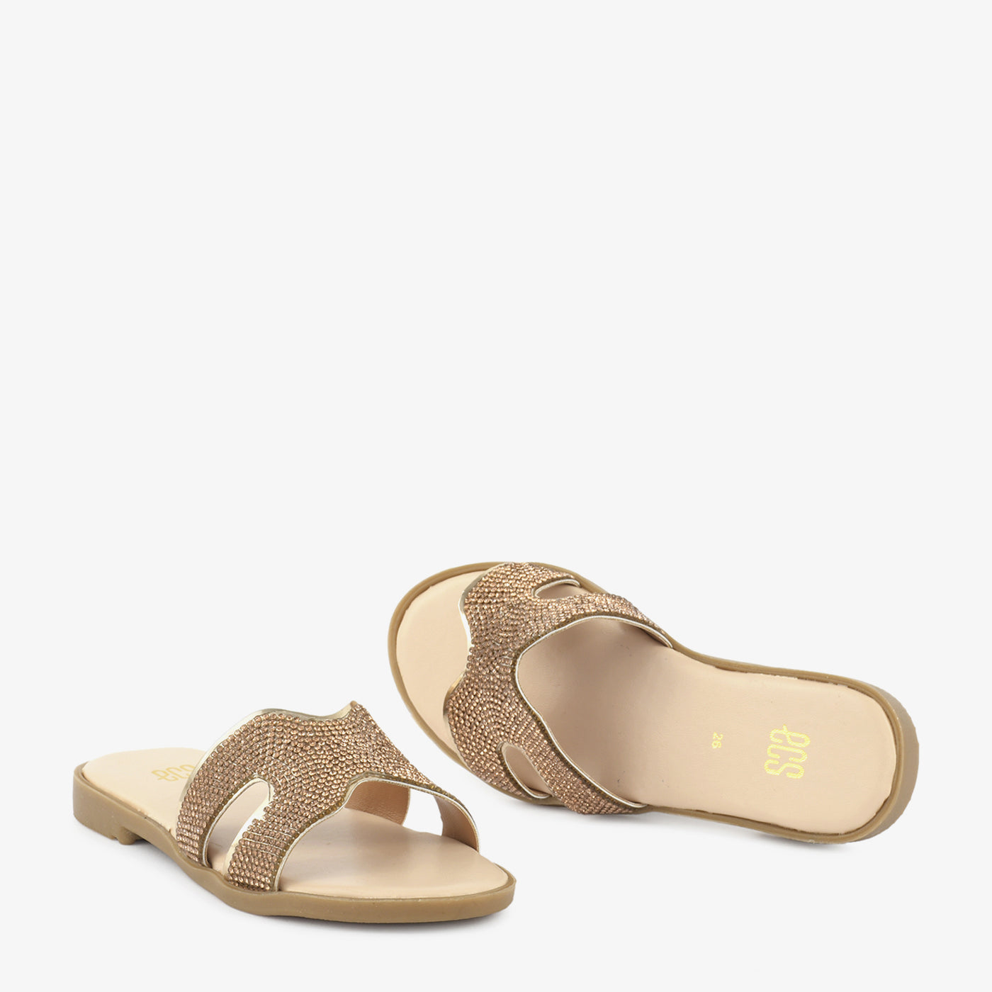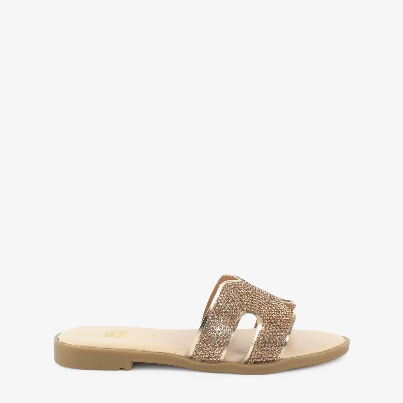Step into subtle opulence with these golden embellished slide slippers. The wide strap features a beautiful cascade of shimmering stones, adding a touch of refined glamour to your everyday style. The comfortable flat sole makes them perfect for warm days and casual outings.