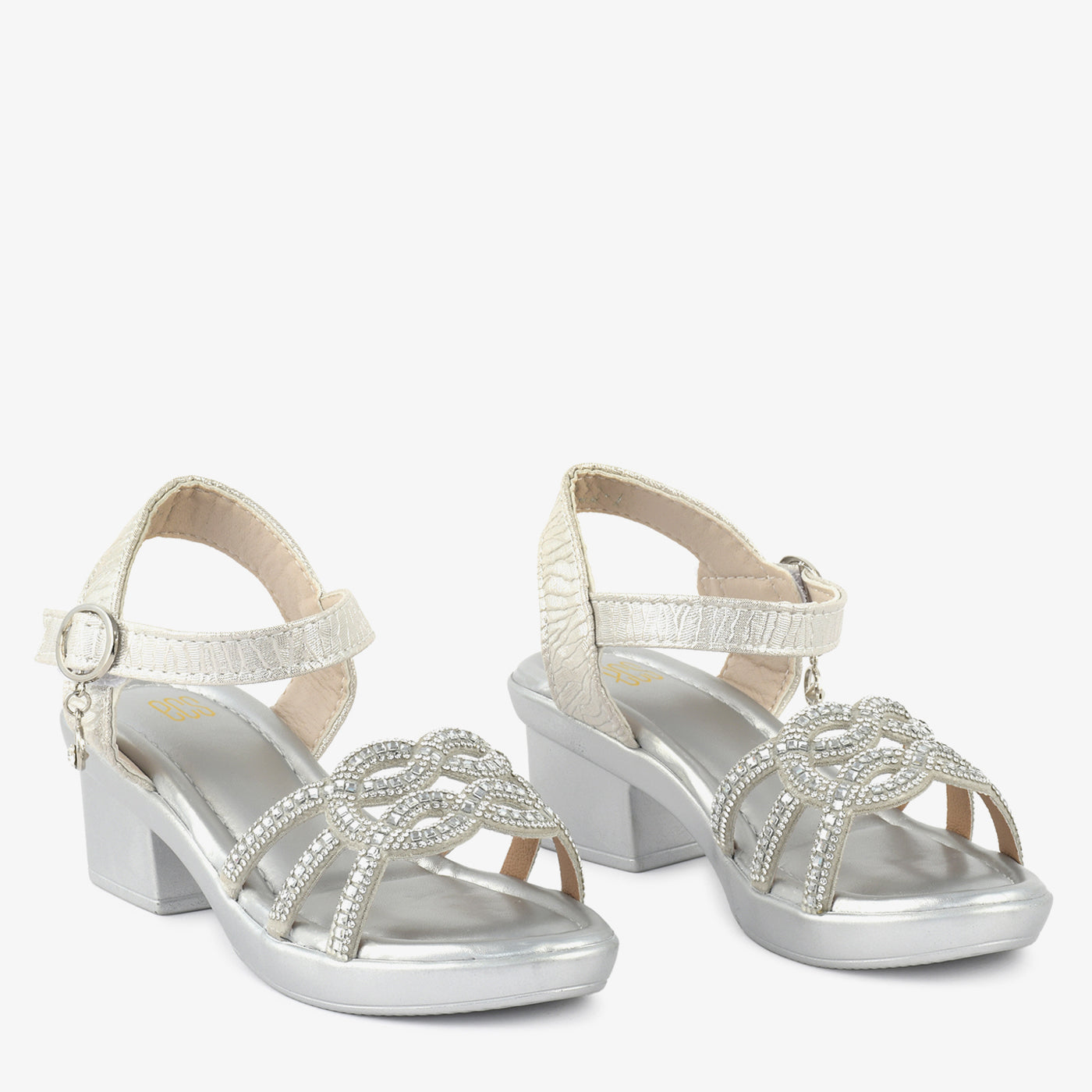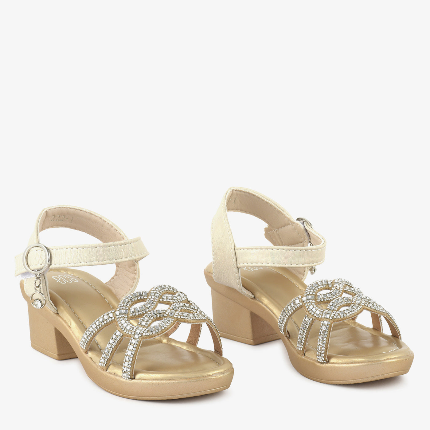 Step into dazzling elegance with the "Ivory Sparkle Knot Platforms." These stylish off-white platform sandals feature a comfortable low block heel and an intricate knot design adorned with shimmering crystals. Perfect for adding a touch of sophisticated sparkle to any festive occasion in Lahore.