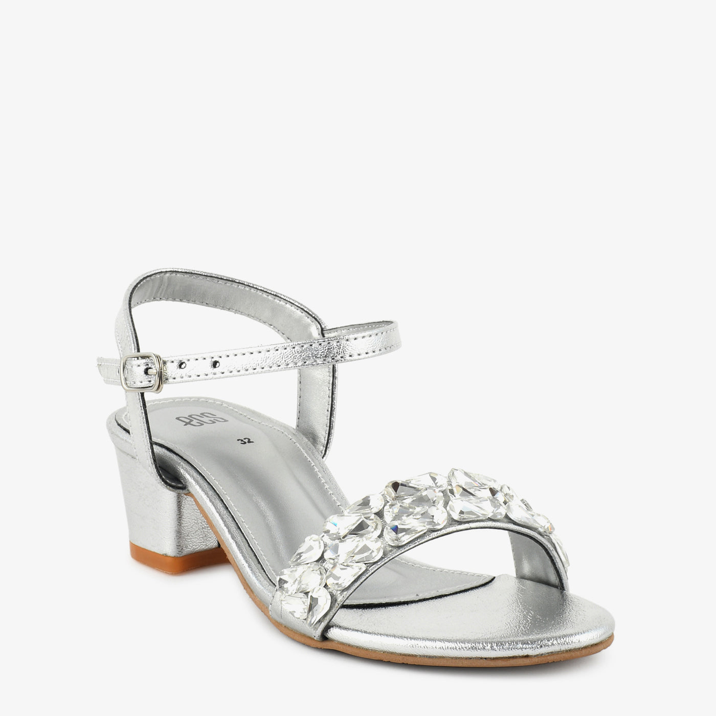 This elegant kids’ party sandal features a beautifully cushioned base designed for comfort during special occasions. The front strap is adorned with clear crystal embellishments that add a refined sparkle...