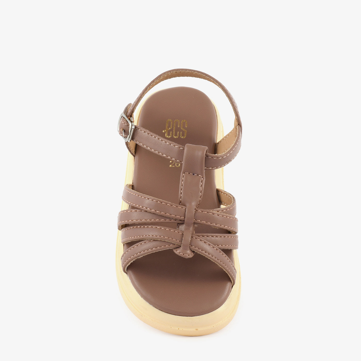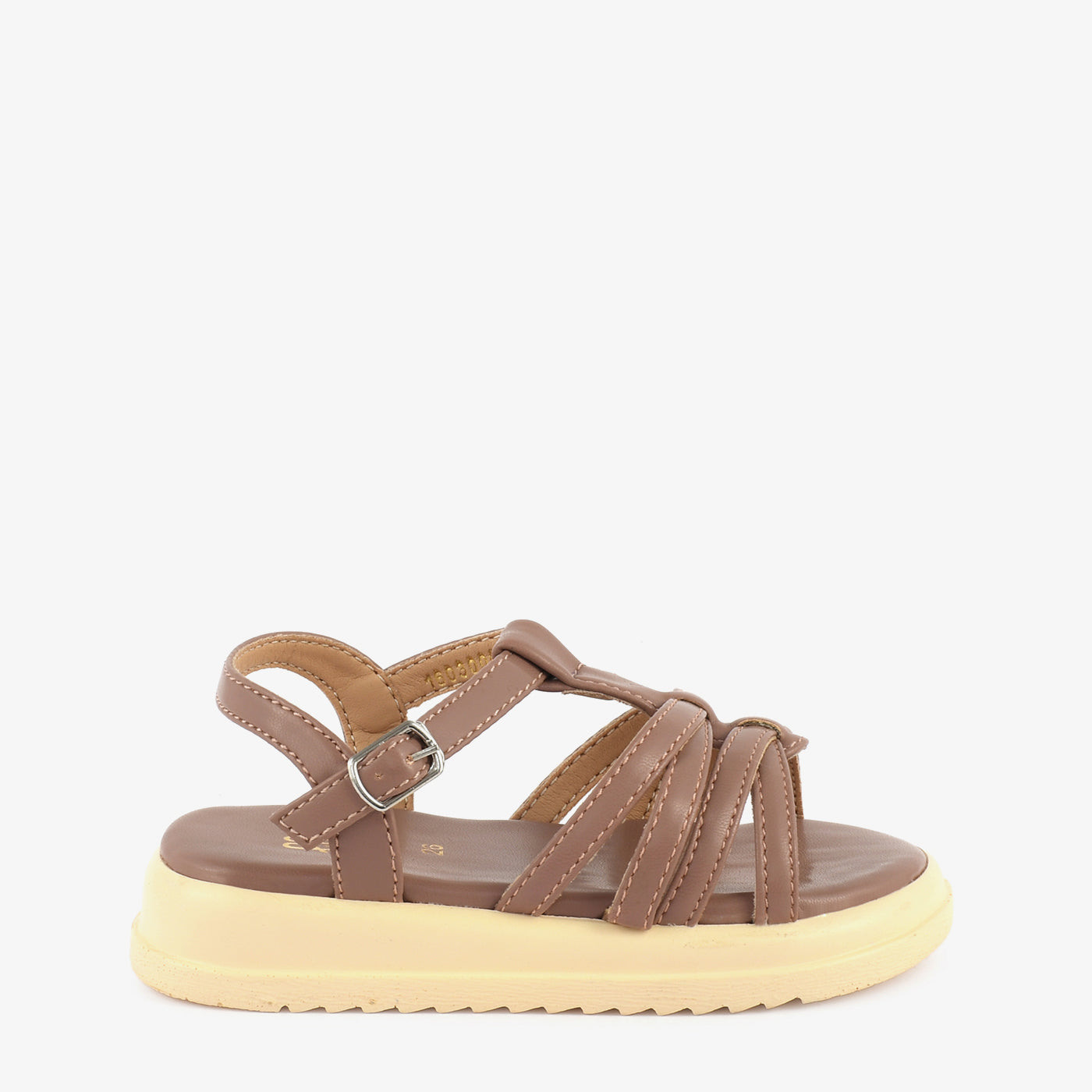 Sturdy and practical, this kids sandal features a smooth cushioned footbed with a chunky lightweight EVA sole that provides superior comfort and support throughout the day. Multiple slim straps weave across the open vamp and gather into a structured knot at the centre, creating a neat and distinctive arrangement. A slim ankle strap with a small silver buckle fastening ensures a secure and adjustable fit for casual outings, school wear, and active everyday use.
