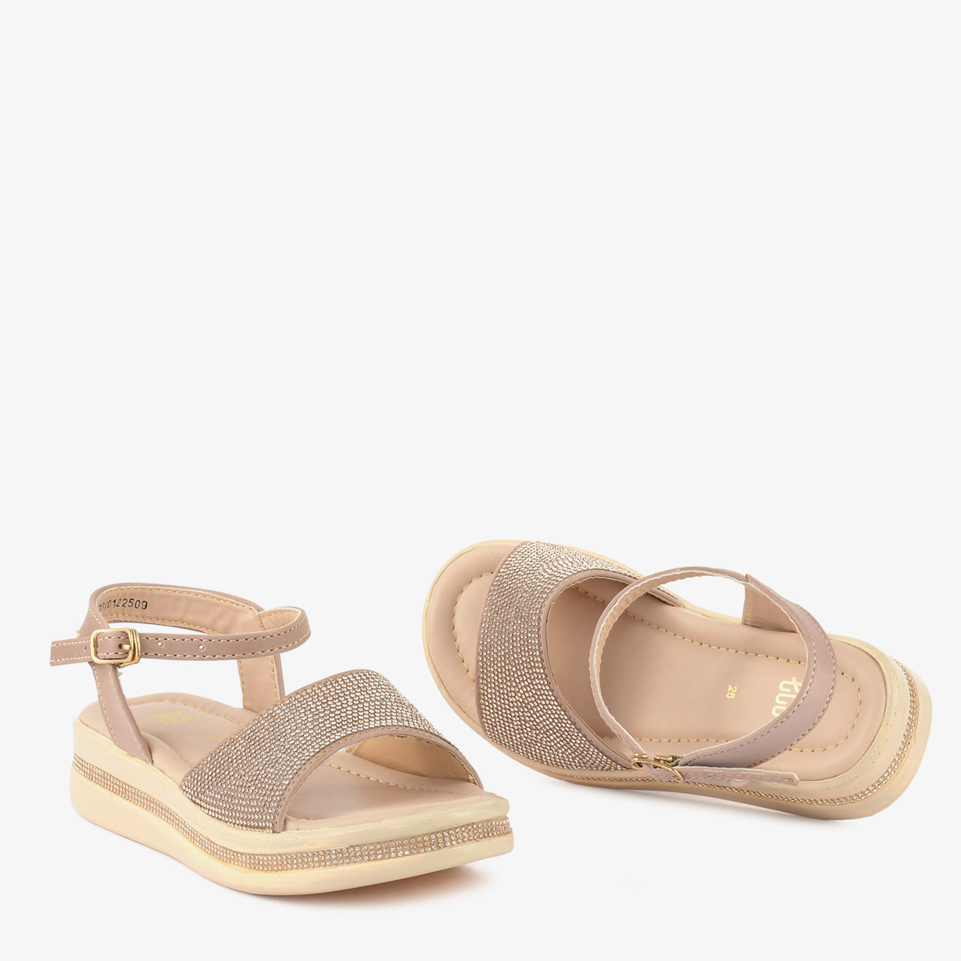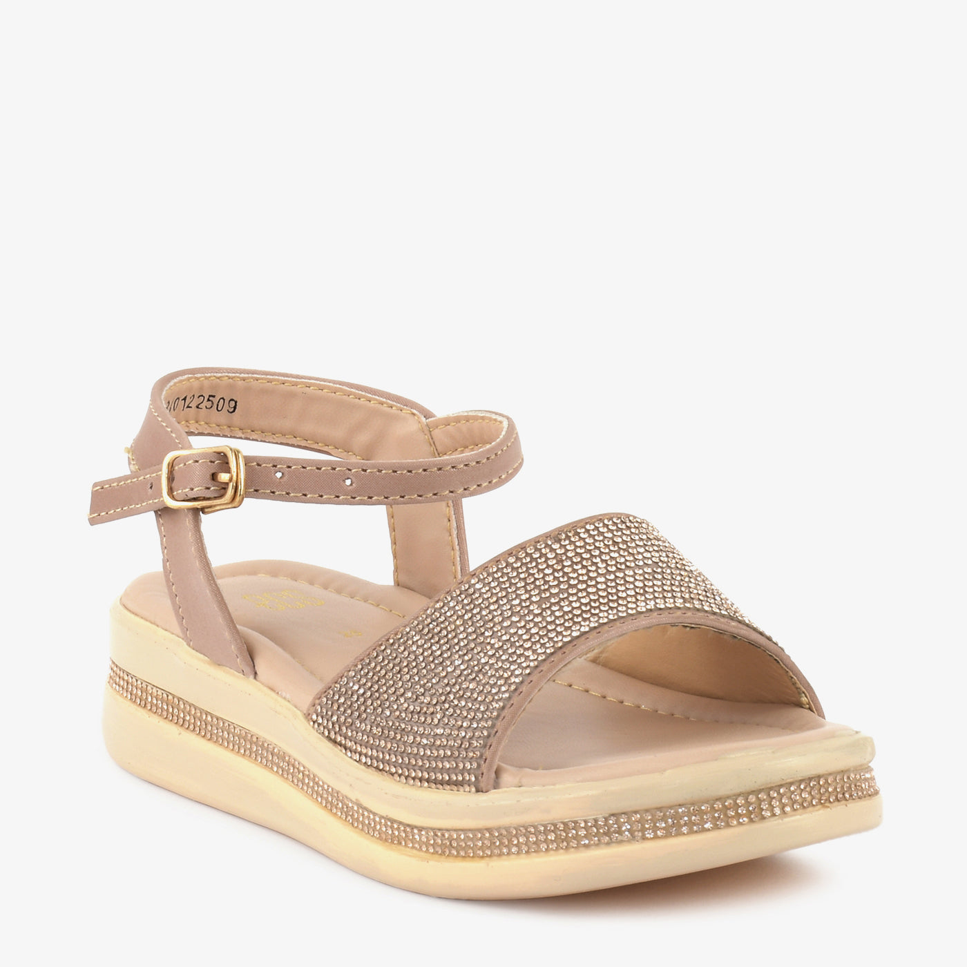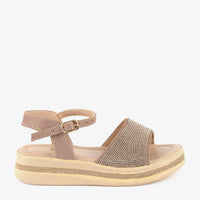Step into subtle glamour with the "Sparkle Step Platforms." These stylish peach platform sandals feature a comfortable low wedge and a wide strap adorned with shimmering embellishments. Perfect for adding a touch of understated sparkle to your everyday style.