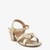 Charming and occasion-ready, this low block heel open-toe kids sandal features a smooth gold shimmer leather-finish cushioned footbed with a structured low block heel that provides gentle elevation and comfort throughout the day. Two slim crossover straps meet at the centre front with a structured crystal rhinestone encrusted bow detail, creating a sparkling and refined focal point, secured at the ankle with a slim adjustable gold buckle clasp. The adjustable ankle buckle construction ensures a comfortable and secure fit for weddings, festive gatherings, and smart occasion wear.