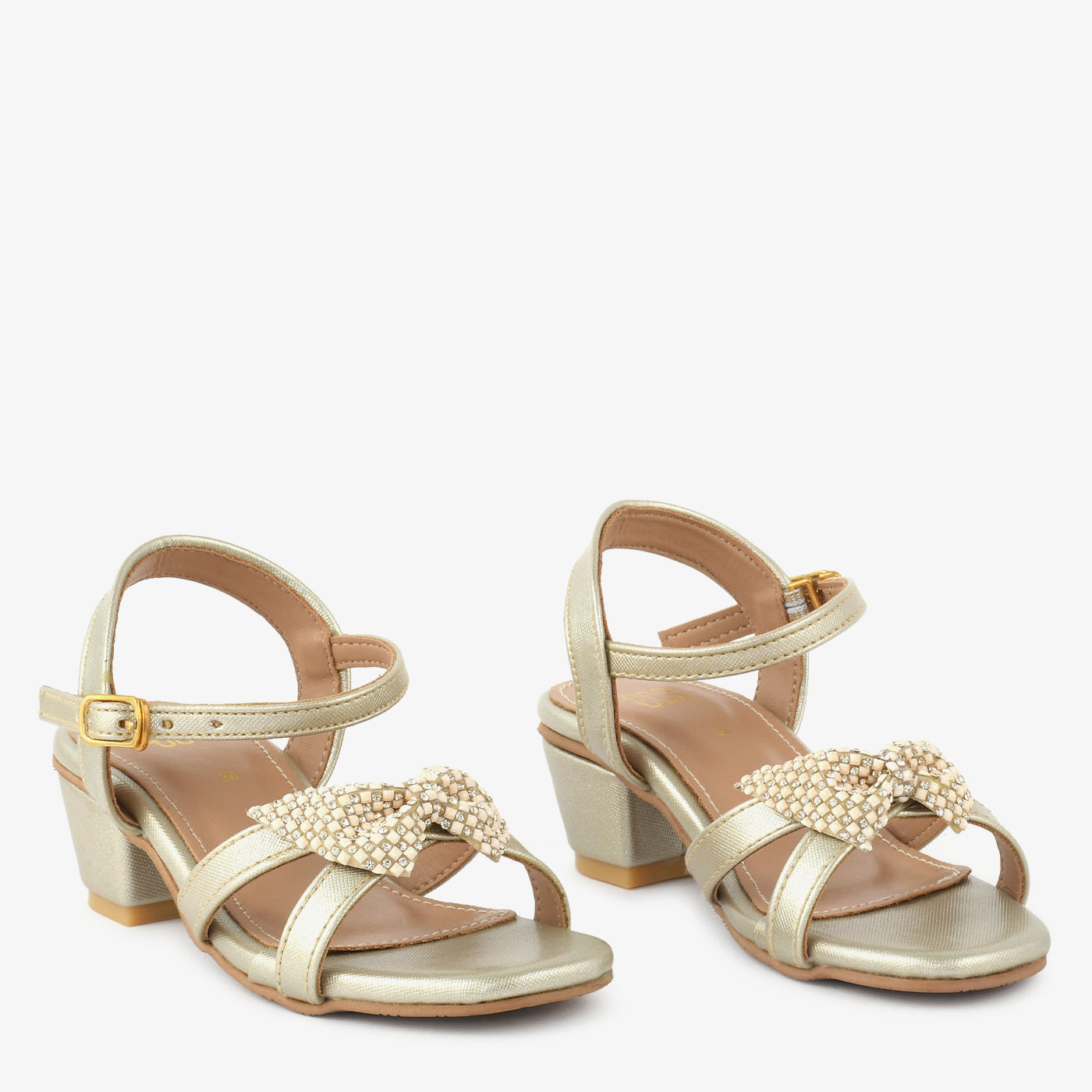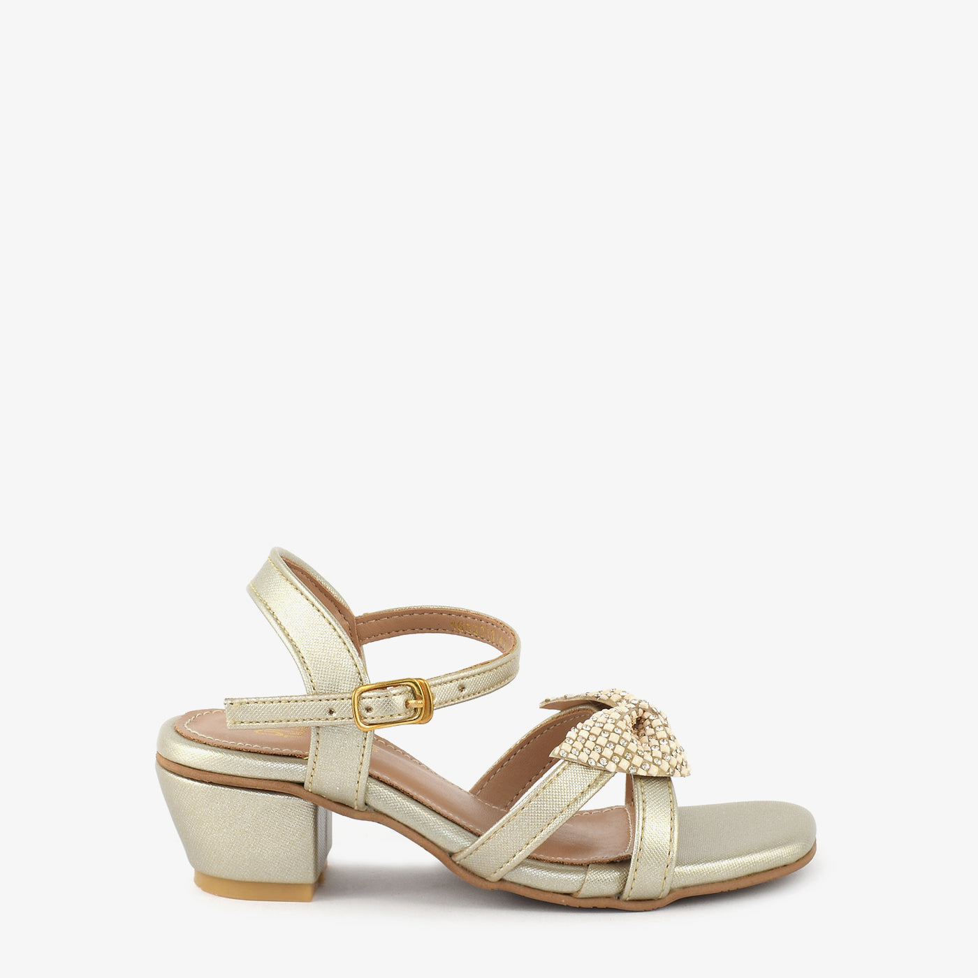 • Design: Low block heel open-toe kids sandal with crystal bow front and adjustable gold ankle buckle