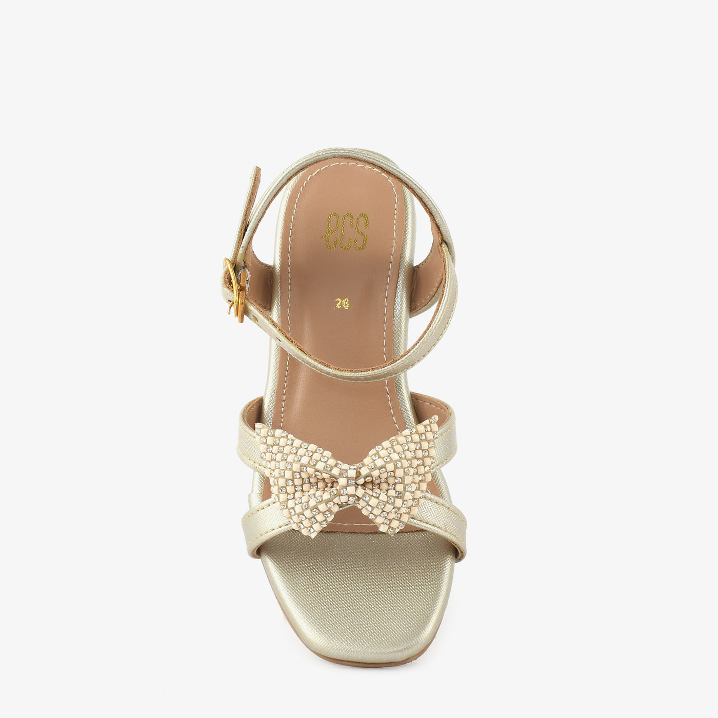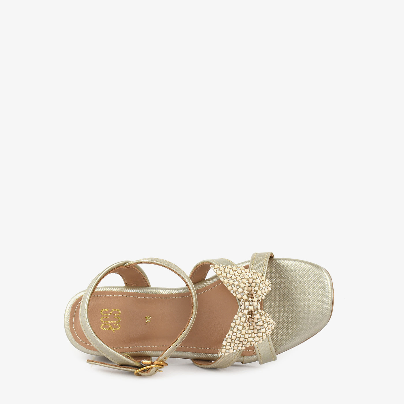 • Material: Gold shimmer leather-finish crossover straps with crystal rhinestone bow centre and cushioned footbed