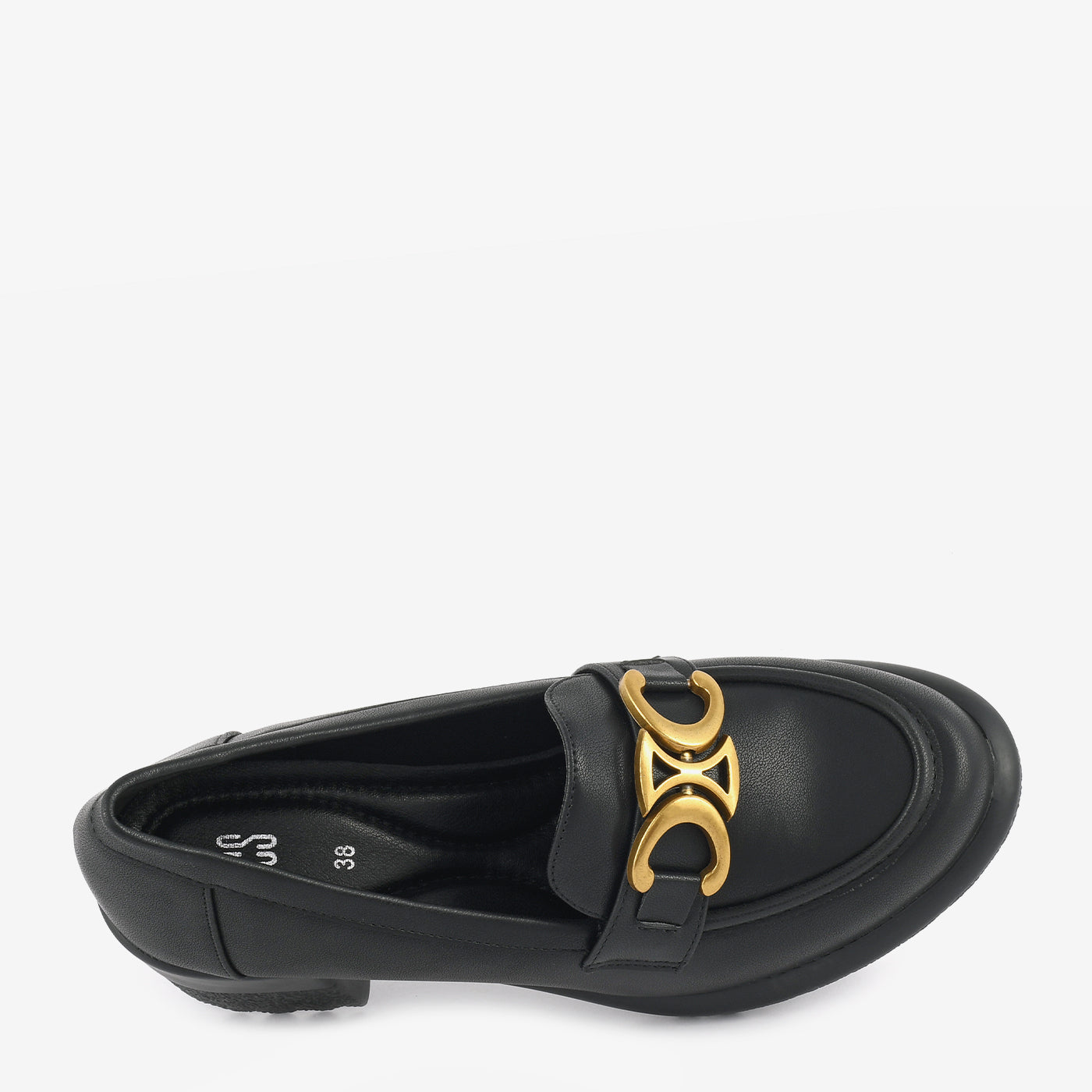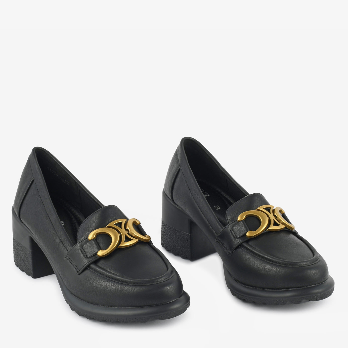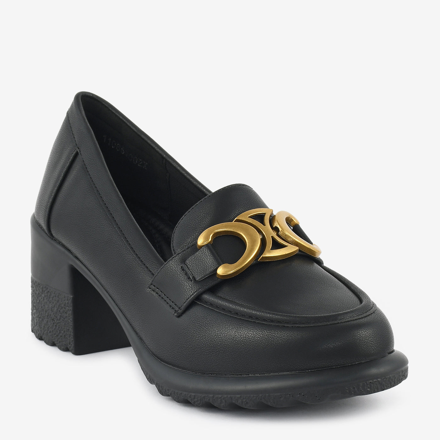 A refined block-heel loafer designed with a statement metallic ornament for a touch of edge. Its structured shape and cushioned base provide all-day comfort without compromising on elegance. Ideal for office wear or polished casual looks.