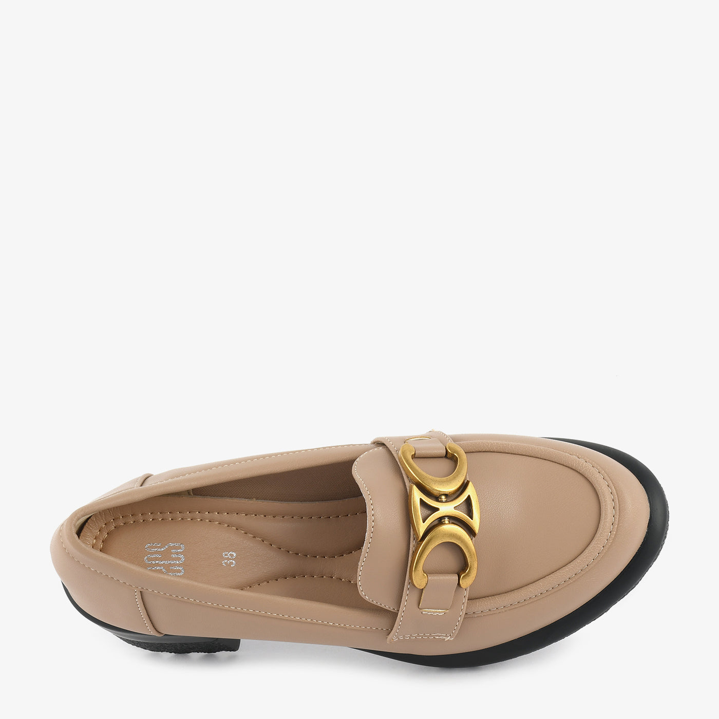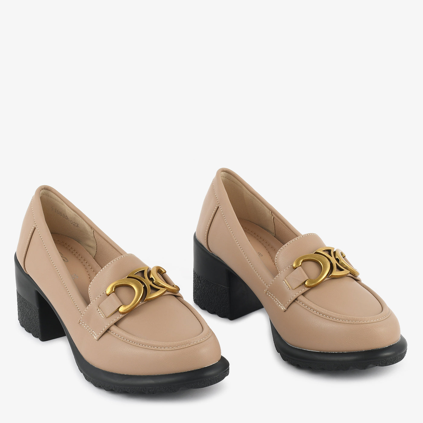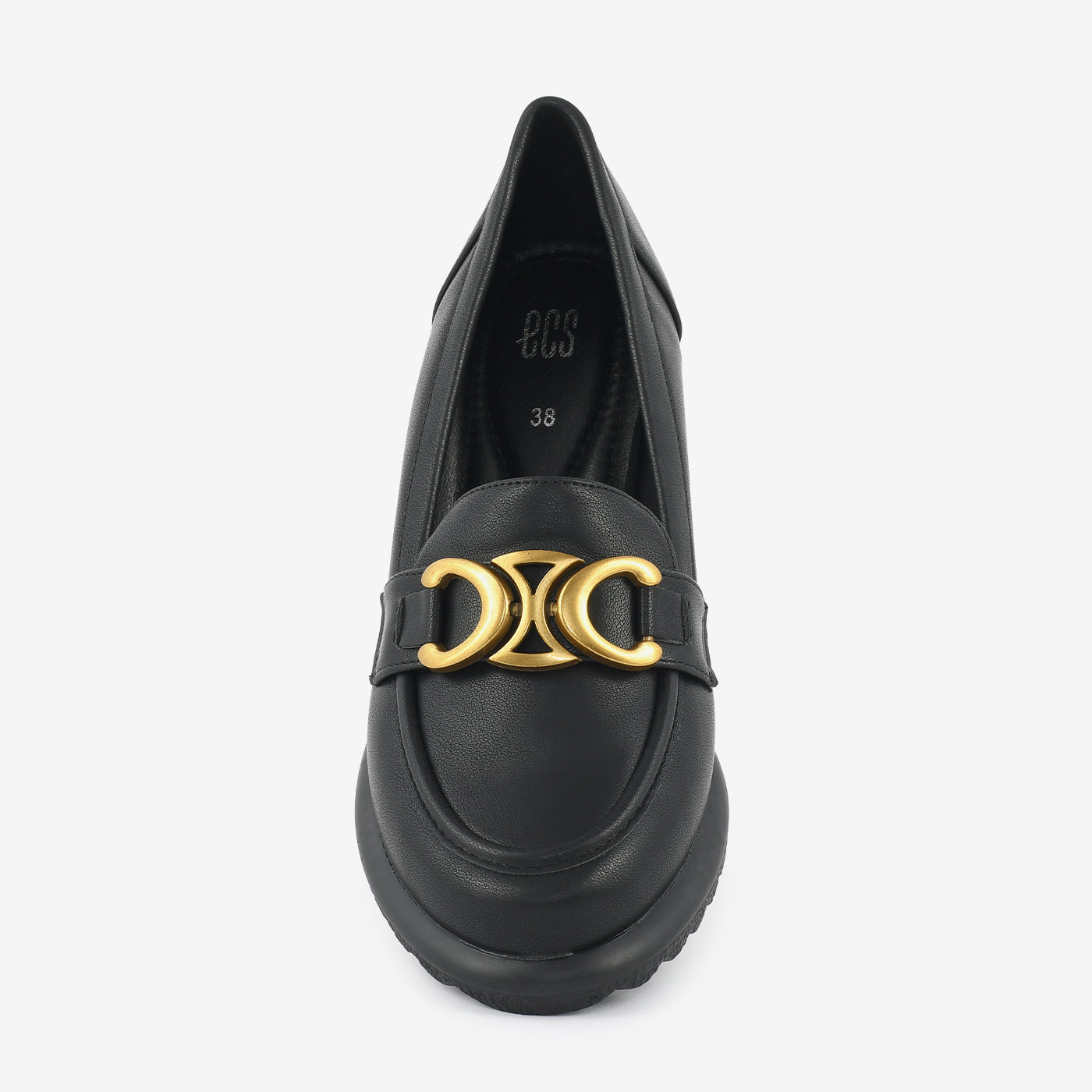 A refined block-heel loafer designed with a statement metallic ornament for a touch of edge. Its structured shape and cushioned base provide all-day comfort without compromising on elegance. Ideal for office wear or polished casual looks.