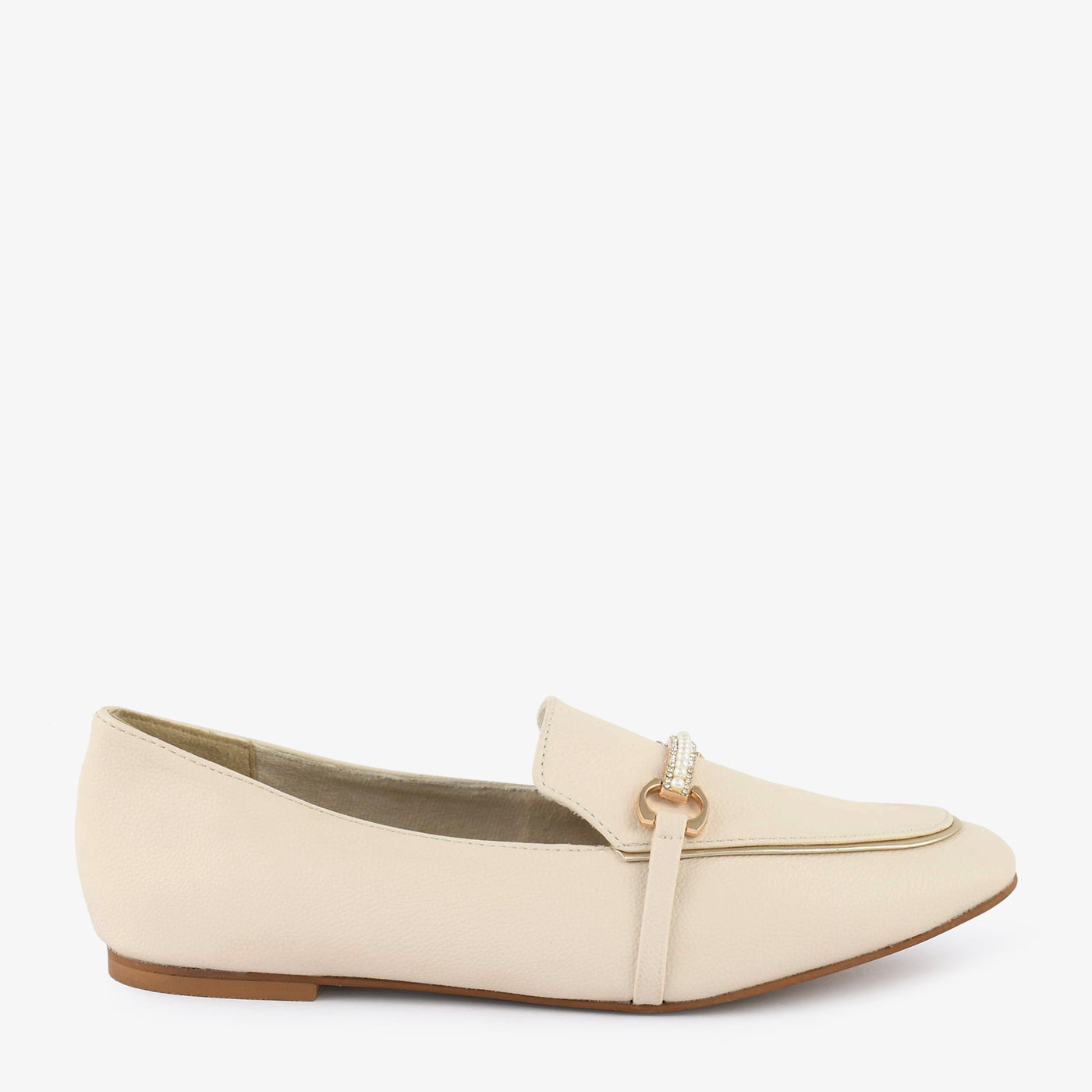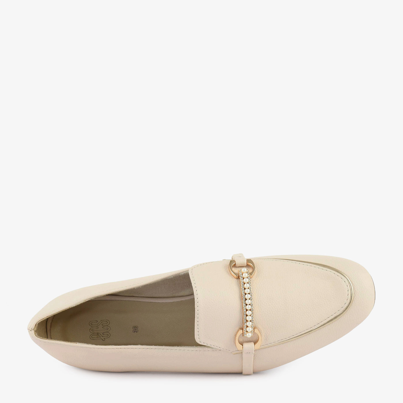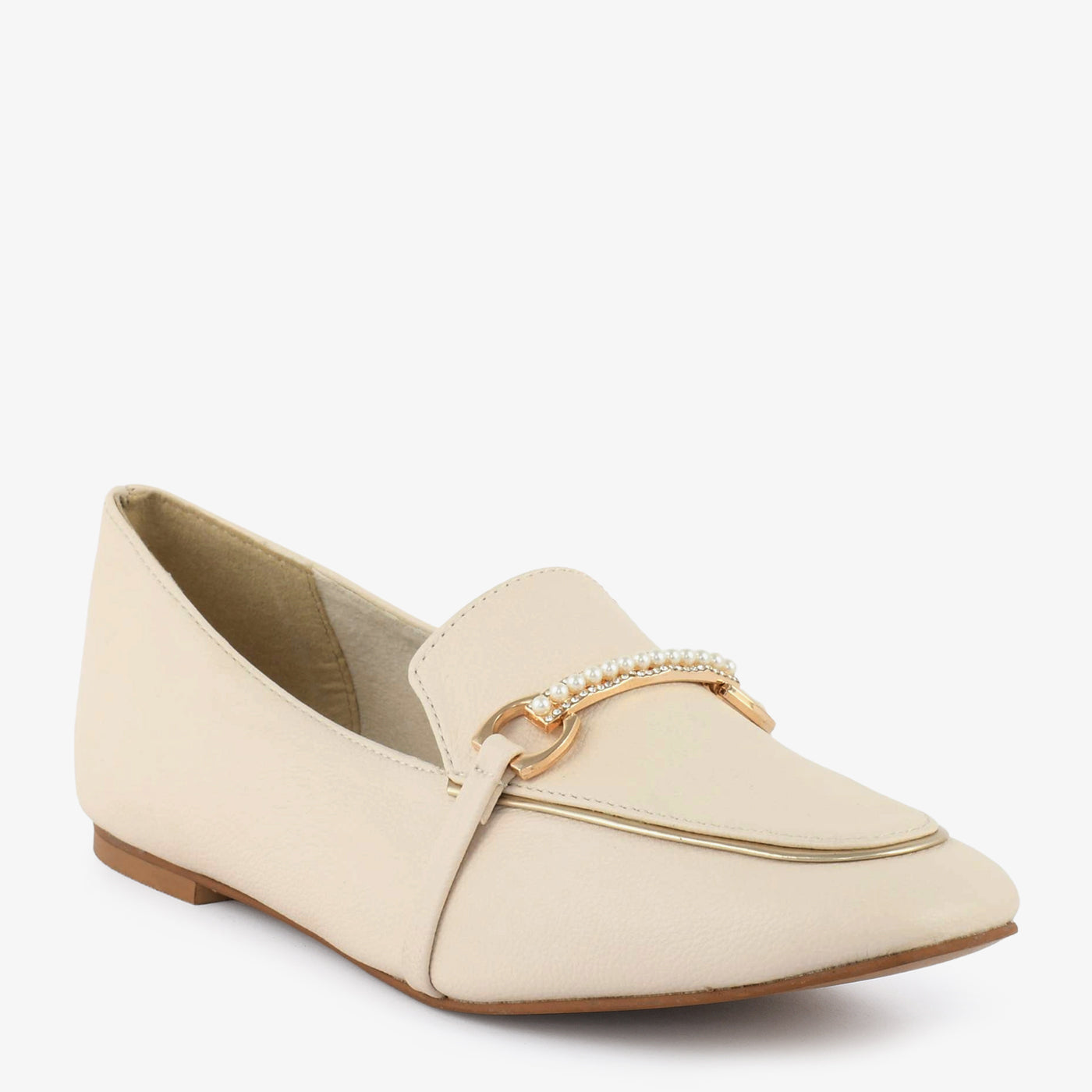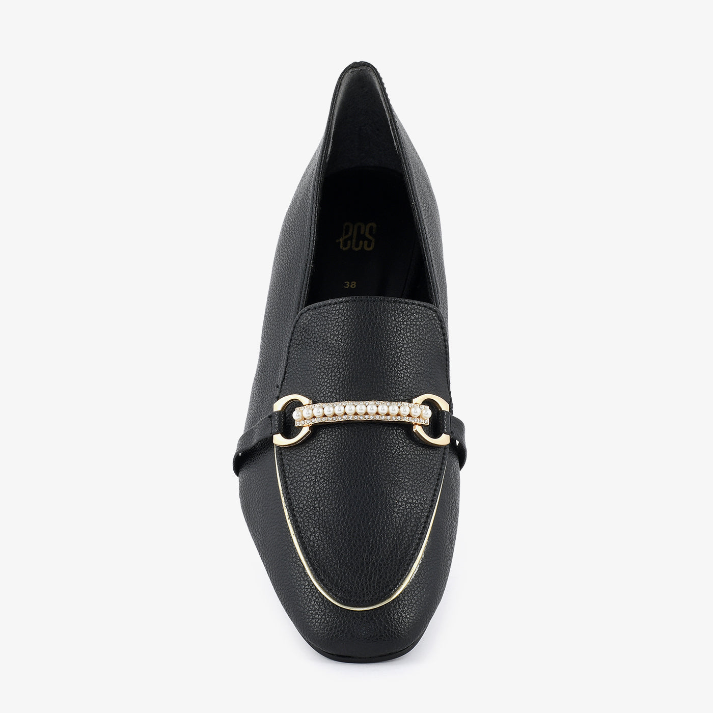 This elegant loafer combines a refined silhouette with a lustrous pearl buckle detail. Its smooth exterior and padded interior promise both sophistication and comfort. Ideal for office wear or evening outings, it complements both western and ethnic styles effortlessly.