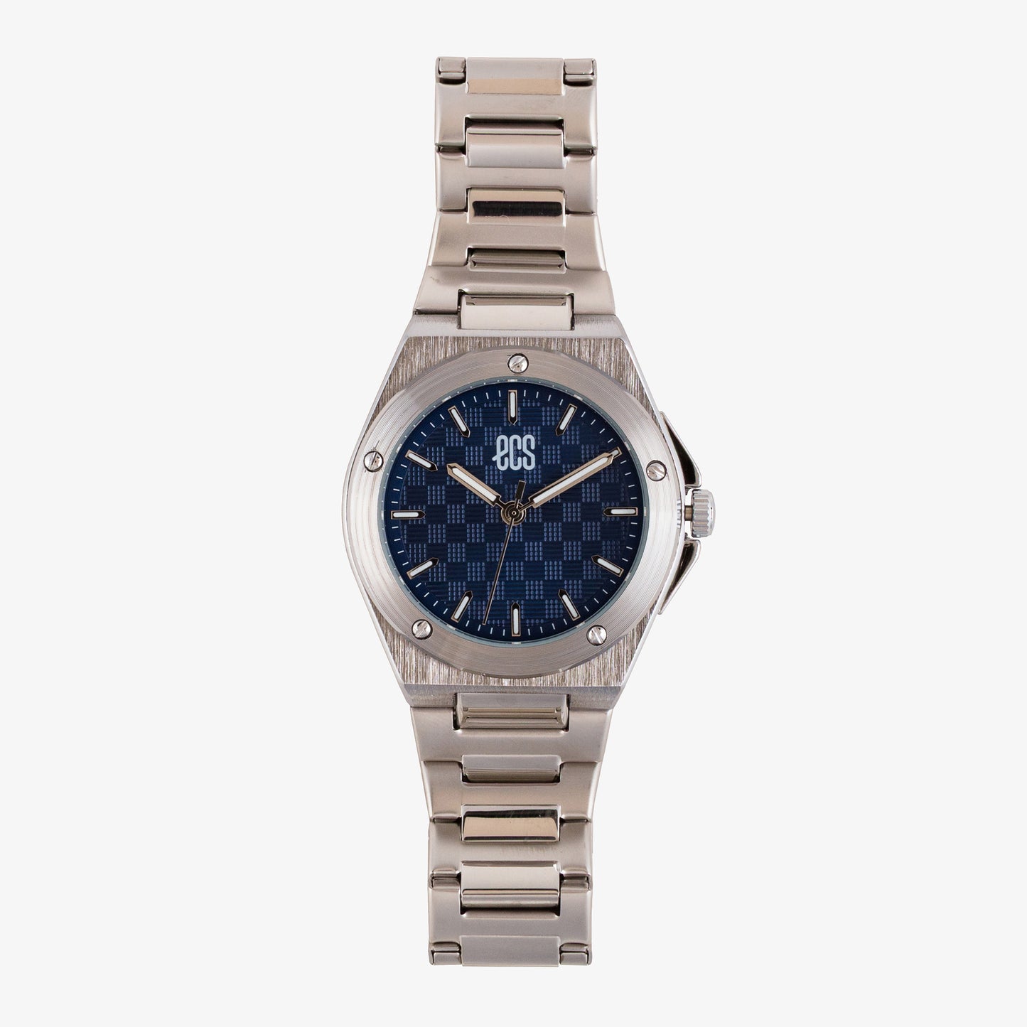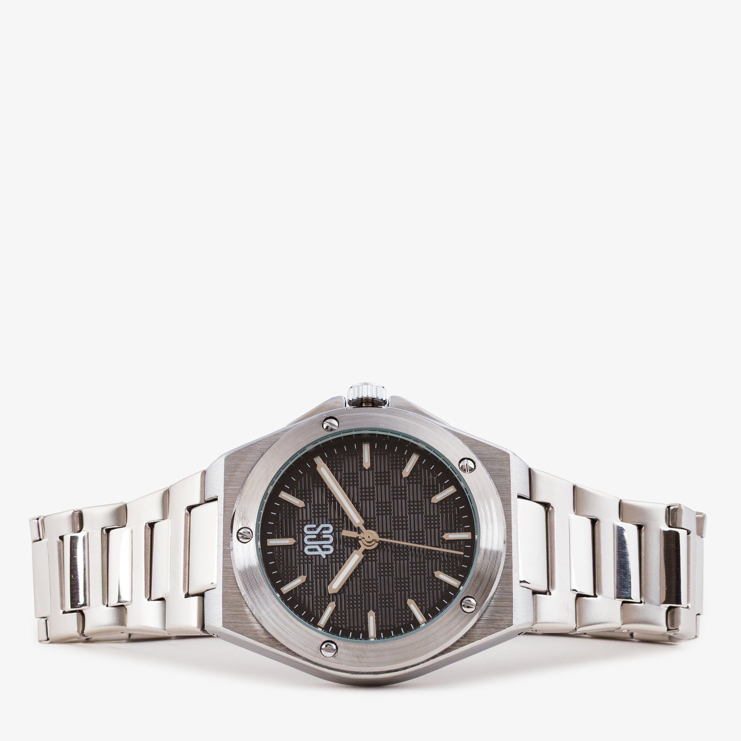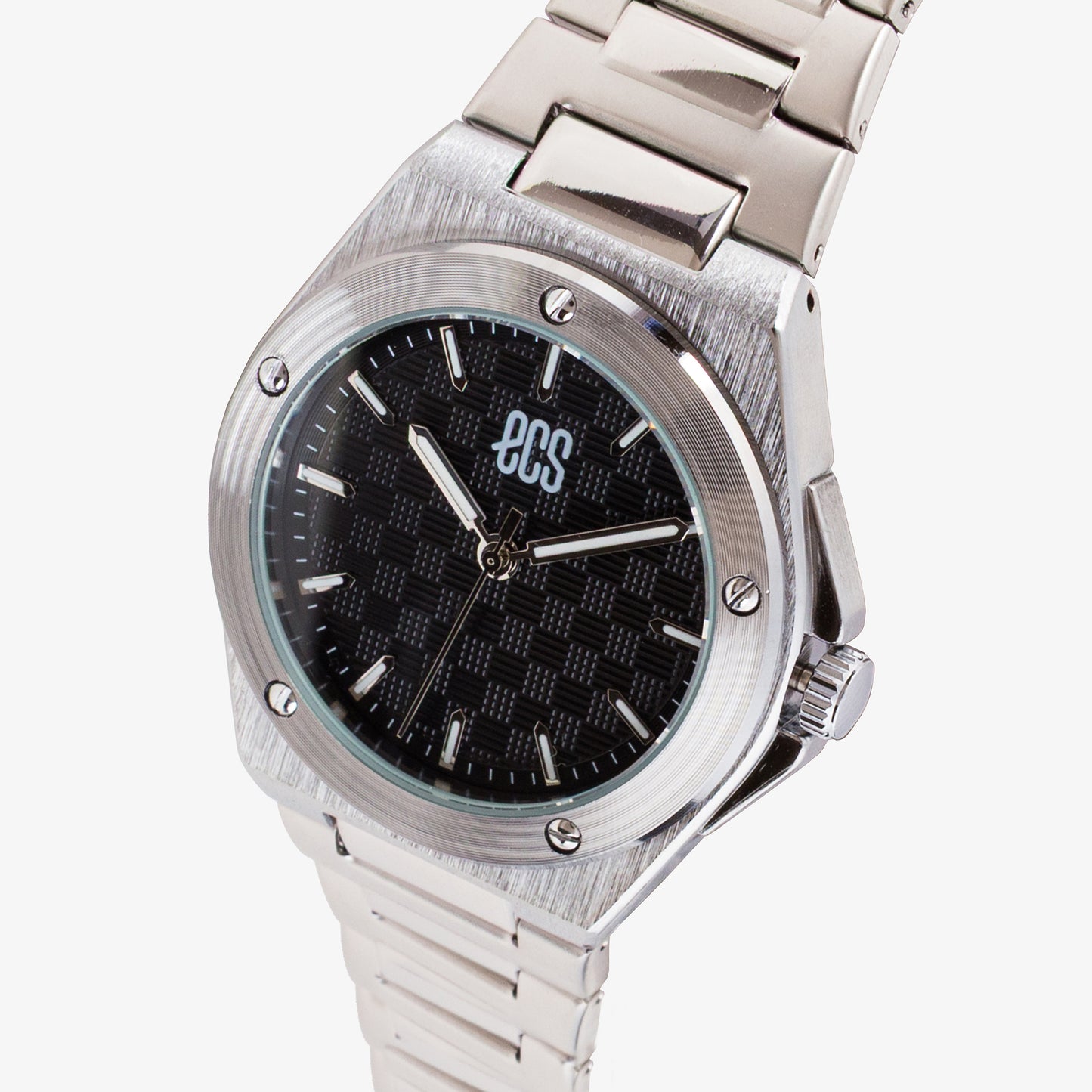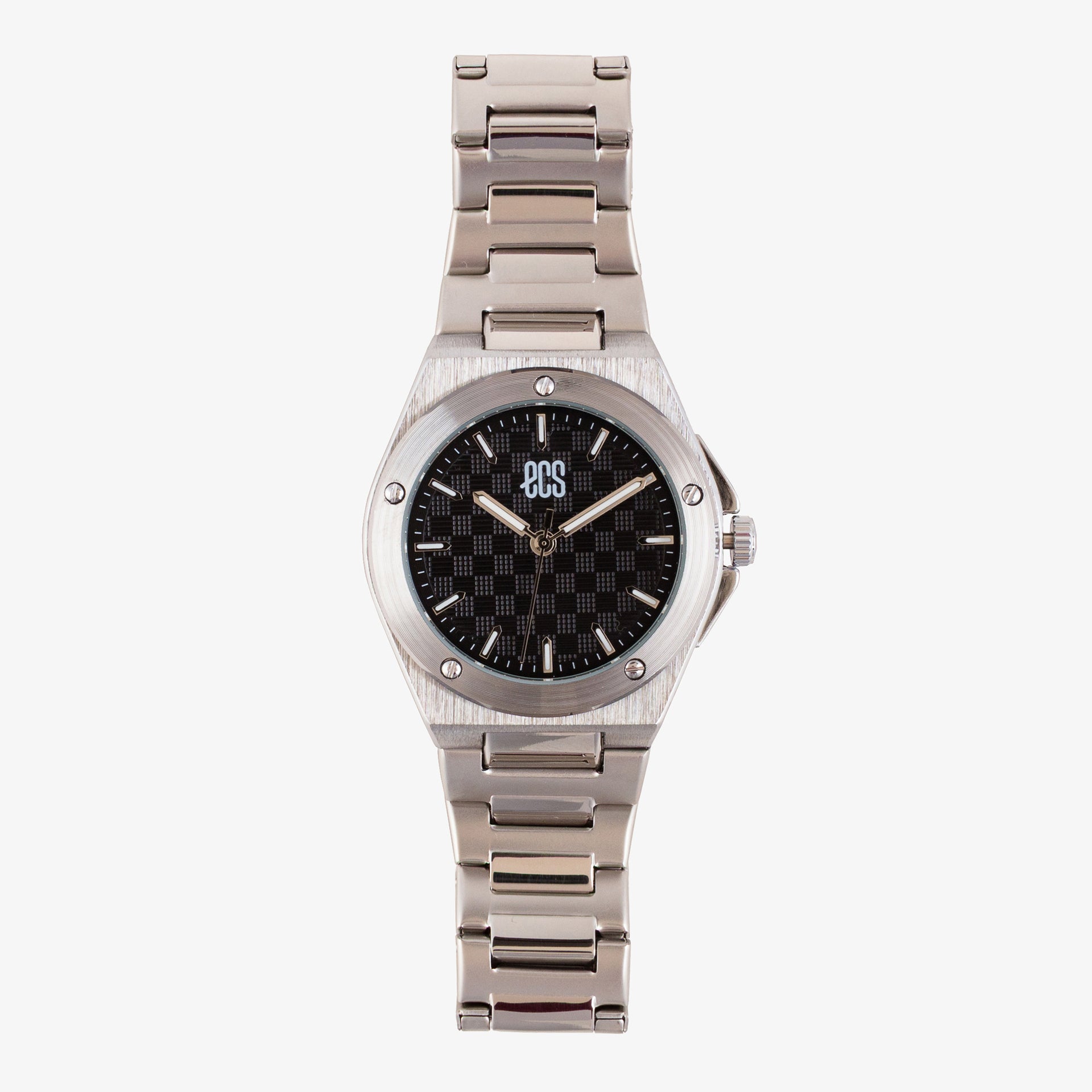 A bold yet classic wristwatch with a round black dial housed in a polished alloy case. The grooved bezel and silver metallic strap add an upscale touch, perfect for daily sophistication.