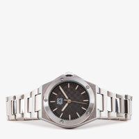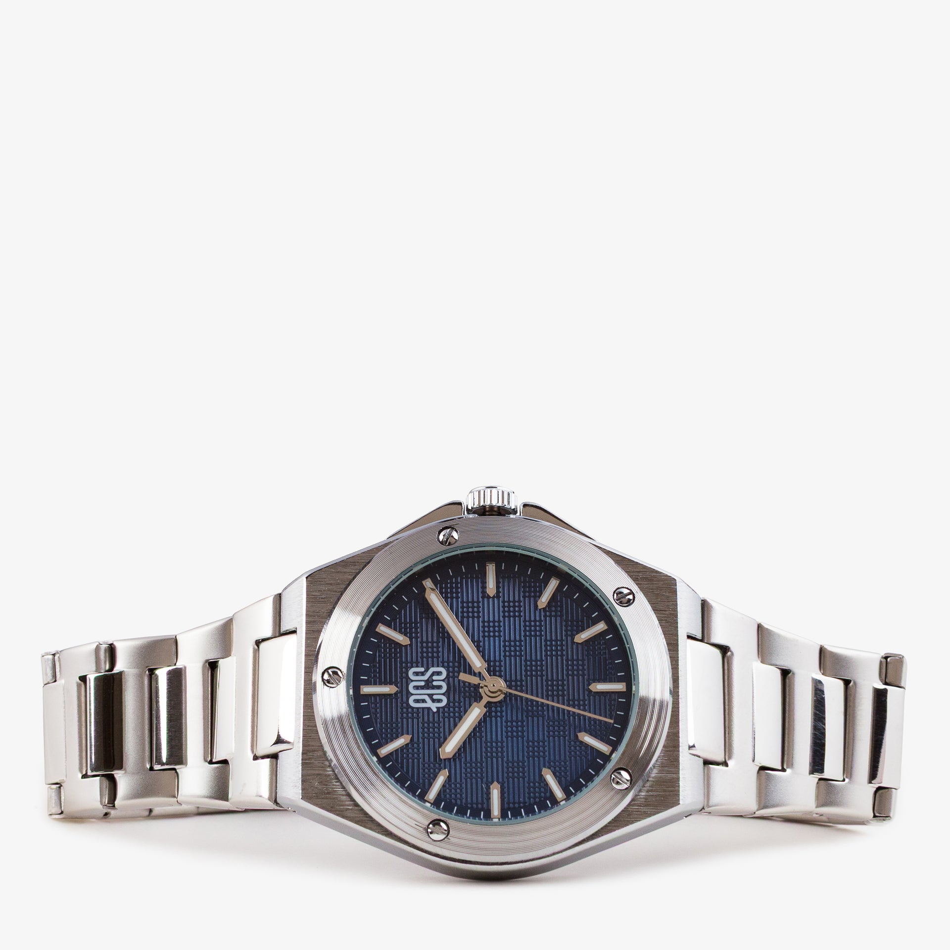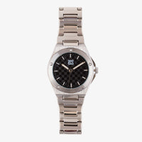 A bold yet classic wristwatch with a round black dial housed in a polished alloy case. The grooved bezel and silver metallic strap add an upscale touch, perfect...
