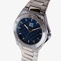 A bold yet classic wristwatch with a round black dial housed in a polished alloy case. The grooved bezel and silver metallic strap add an upscale touch, perfect...