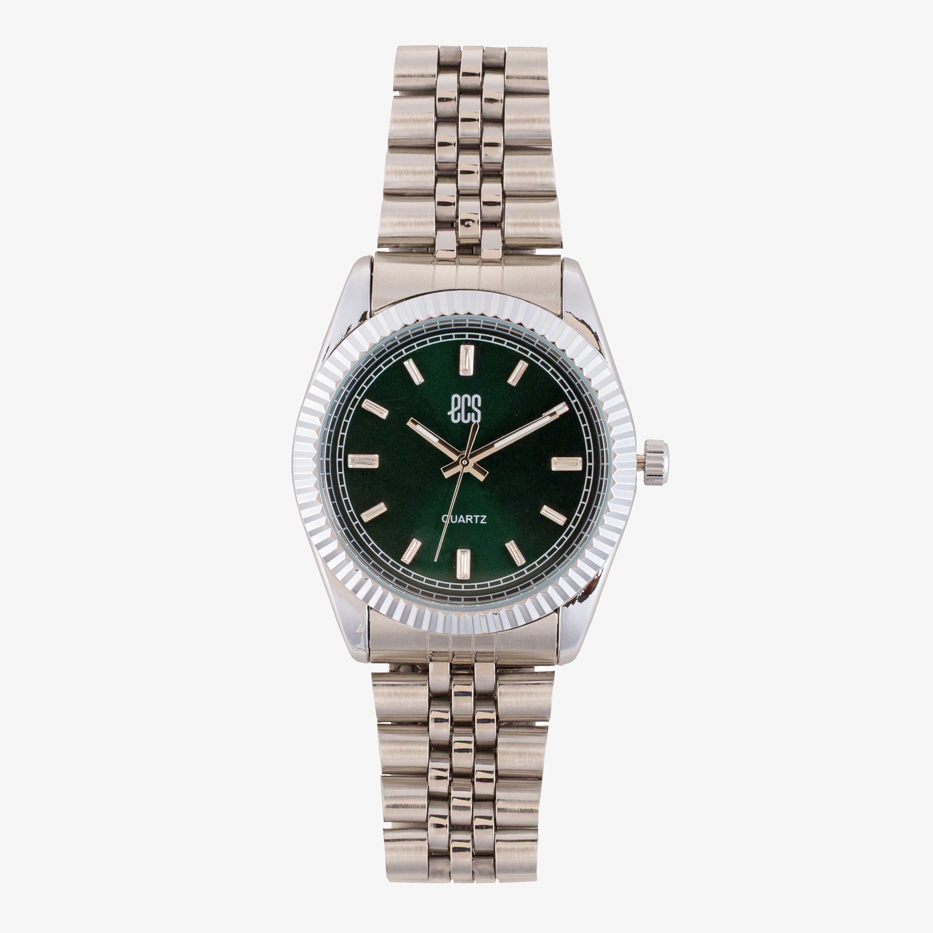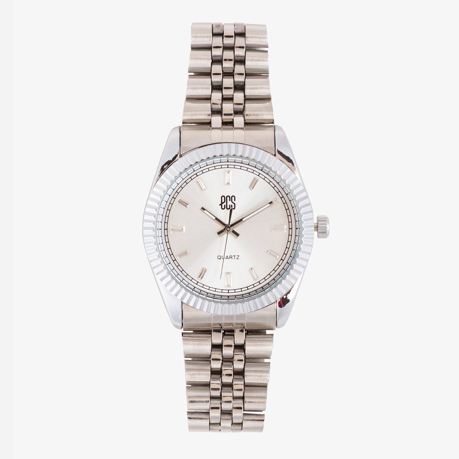 This elegant timepiece features a sleek round dial set in a polished alloy case with a ribbed bezel. The minimal index markers and bold hands ensure easy readability for daily wear.