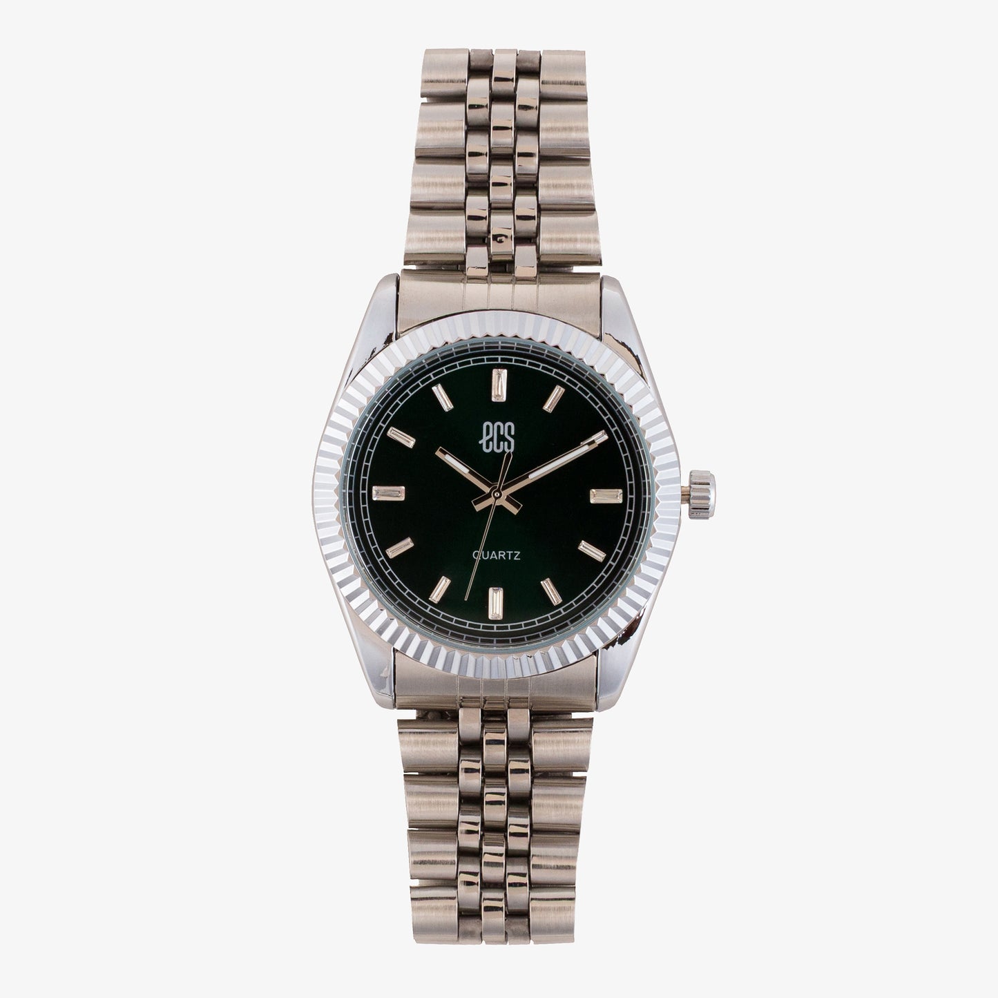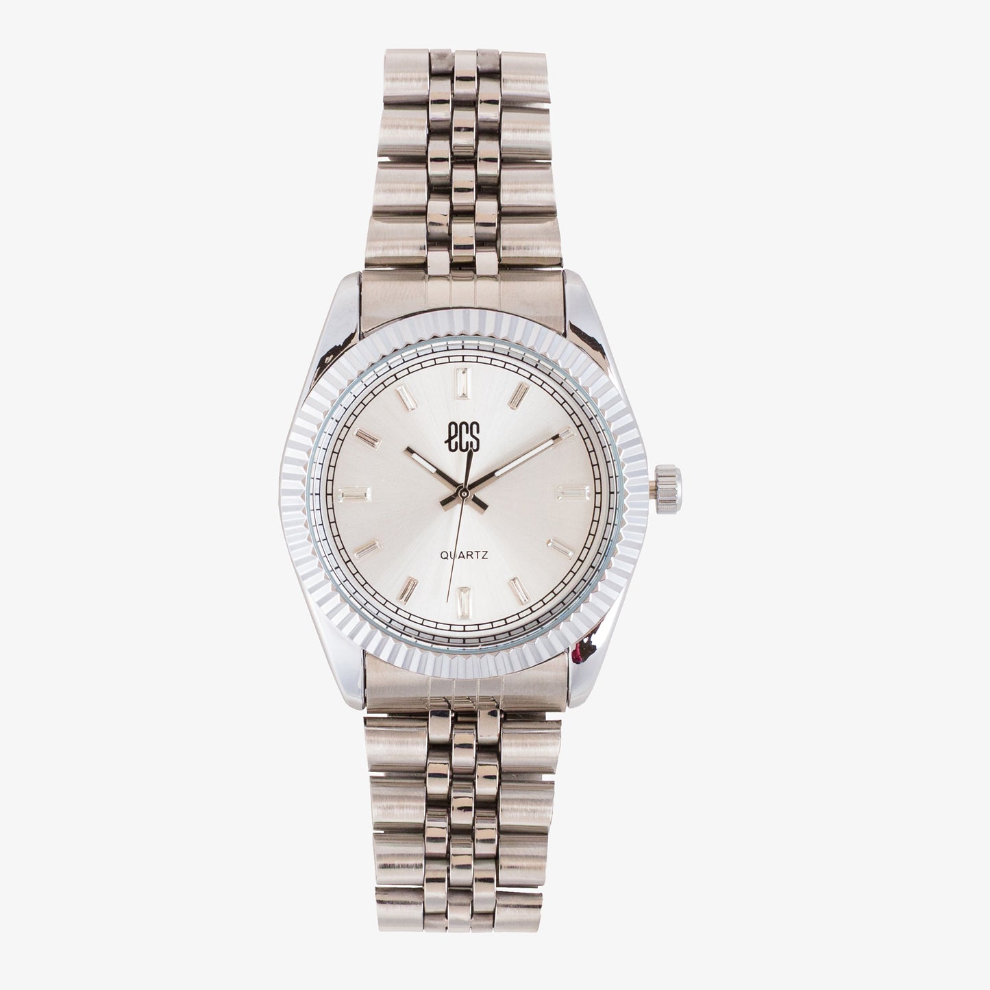 This elegant timepiece features a sleek round dial set in a polished alloy case with a ribbed bezel. The minimal index markers and bold hands ensure easy readability for daily wear.