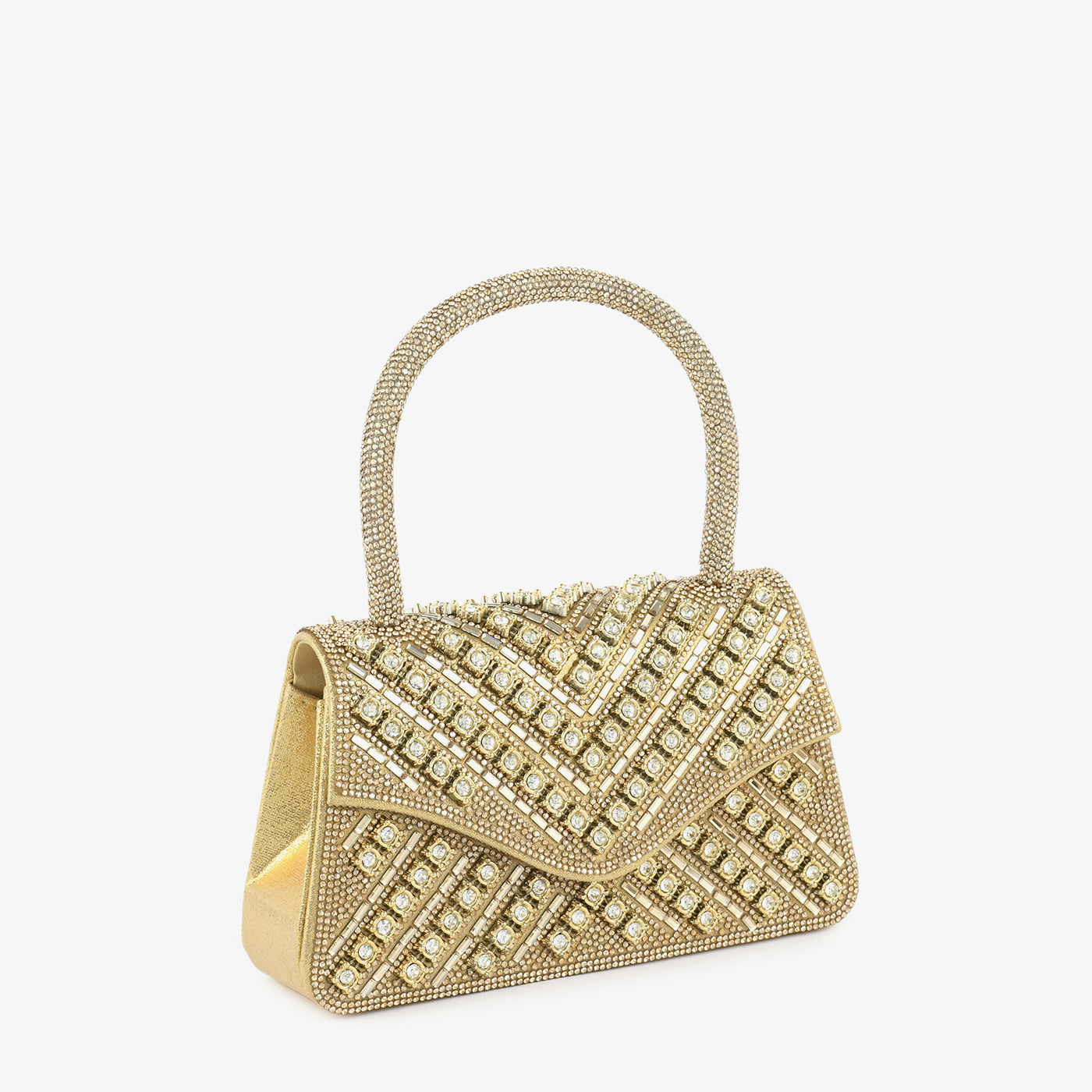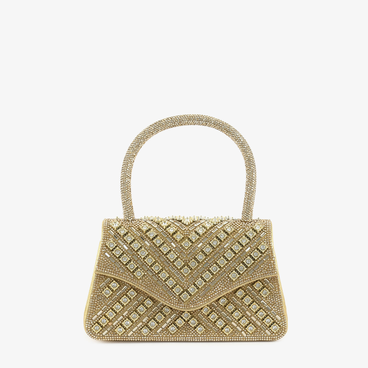 This elegant gold handbag is embellished with sparkling crystals arranged in a chevron pattern, creating a striking geometric effect. Its structured form and top handle make it both chic and practical for evening occasions. The shimmering surface adds an extra layer of sophistication and glamour.