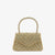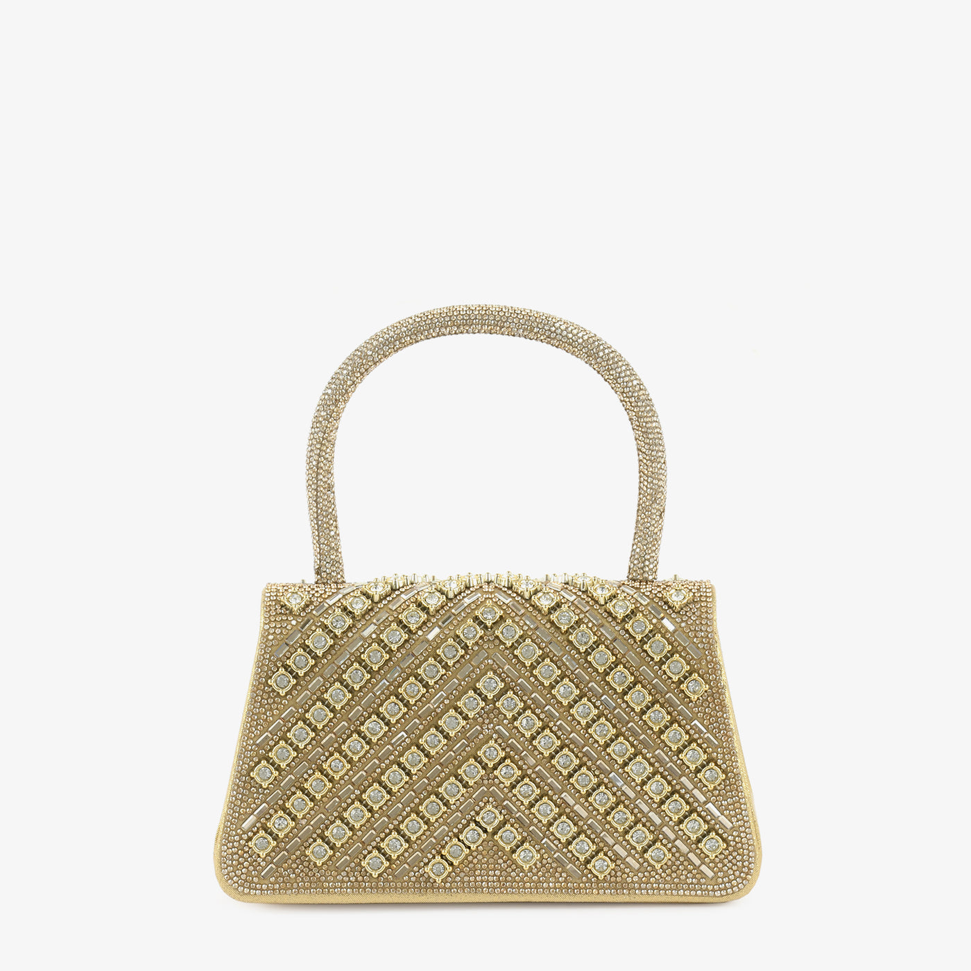 This elegant gold handbag is embellished with sparkling crystals arranged in a chevron pattern, creating a striking geometric effect. Its structured form and top handle make it both...
