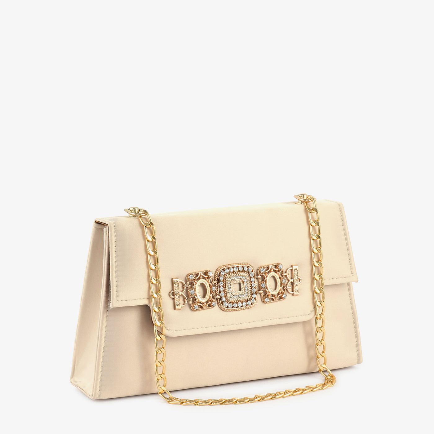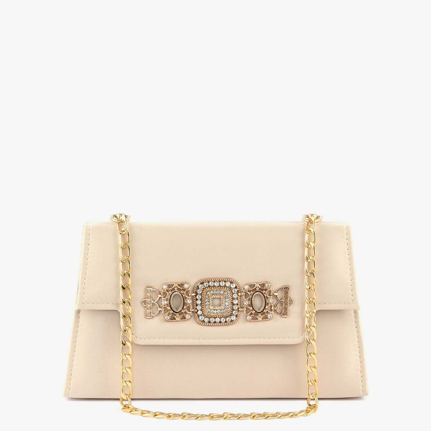 The Regal clutch exudes sophistication with its sleek black design and ornate, jewel-encrusted embellishment. The chain strap adds a touch of classic elegance, making it a perfect accessory for evening events or special occasions.