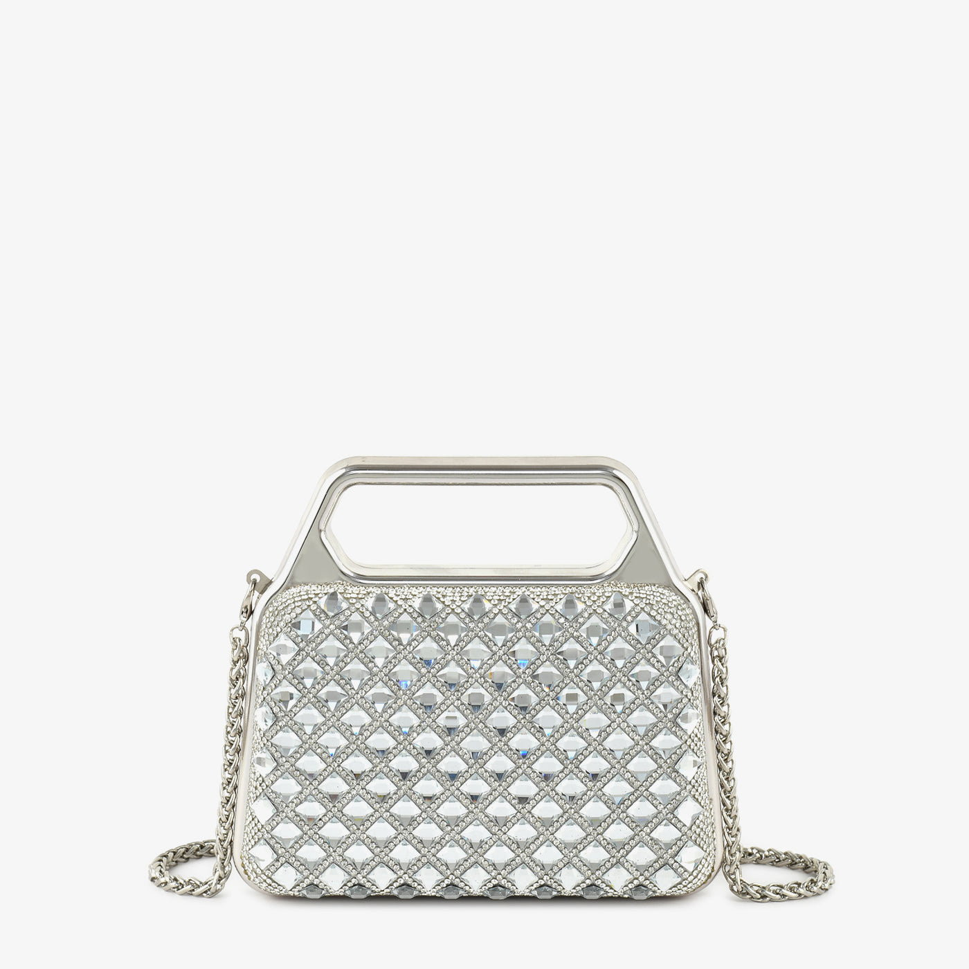 Evening clutch with reflective pattern and pearl embellishments throughout the design. The curved top handle offers a modern carrying option for formal occasions. Features a detachable chain strap that provides...