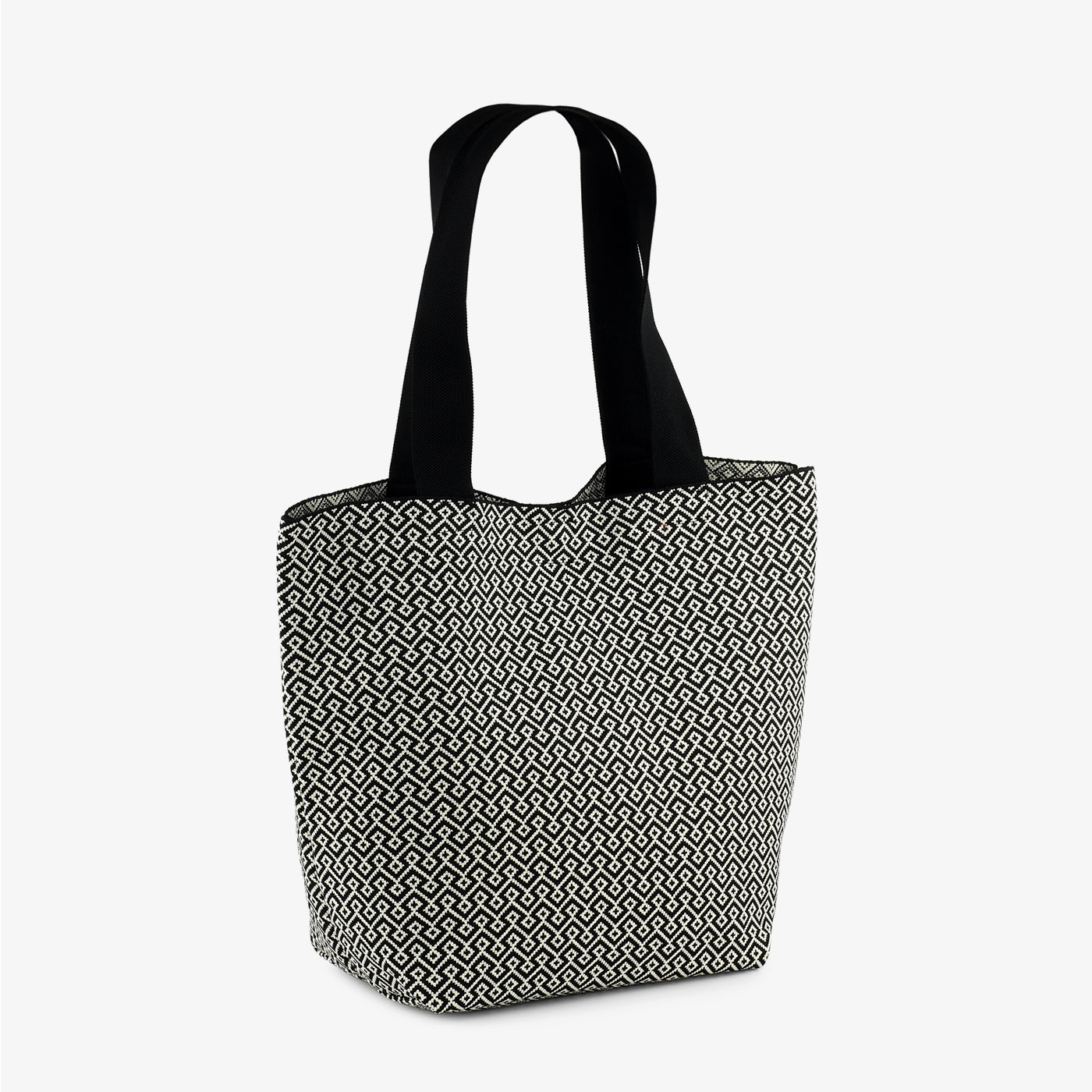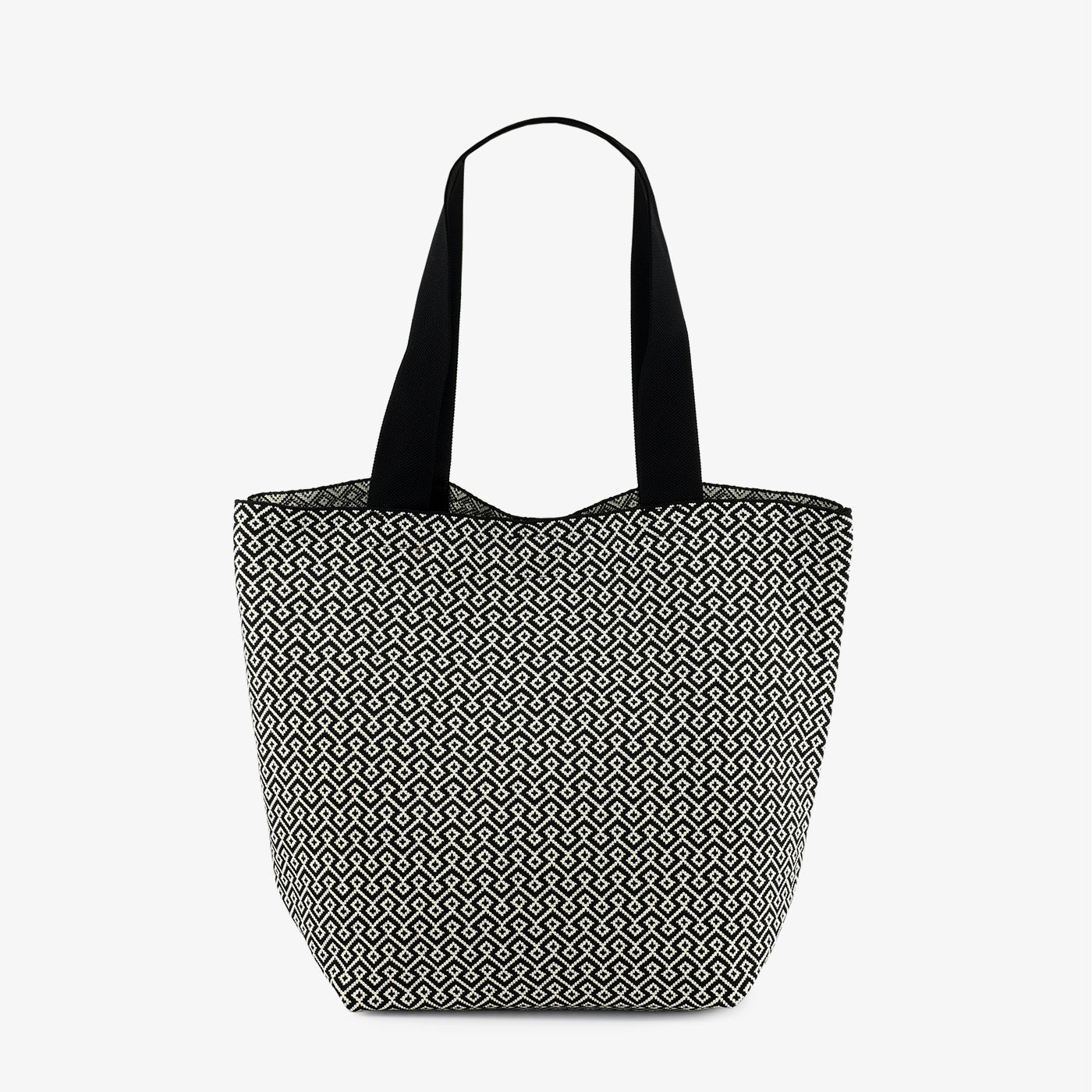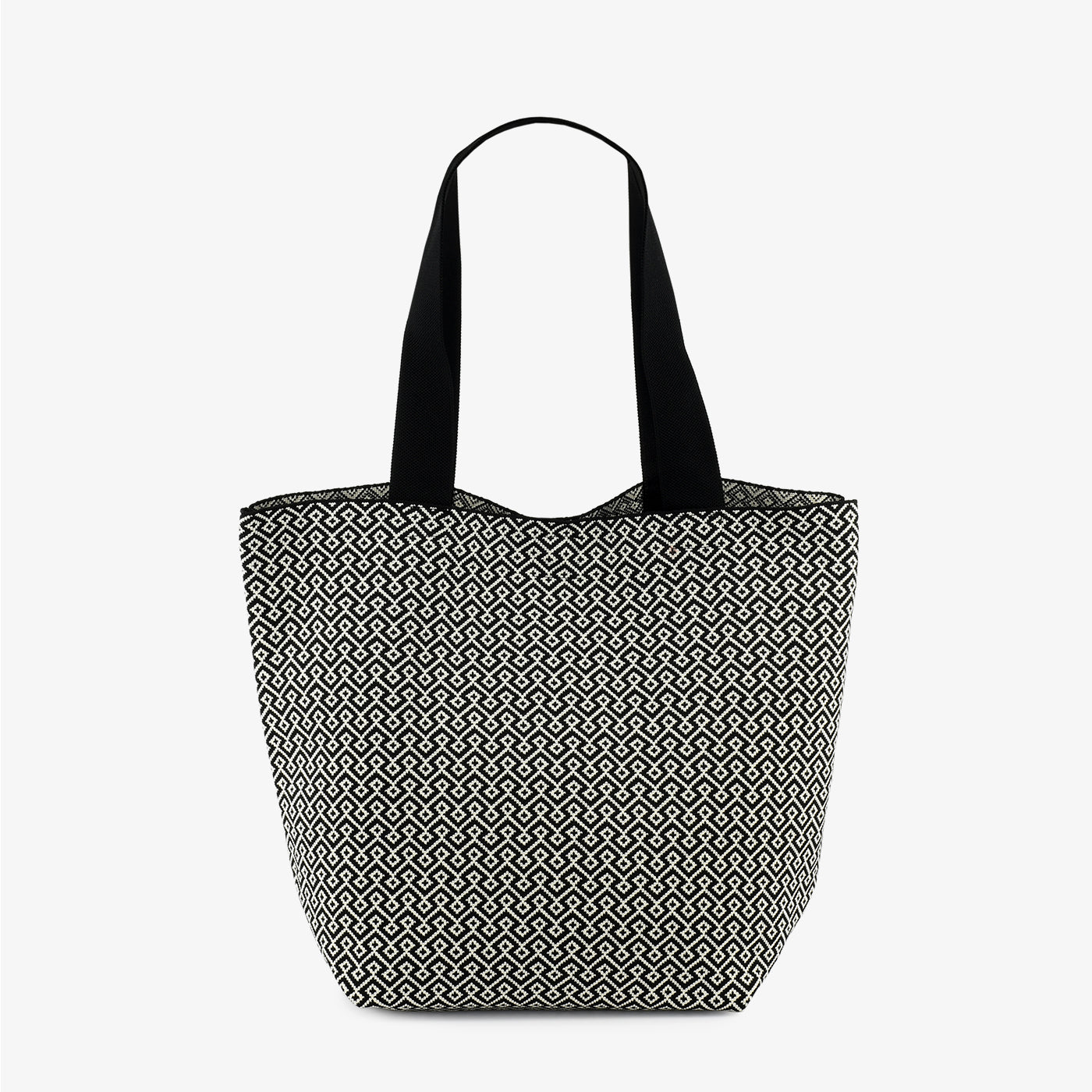 A trendy tote with an all-over miniature geometric pattern, striking the perfect balance between modern and versatile. Its compact yet roomy design makes it a daily must-have.