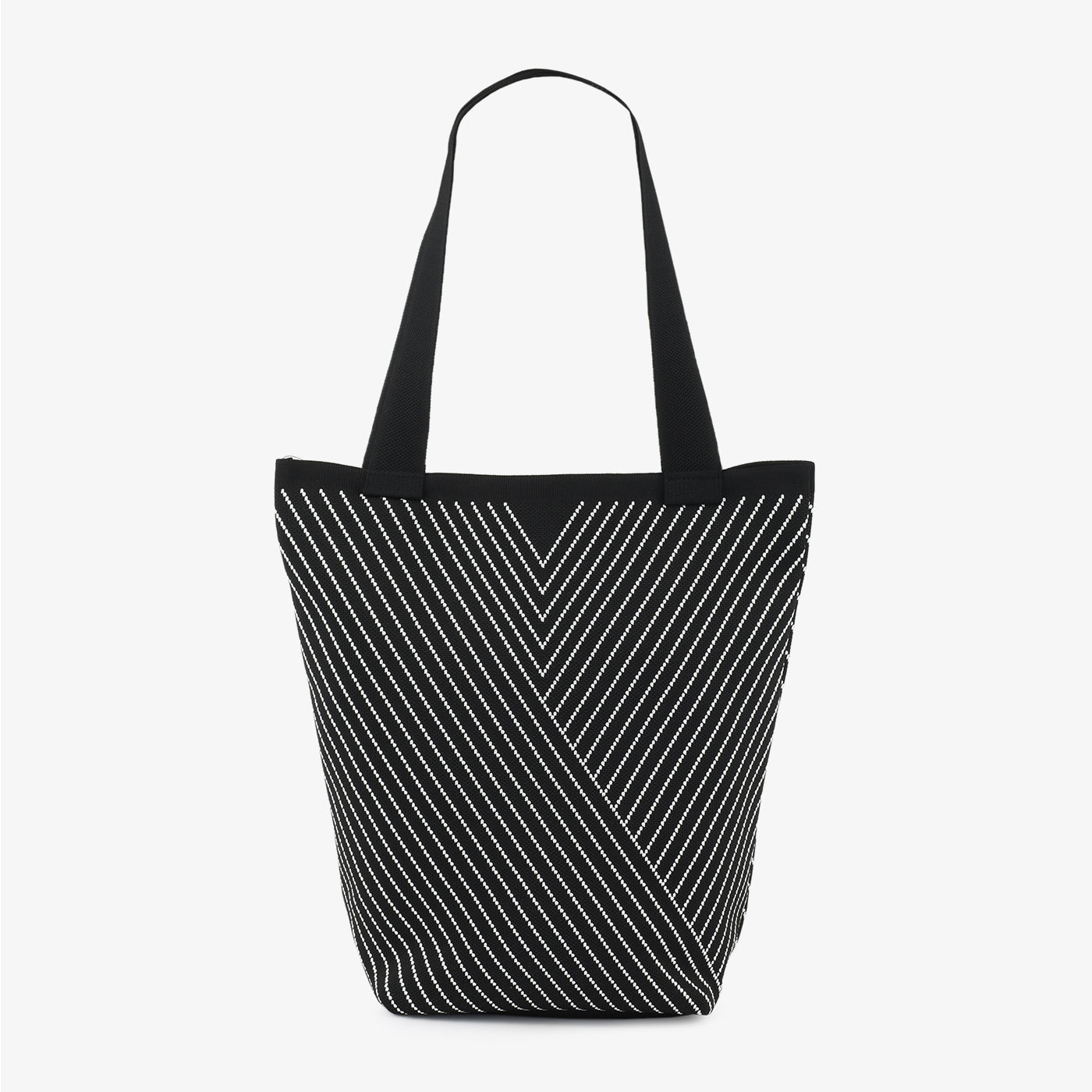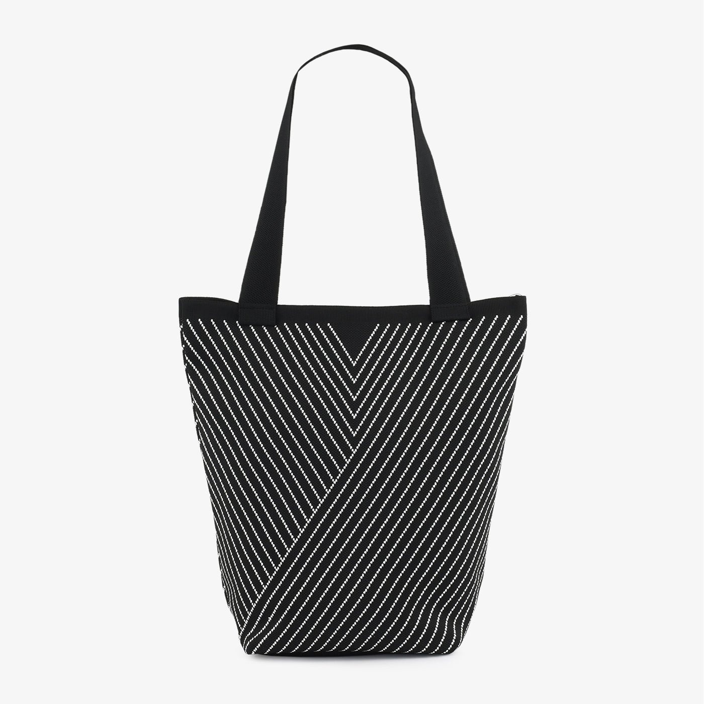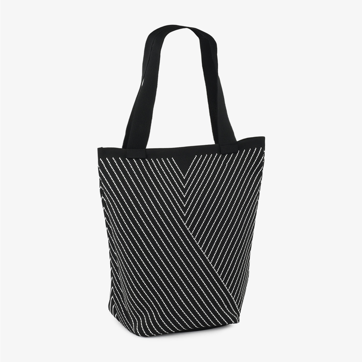 A modern tote designed with sleek diagonal stripes forming a bold chevron effect. Spacious and versatile, it’s the perfect balance of minimalism and statement-making design.