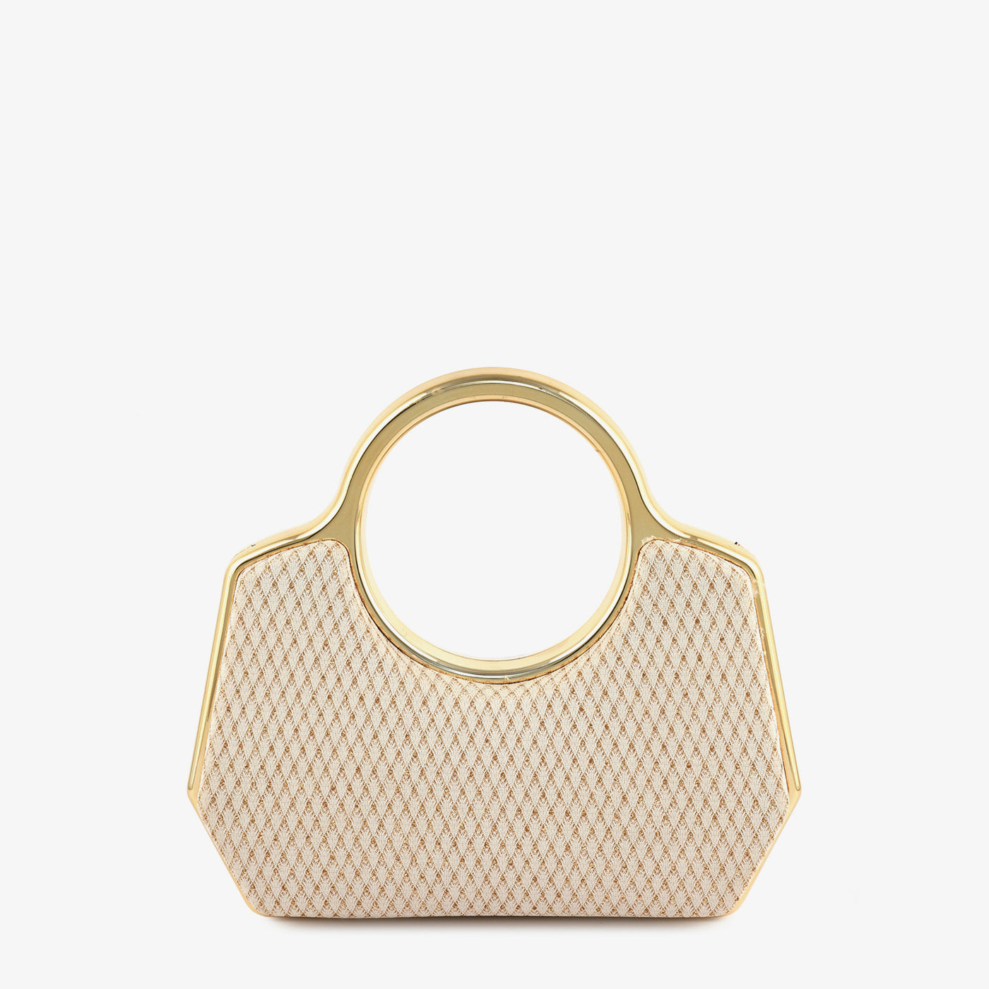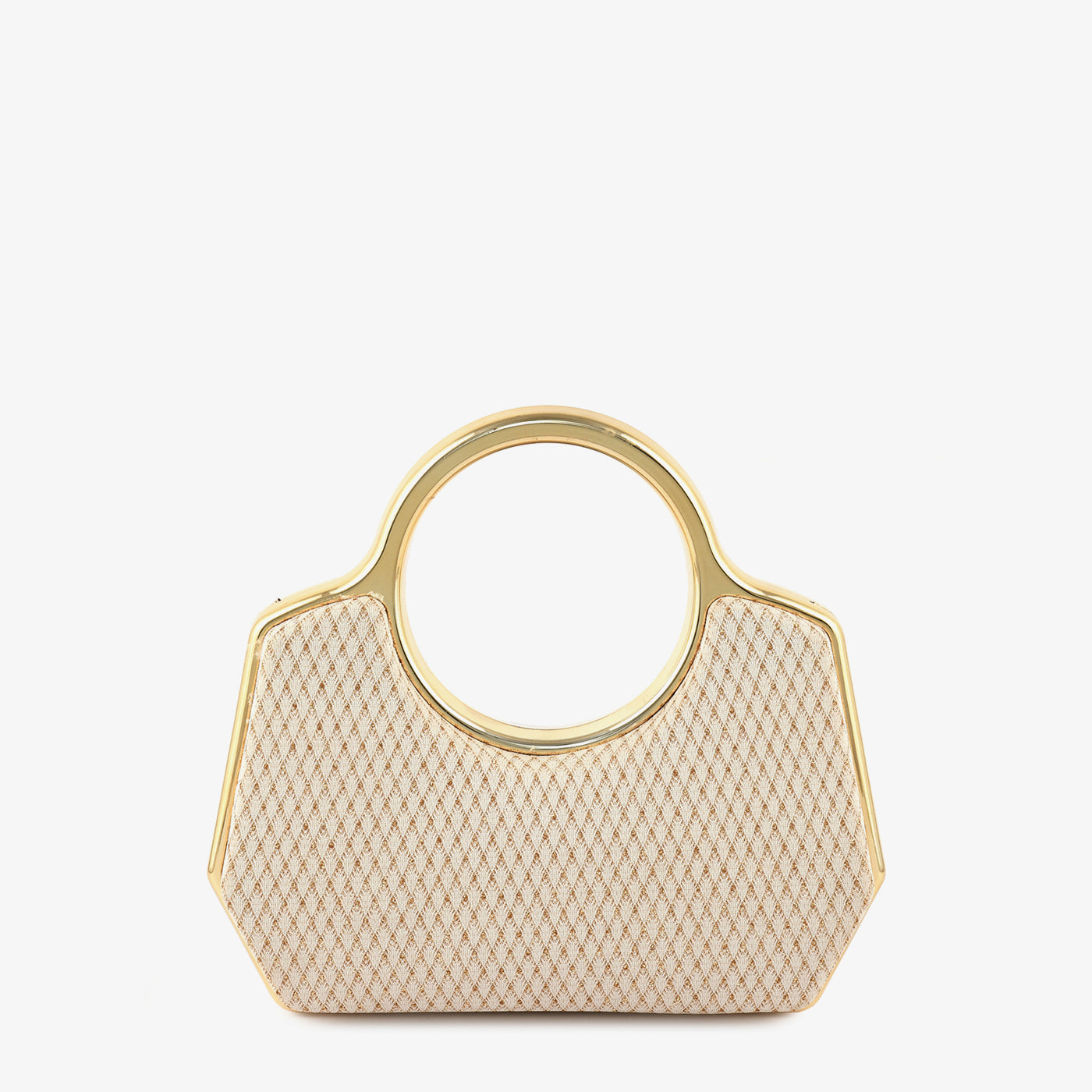 This elegant handheld clutch features a modern structured silhouette accented with a sleek metallic ring handle for a bold statement. The textured surface adds depth and sophistication to its overall design. Its compact yet spacious interior is ideal for carrying your essentials during special occasions. The sturdy frame ensures durability while maintaining a lightweight feel. Designed for comfort and style, it offers a secure and easy grip. The refined finish enhances its timeless appeal. Perfect for parties and formal events, it complements both traditional and contemporary outfits effortlessly.