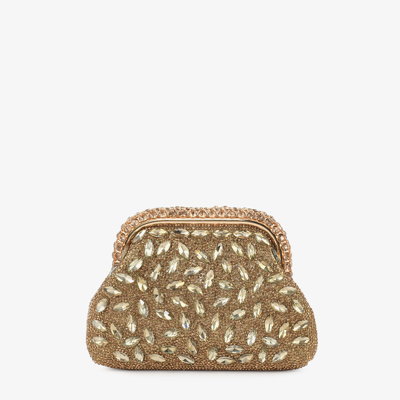 Evening clutch featuring marquise and round crystal embellishments in an intricate pattern across the surface. The ornate frame with crystal detailing adds a refined touch to the design. Equipped with...