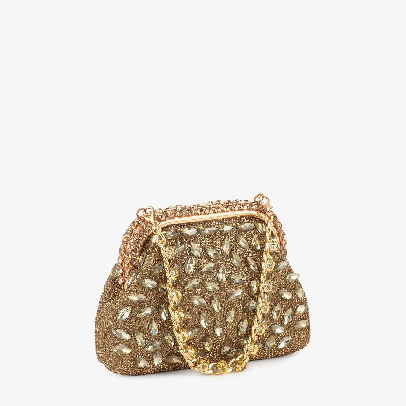 Evening clutch featuring marquise and round crystal embellishments in an intricate pattern across the surface. The ornate frame with crystal detailing adds a refined touch to the design. Equipped with a detachable chain strap that offers versatility for crossbody or shoulder wear. The secure clasp closure protects essentials while maintaining an elegant silhouette. Perfect for weddings and formal celebrations that call for a statement accessory. A sophisticated piece that elevates traditional and contemporary formal ensembles.