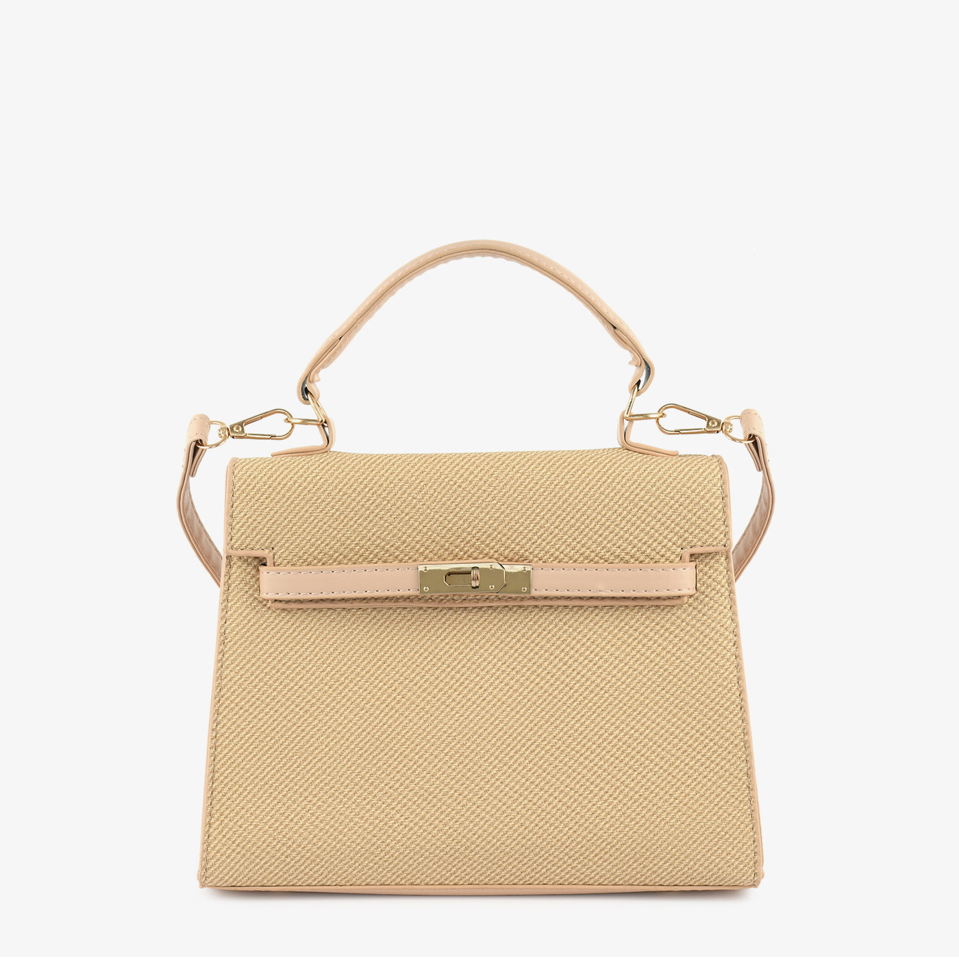 This thoughtfully designed handbag features a refined textured fabric body paired with smooth synthetic accents for a balanced and elegant look. The structured silhouette with a secure belt-style front lock adds a sophisticated touch, while the sturdy top handle and detachable shoulder strap provide versatile carrying options. The spacious main compartment with soft inner lining ensures easy organization of daily essentials. Lightweight yet durable, this bag is ideal for everyday use and special occasions alike.