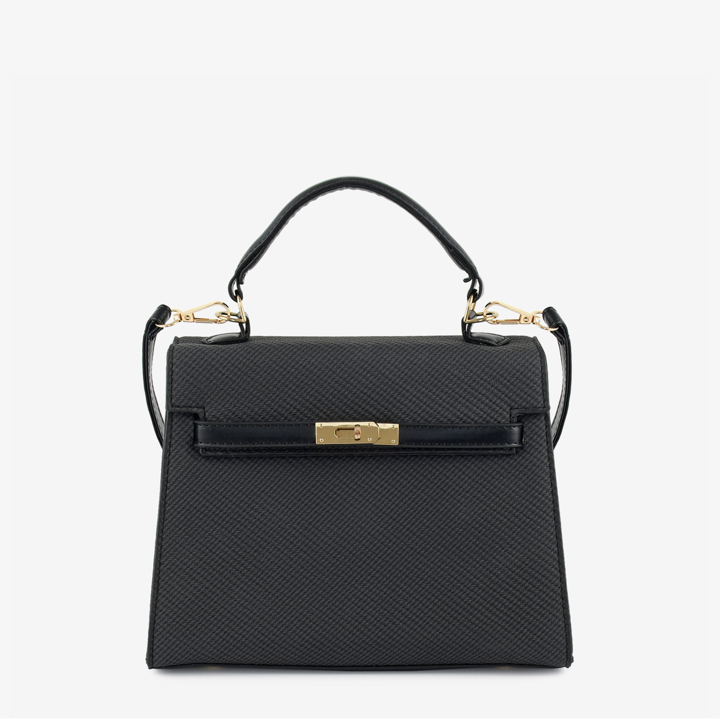• Design: Structured handbag with top handle, adjustable shoulder strap, and belt-style front lock detail