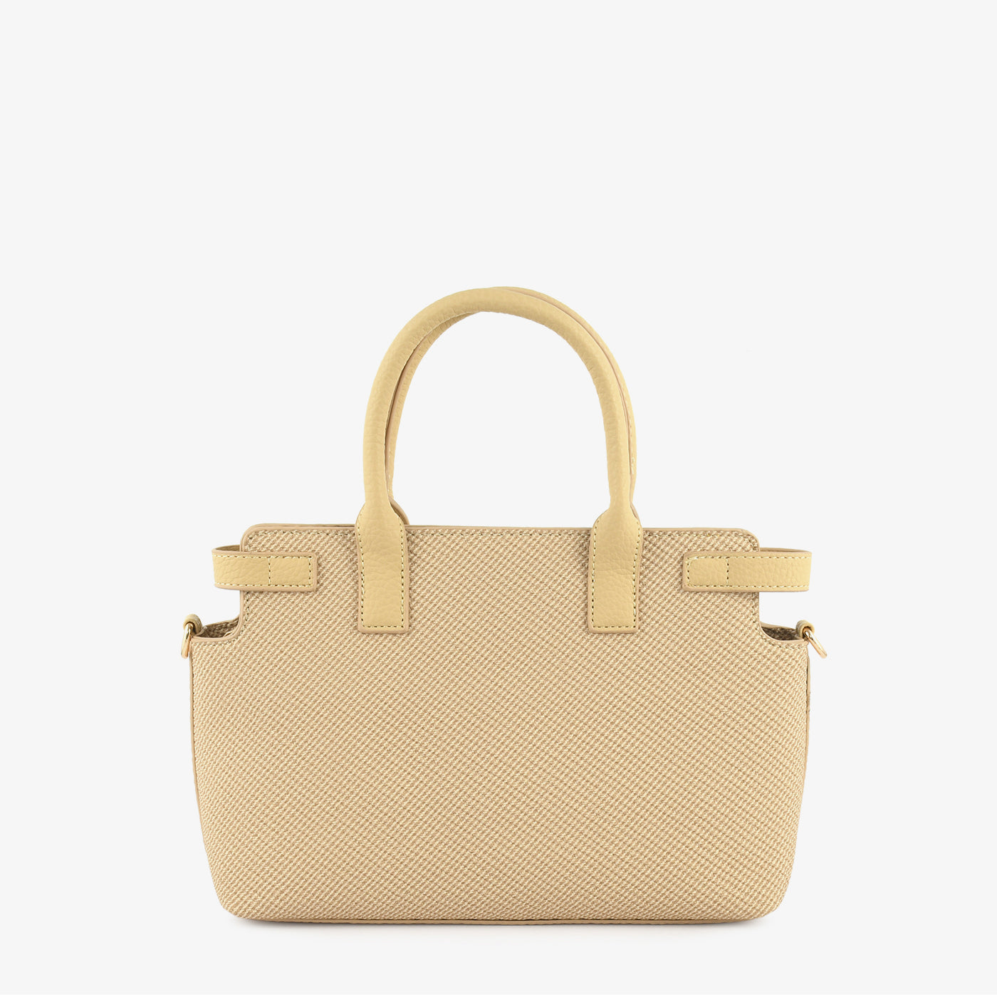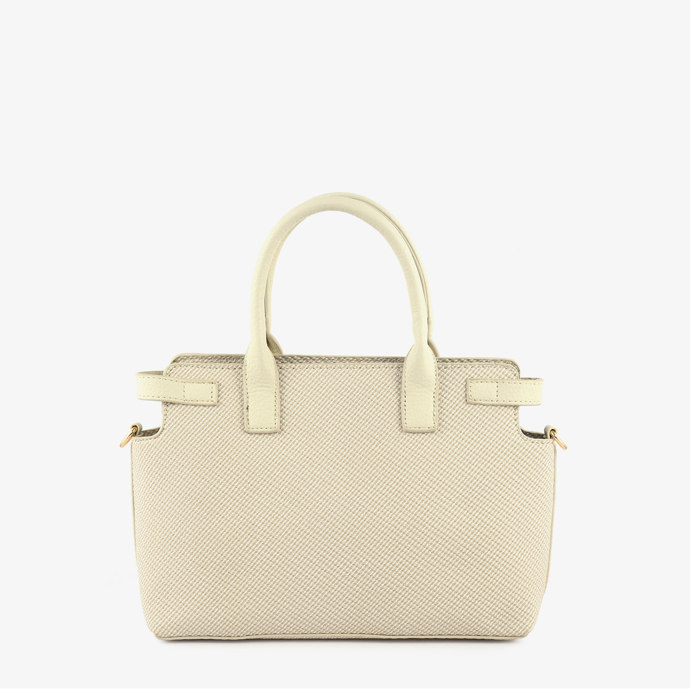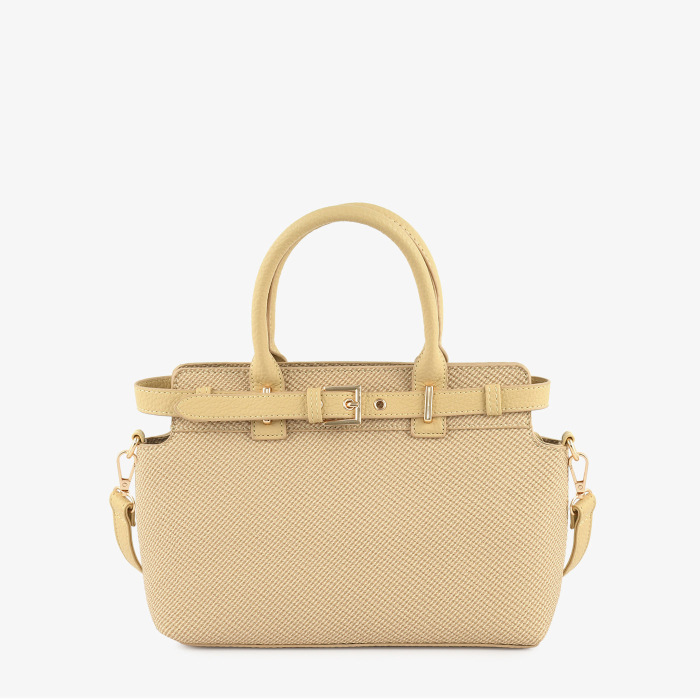 This thoughtfully designed handbag features a refined textured fabric body paired with smooth synthetic accents for a balanced and elegant look. The structured silhouette with a secure belt-style front detail adds a sophisticated touch, while the sturdy top handles and detachable shoulder strap provide versatile carrying options. The spacious main compartment with soft inner lining ensures easy organization of daily essentials. Lightweight yet durable, this bag is ideal for everyday use and special occasions alike.