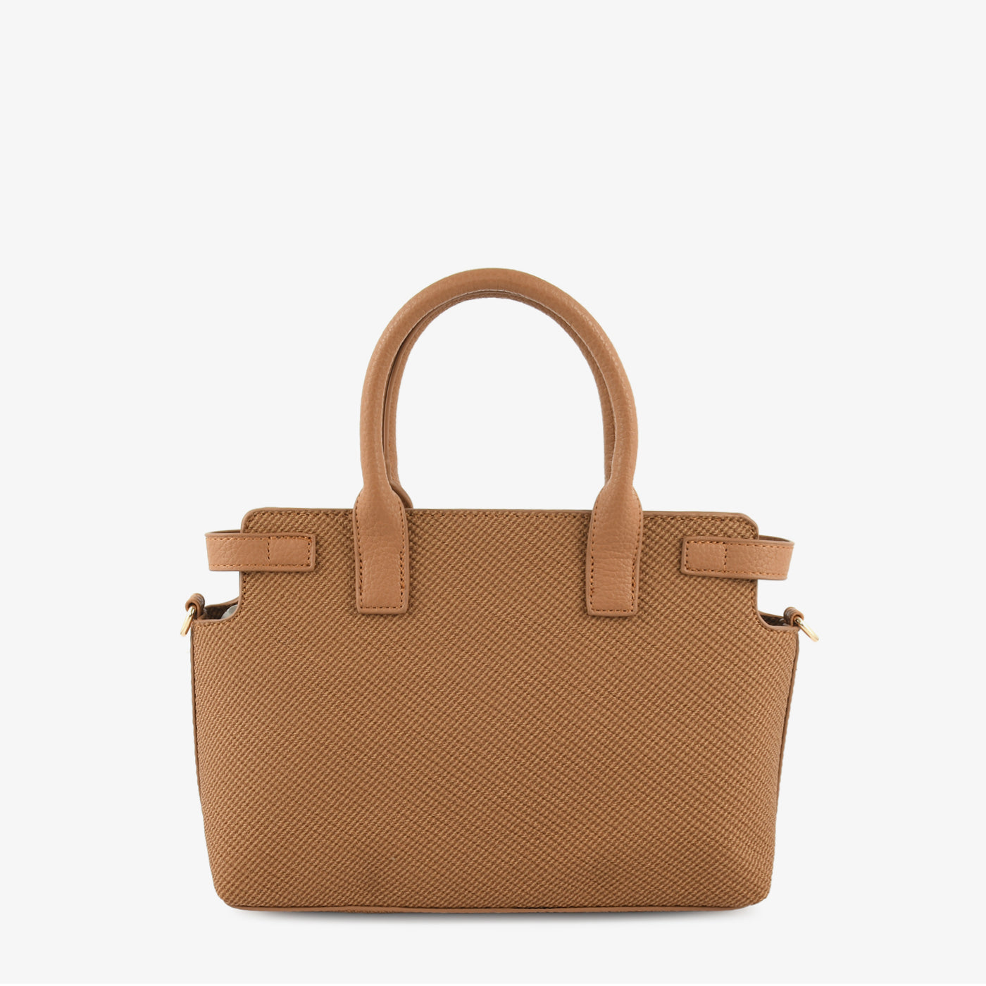 • Design: Structured handbag with top handles, adjustable shoulder strap, and belt-style front detail