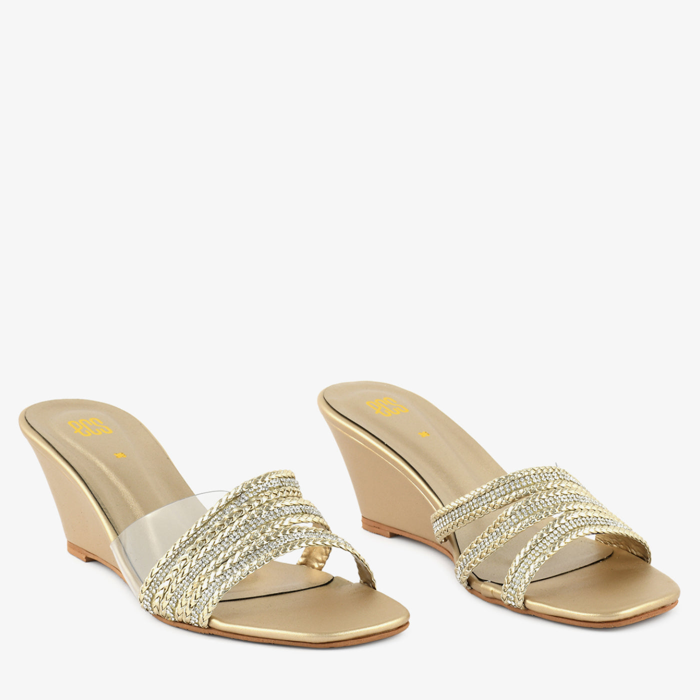 Designed with a graceful wedge structure, this slipper blends elegant style with everyday comfort. The upper features beautifully arranged braided straps with delicate detailing that create a refined and decorative look. A clear support strap adds stability while maintaining a neat and modern appearance. The soft cushioned footbed allows comfortable steps throughout the day. Built with a wedge heel, it provides gentle elevation while supporting balanced movement. Suitable for casual gatherings or special outings, this slipper offers a stylish combination of comfort and sophistication.