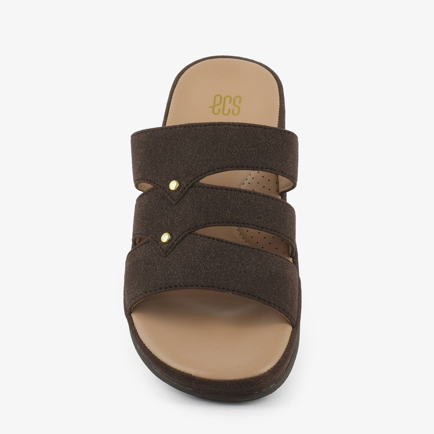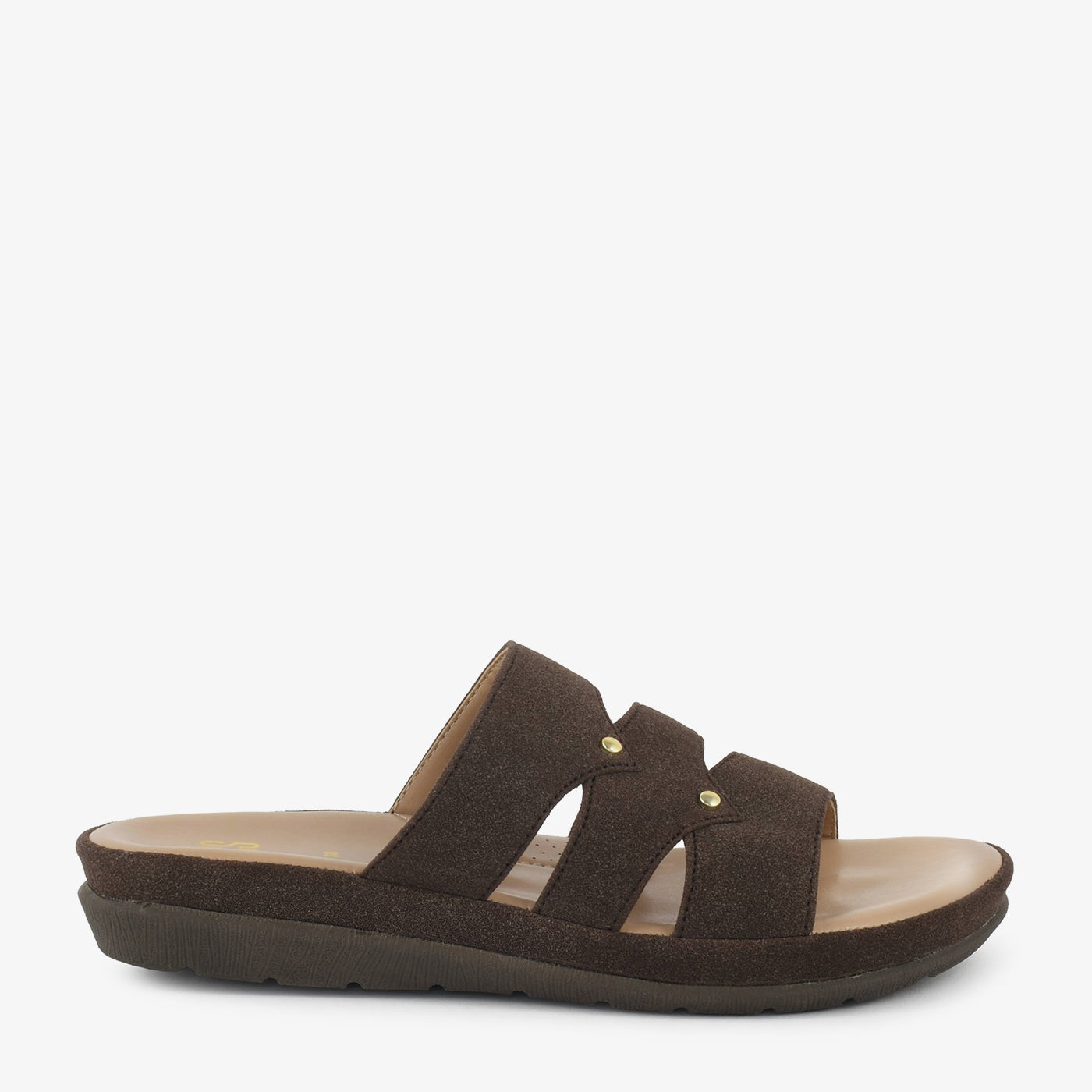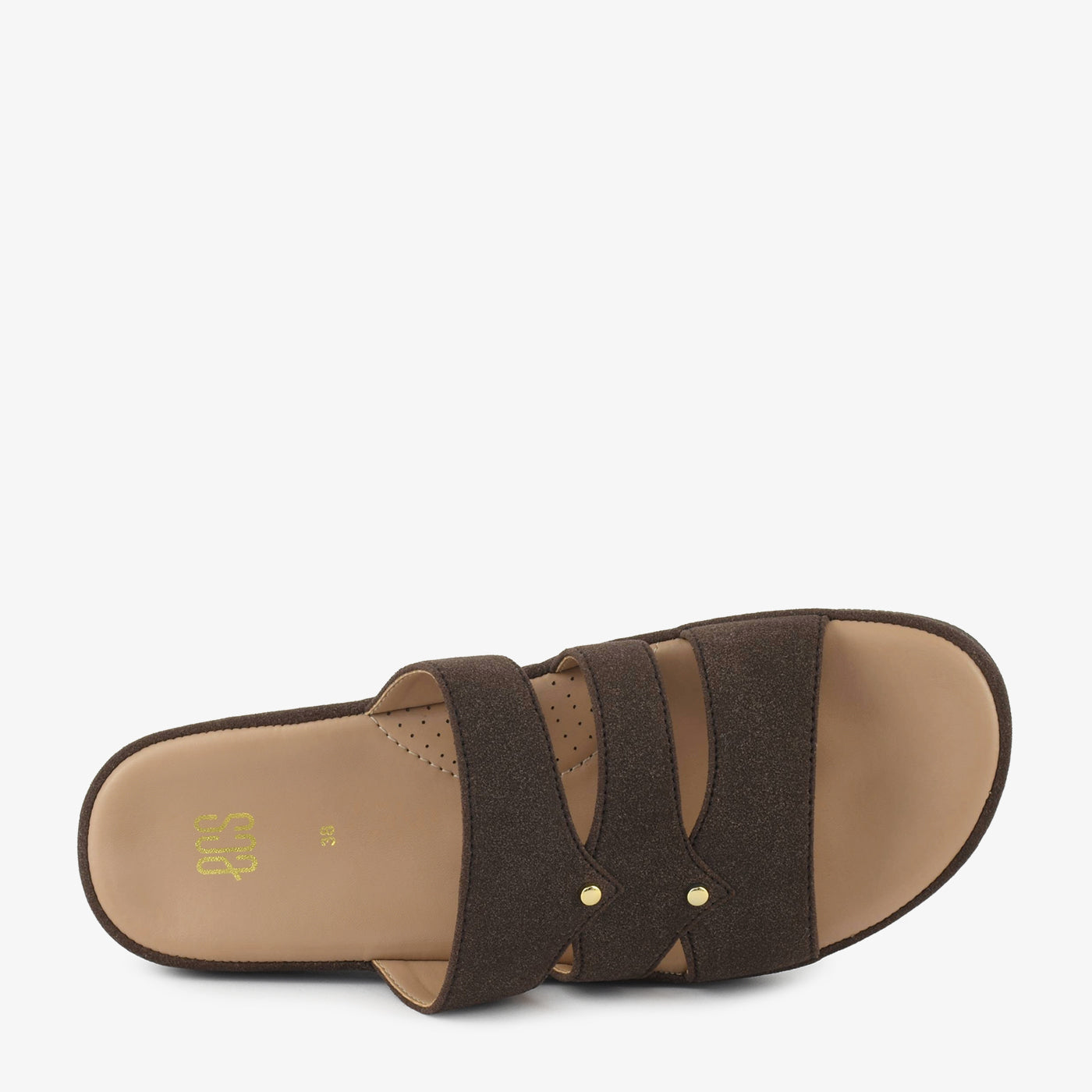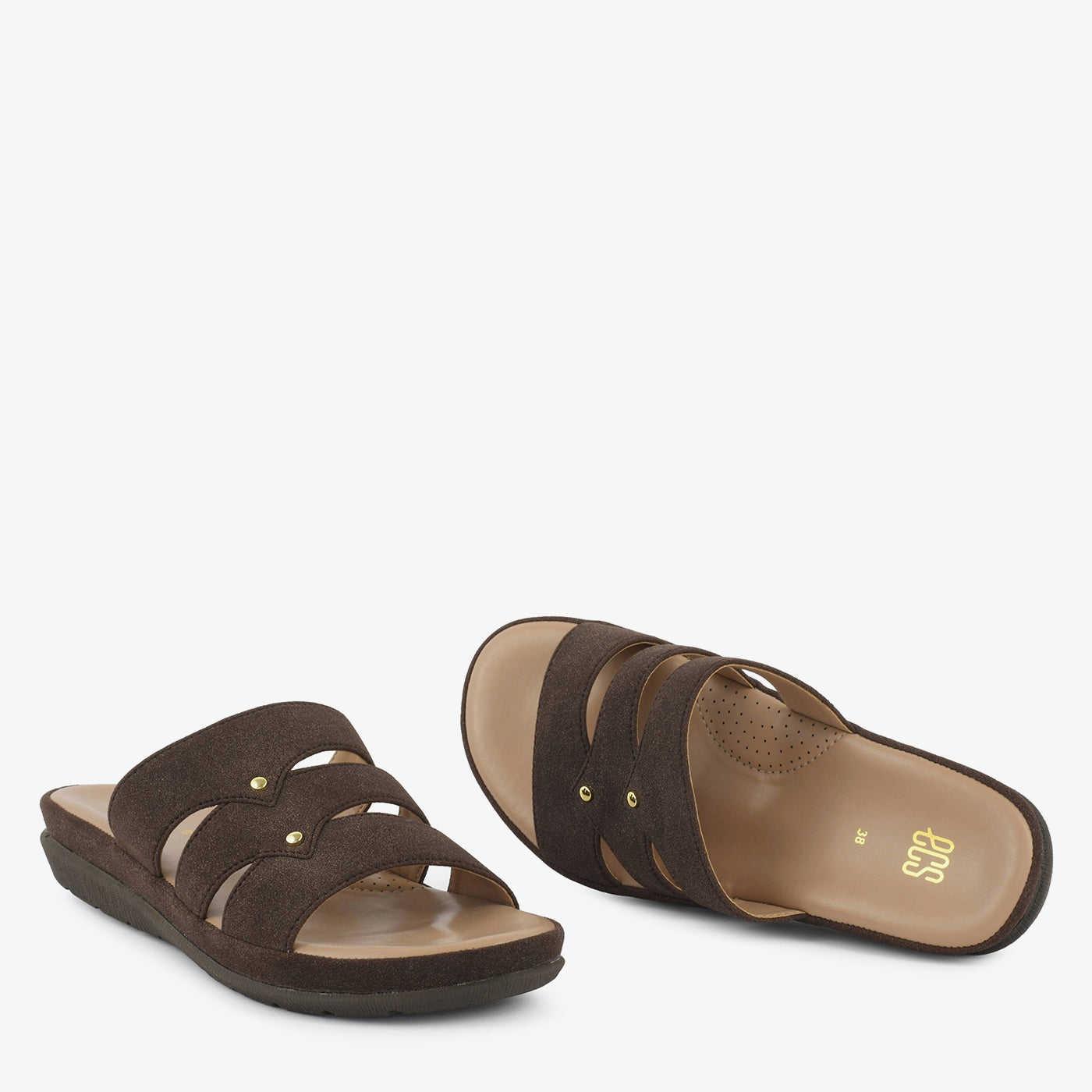 Step into everyday comfort with these tan slide slippers, featuring a soft, textured upper with a unique curved design and subtle metallic stud accents. Their comfortable flat sole makes them perfect for your daily wear around Lahore.