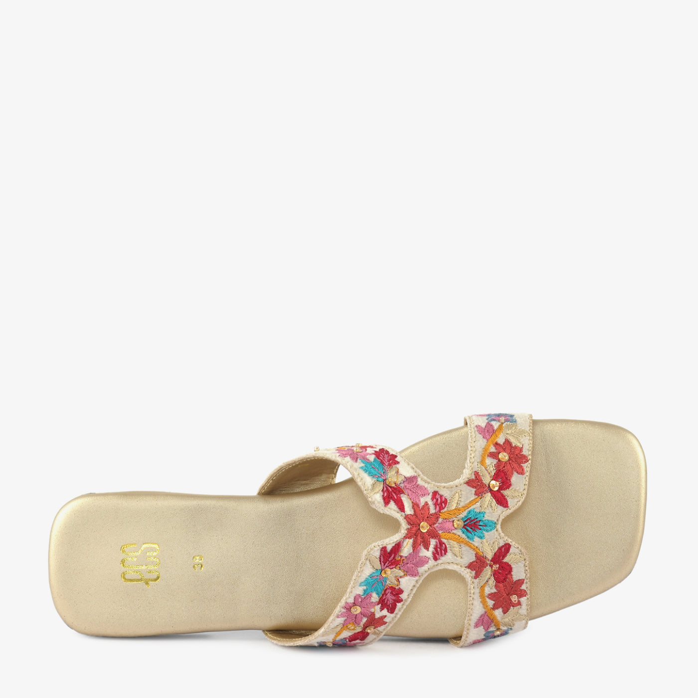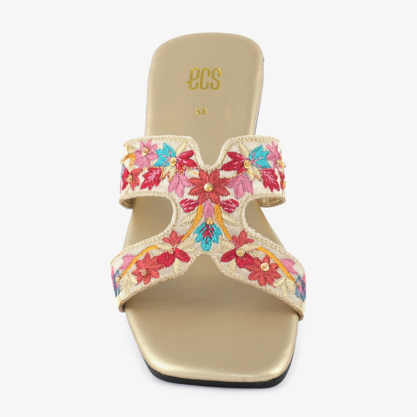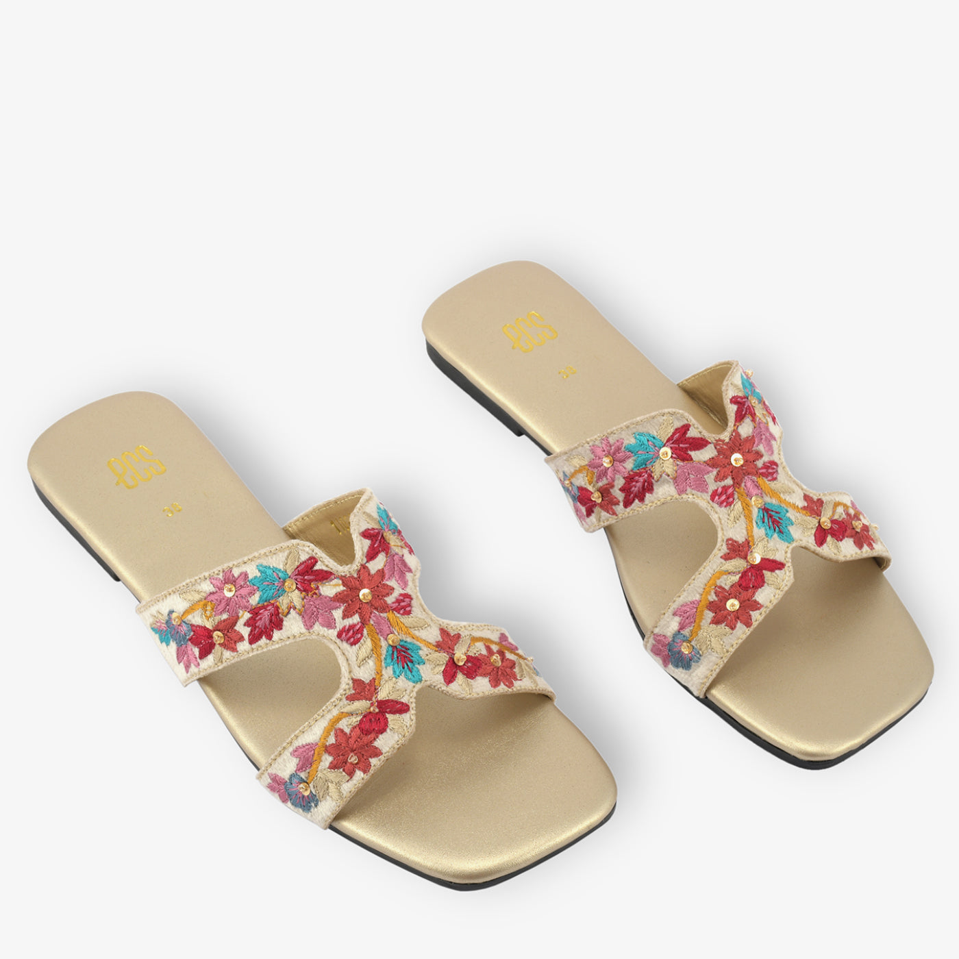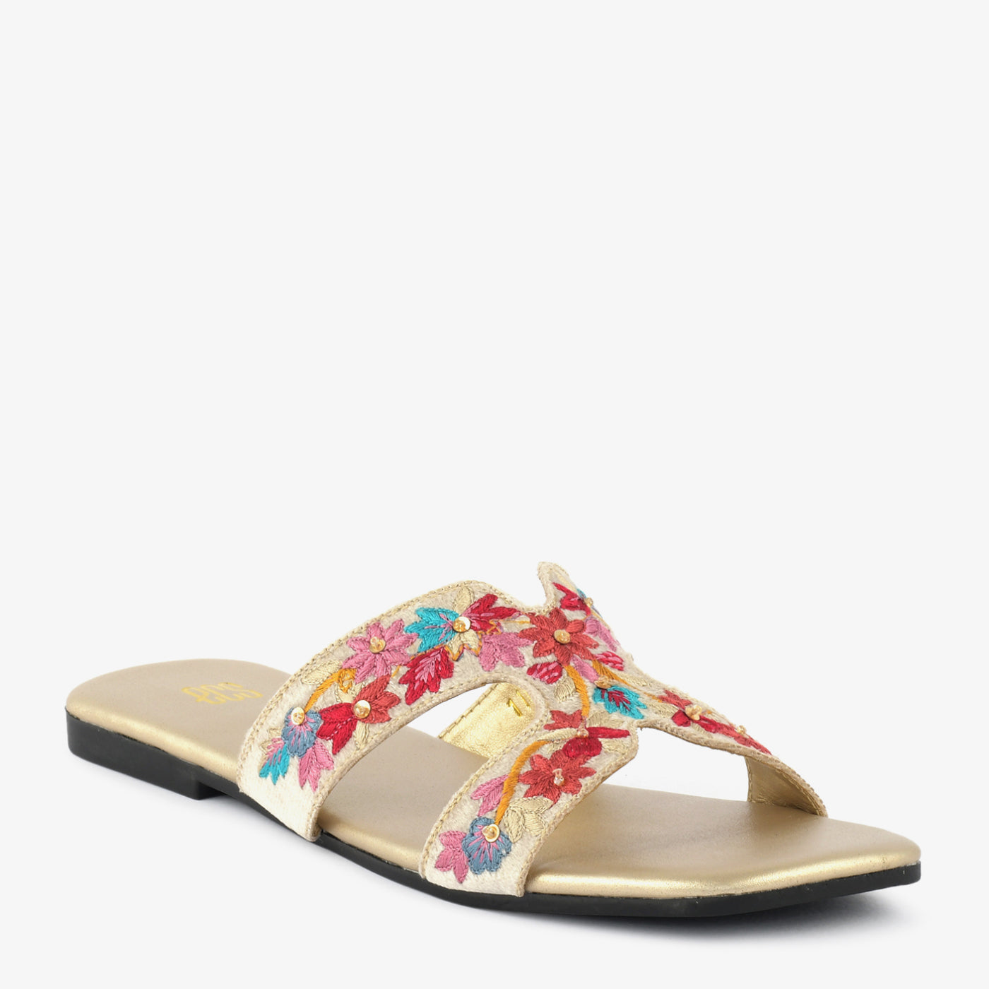 Add a touch of artisanal charm to your footwear collection with these Floral Embroidered Slides. Featuring delicate floral embroidery on the straps, these slides offer a handcrafted and feminine aesthetic. The flat sole ensures comfort for everyday wear.