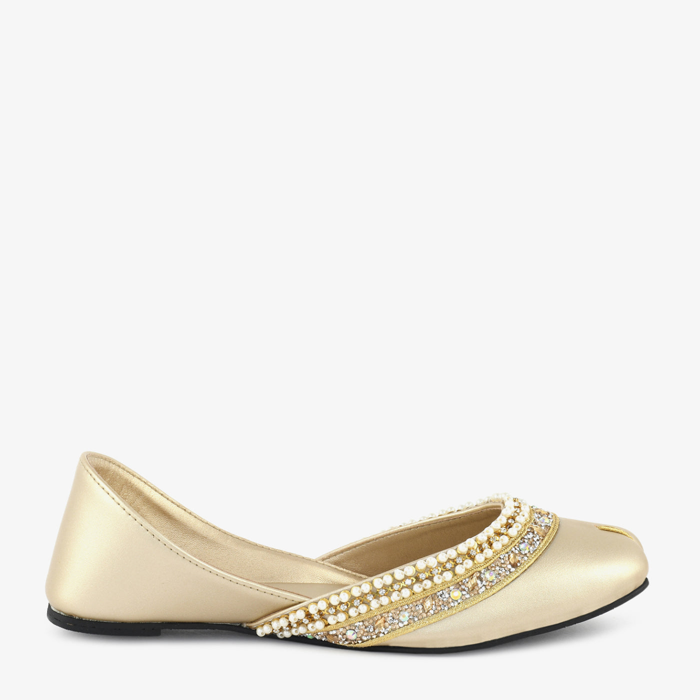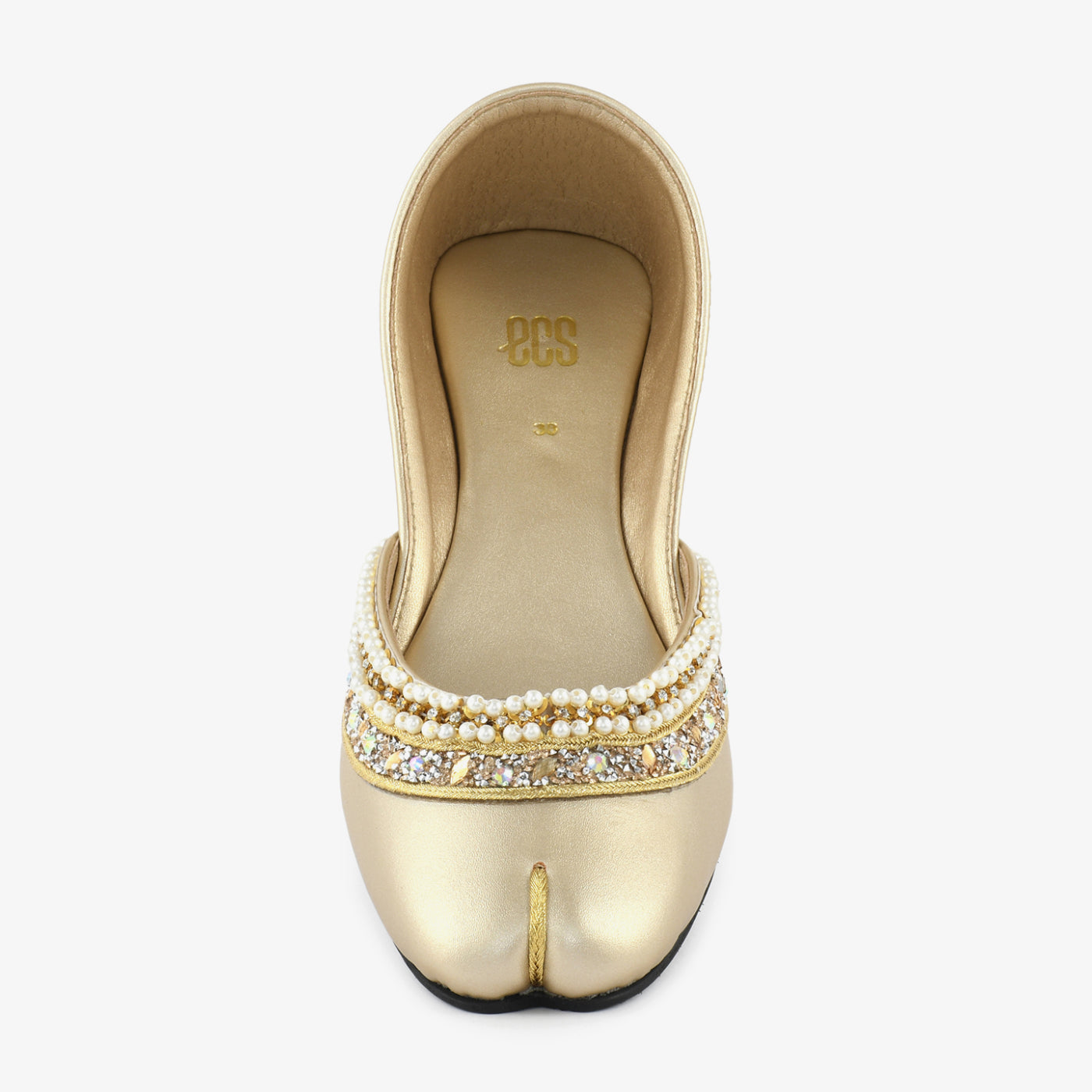 Bring radiance to your festive wardrobe with this elegant khussa-style flat, adorned with lustrous pearls and shimmering embellishments. The soft satin finish gives it a rich, graceful look—perfect for special occasions and traditional wear.