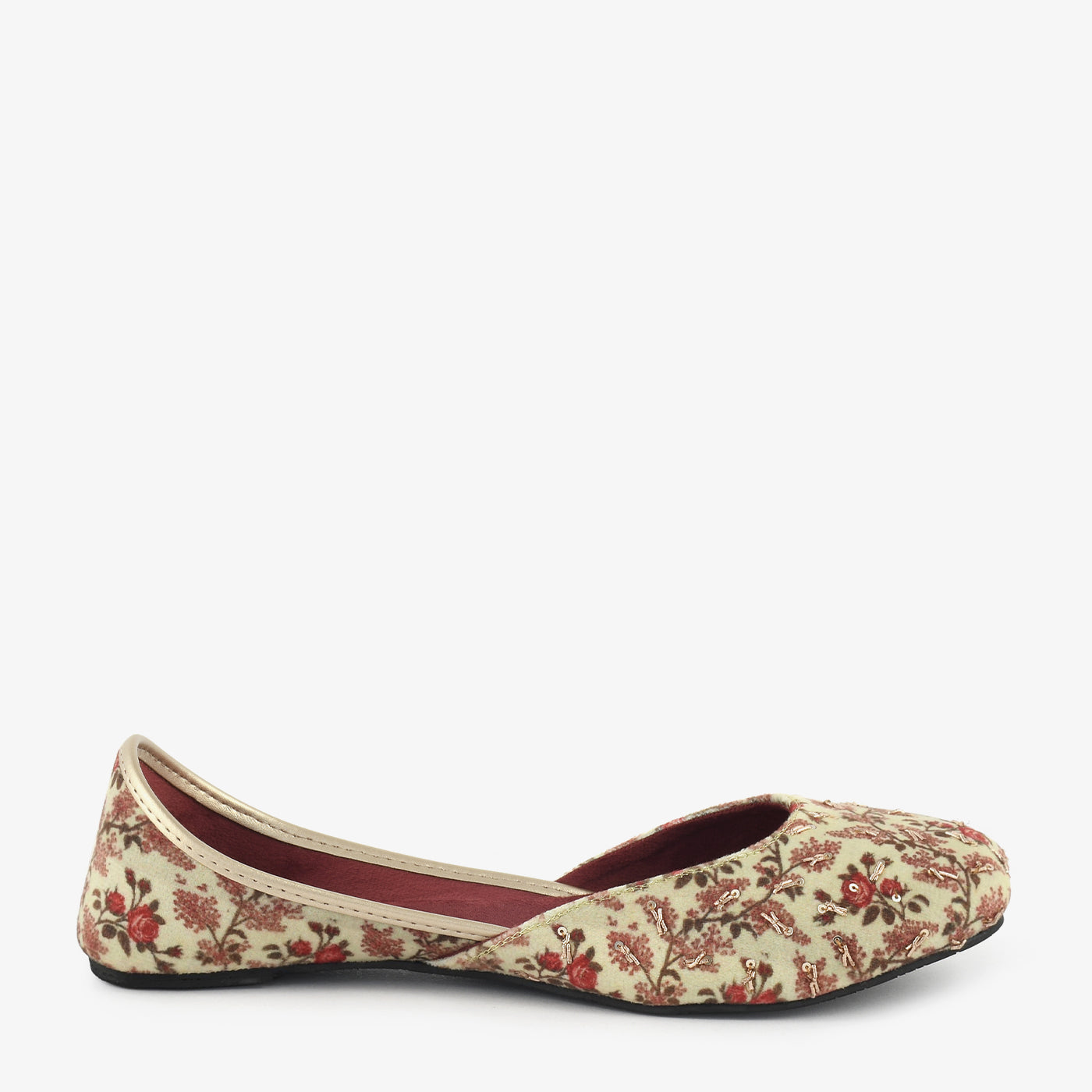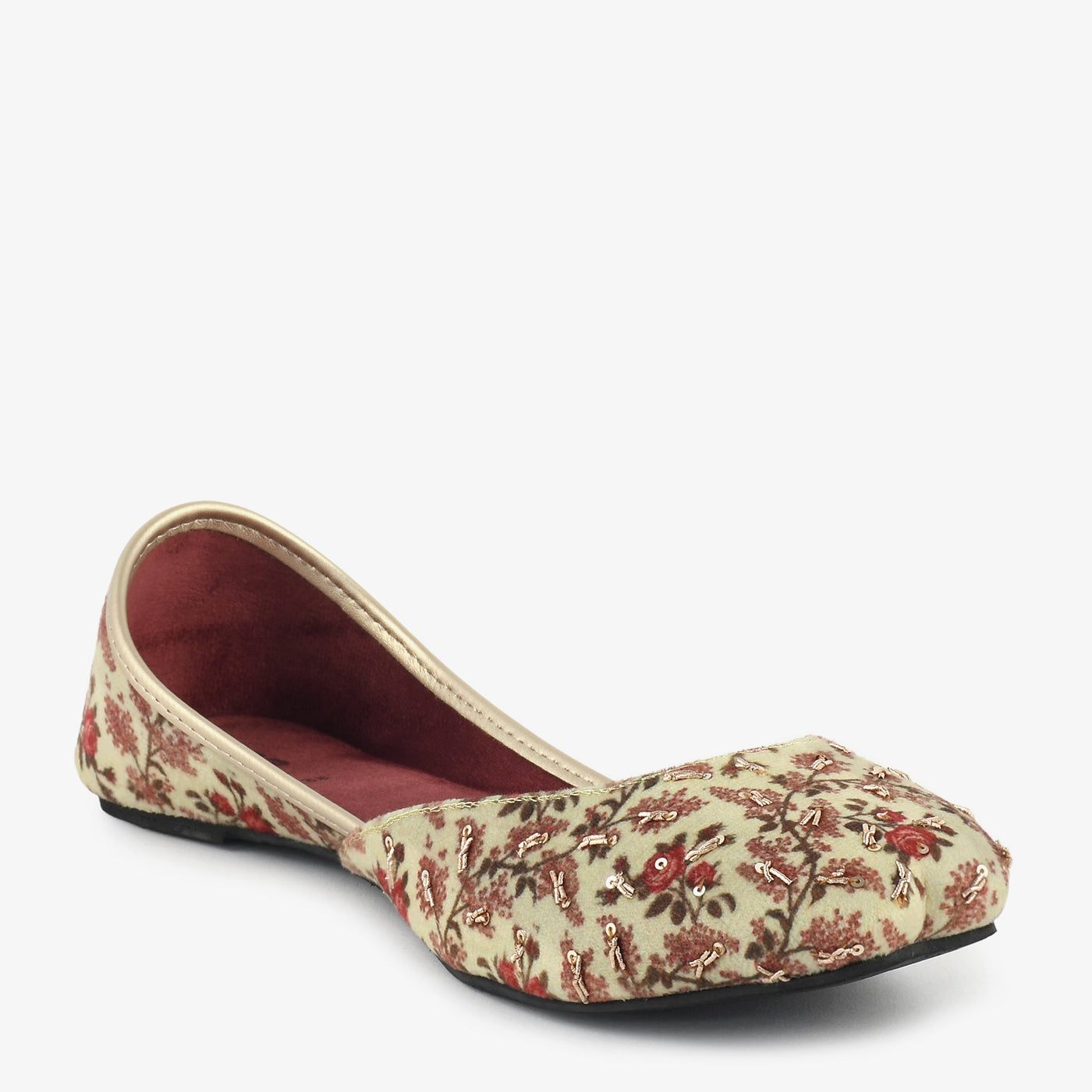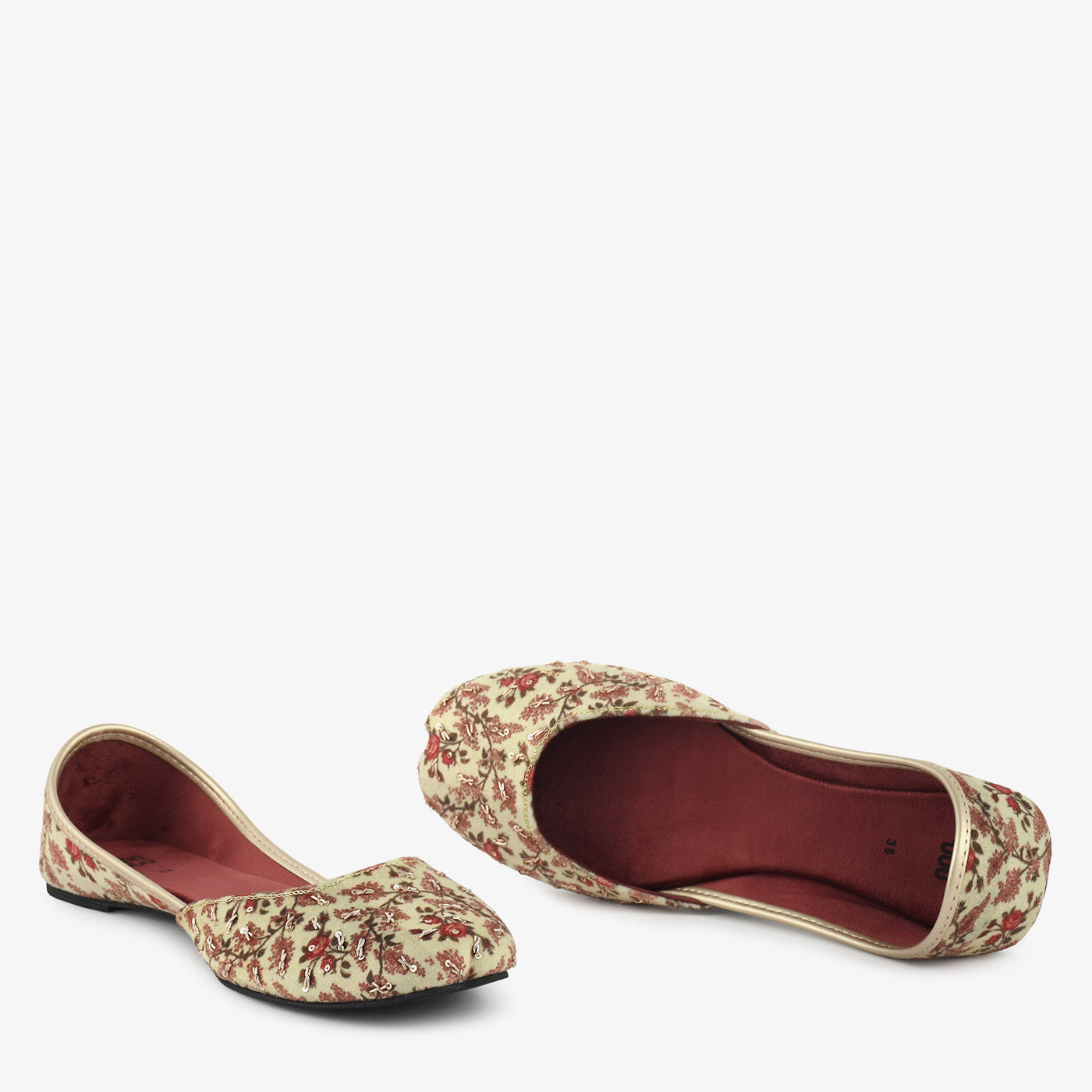 This beautifully designed khussa features intricate floral-inspired patterns with delicate embellishments, adding a refined and artistic touch to your footwear collection. Crafted with a soft cushioned insole, it offers comfortable wear throughout the day. The smooth inner lining enhances ease, while the structured silhouette provides a graceful fit. With its lightweight feel and detailed craftsmanship, this khussa blends traditional elegance with modern sophistication.