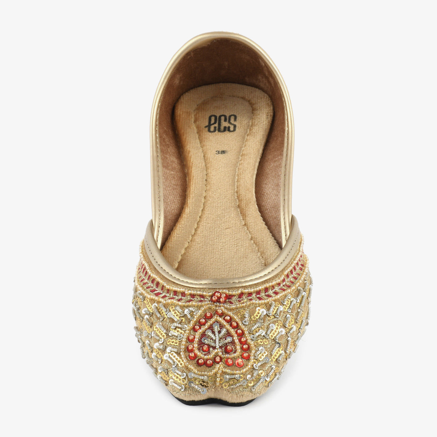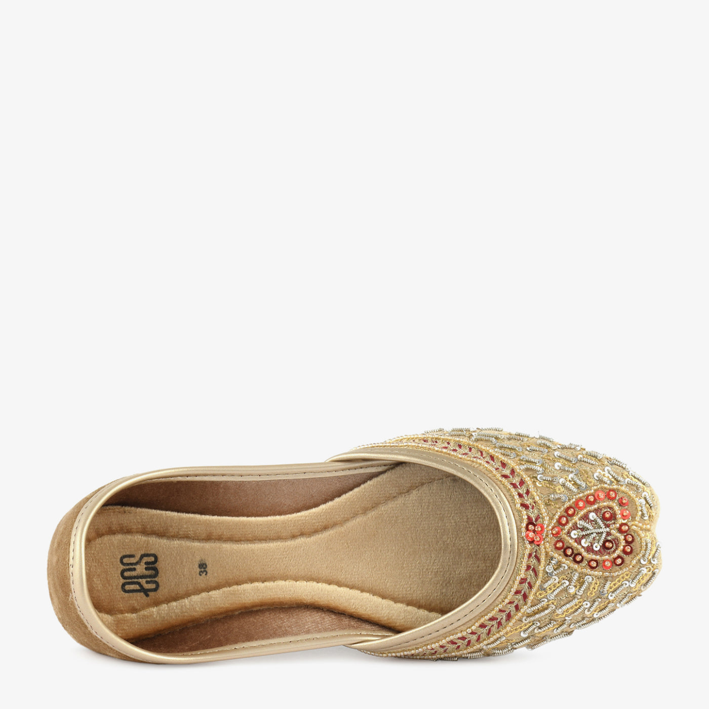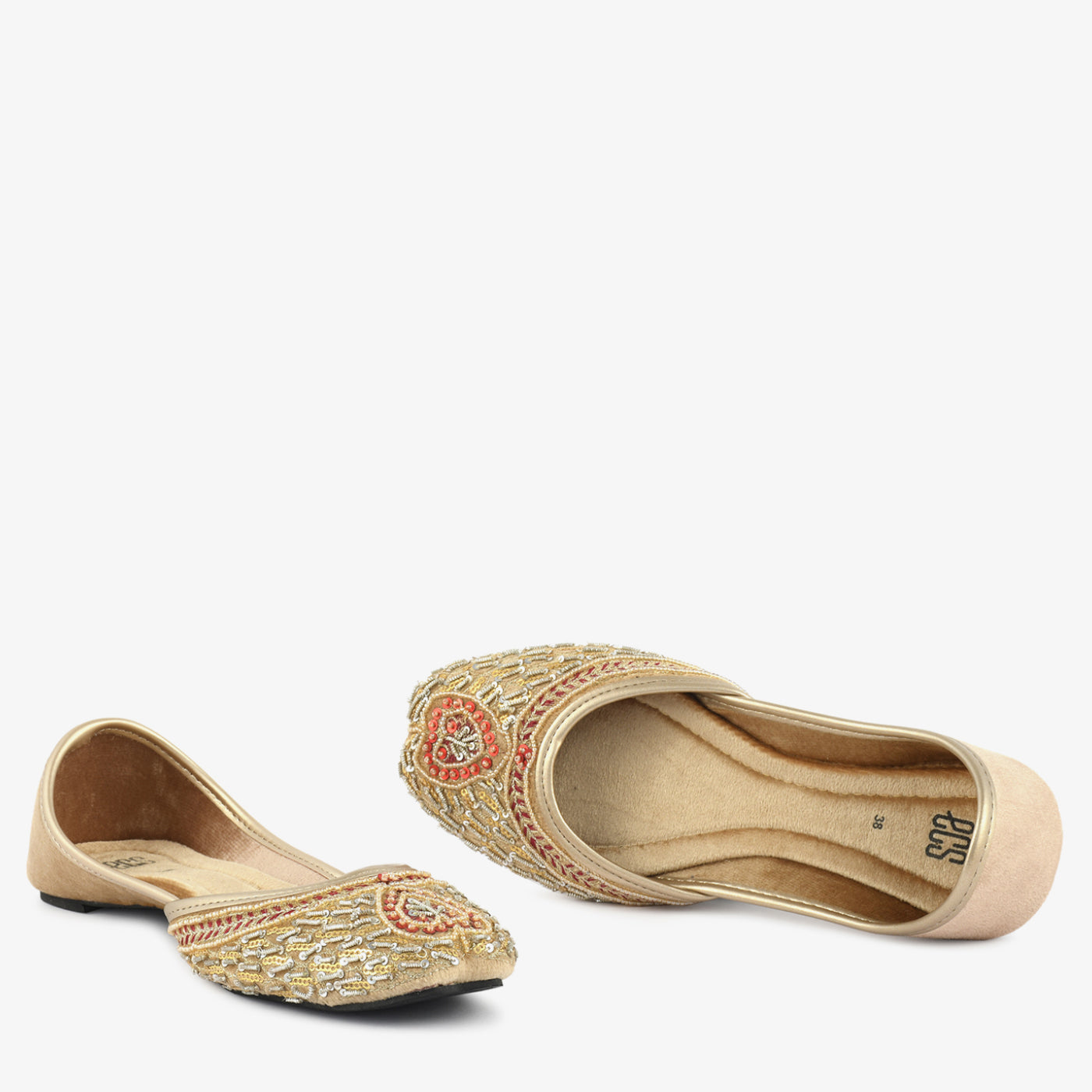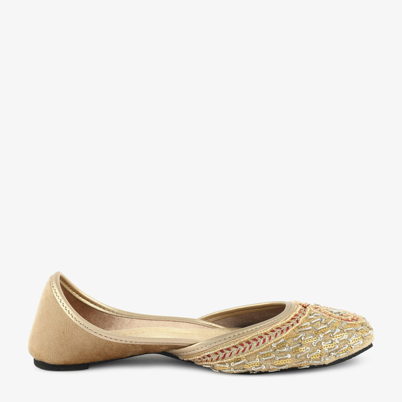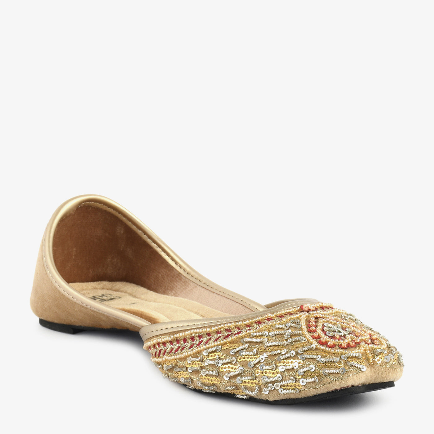 Designed with traditional charm and elegant craftsmanship, this women’s khussa features a beautifully embroidered upper adorned with intricate zari and sequin detailing. The decorative patterns add a rich and festive touch, making it a perfect choice for special occasions and cultural wear. Its closed-toe khussa design keeps the look graceful while providing a comfortable and secure fit. The soft inner lining and cushioned footbed support comfortable steps, while the lightweight sole allows smooth and easy movement throughout the day. Ideal for festive gatherings or traditional outfits, this khussa blends heritage style with everyday comfort.