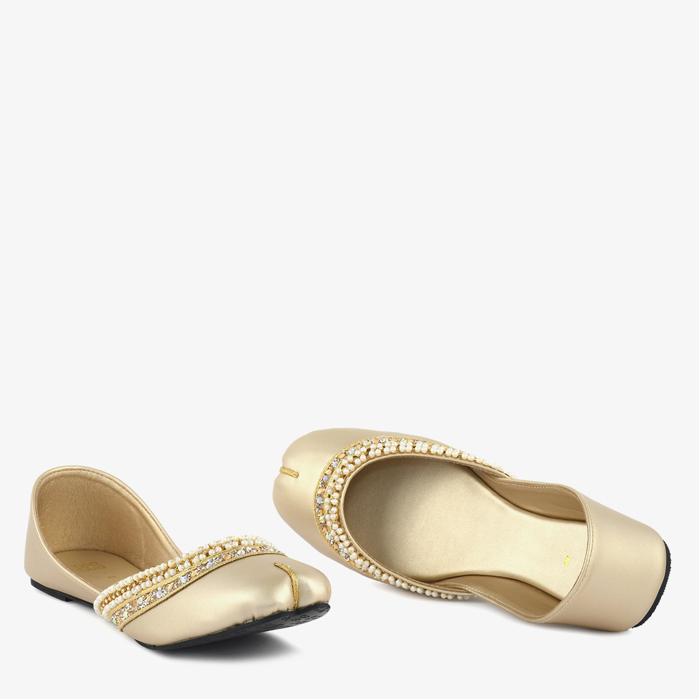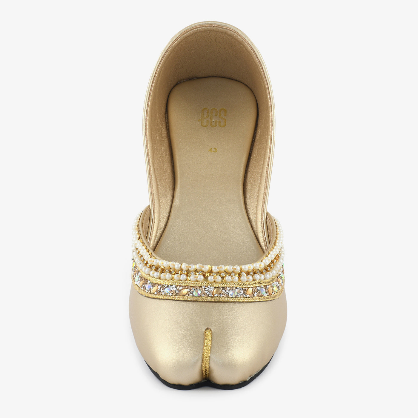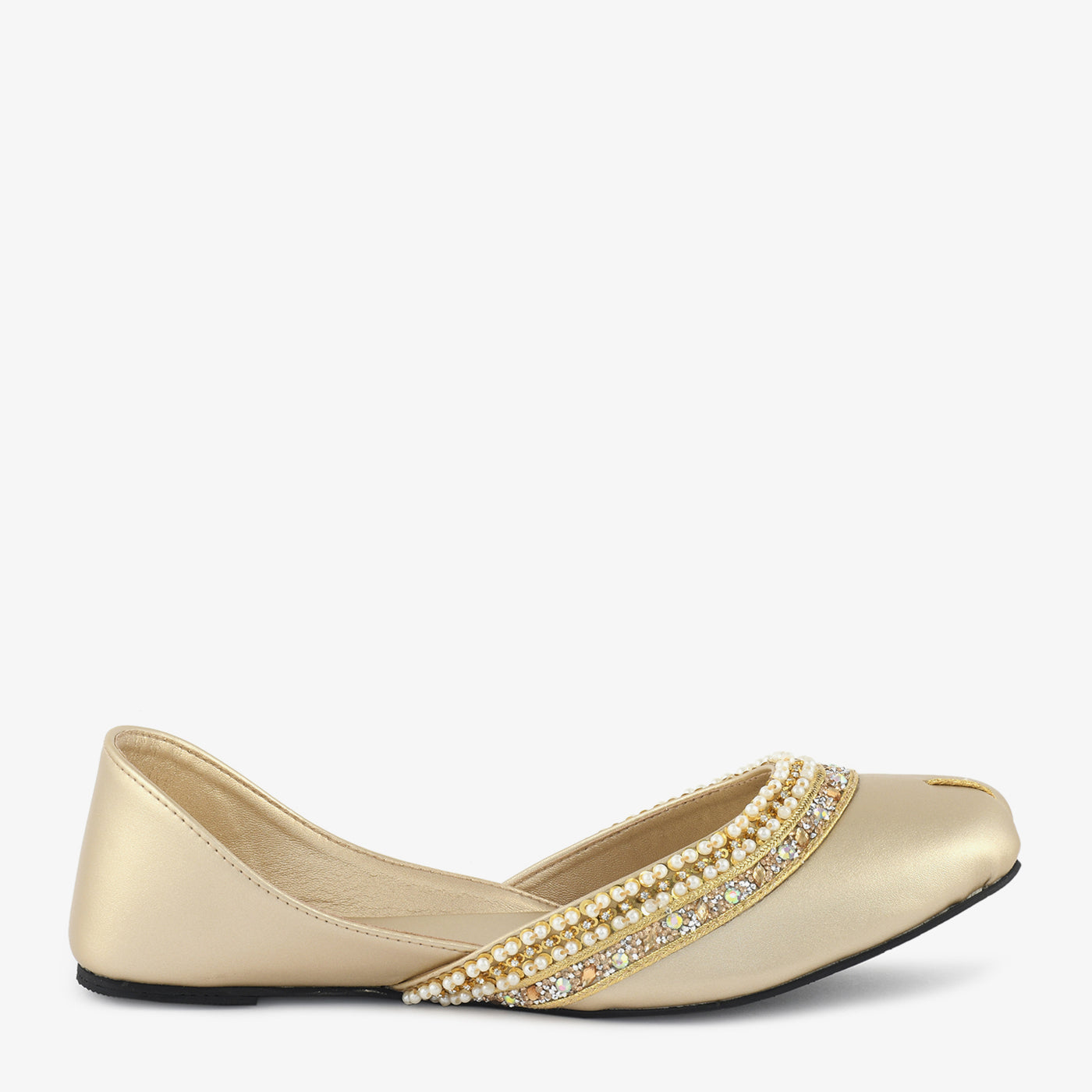 A beautifully detailed khussa embellished with pearls and stones, blending traditional elegance with modern charm. Soft insole makes it perfect for extended wear.