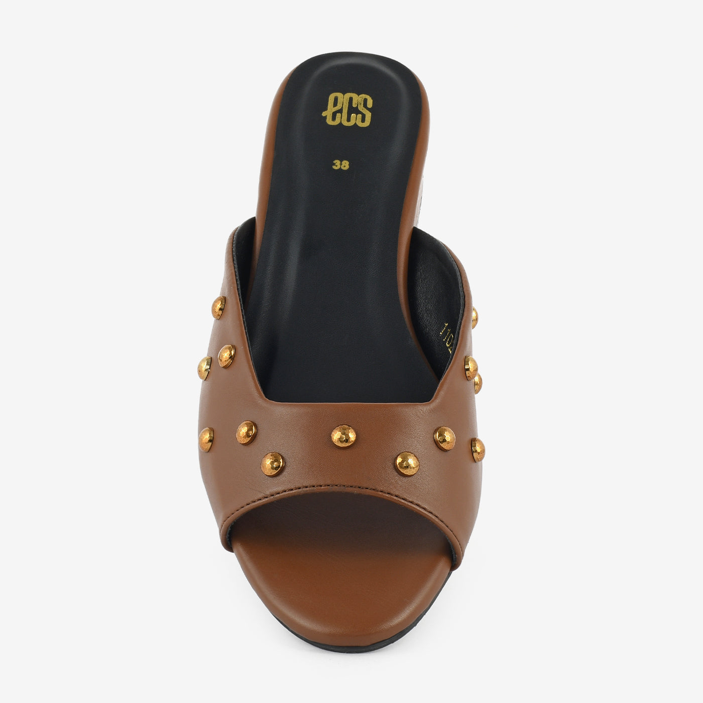 - Design: Slip-on heeled slipper with decorative stud accents