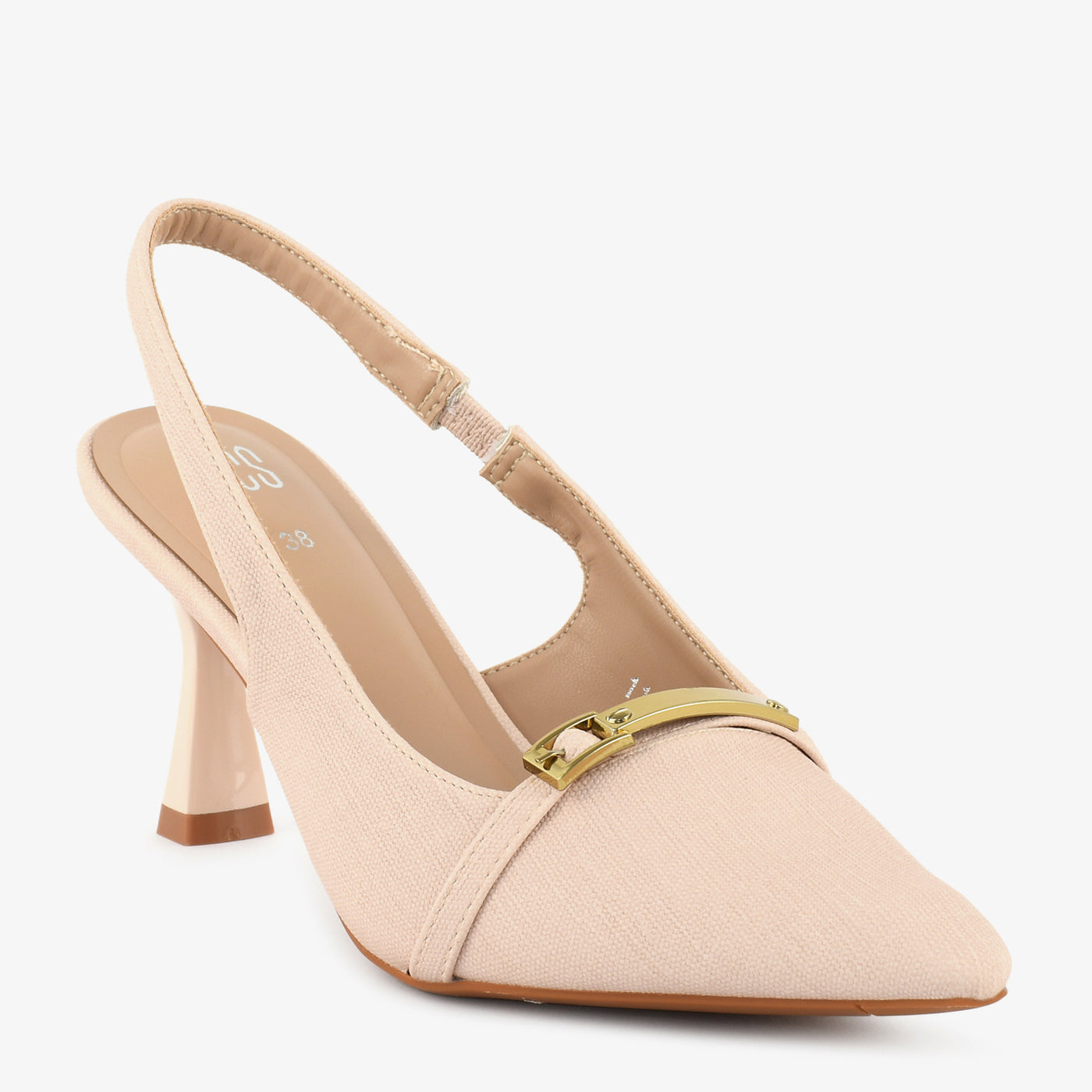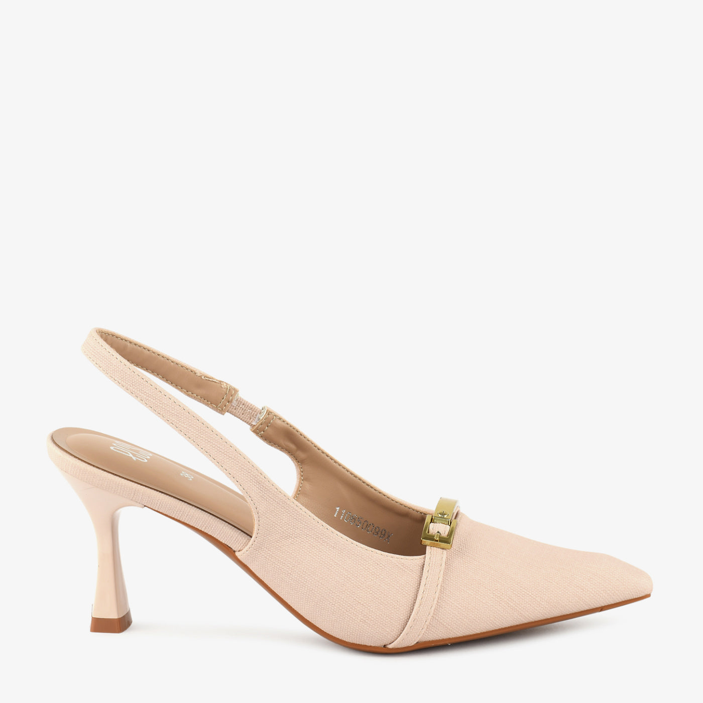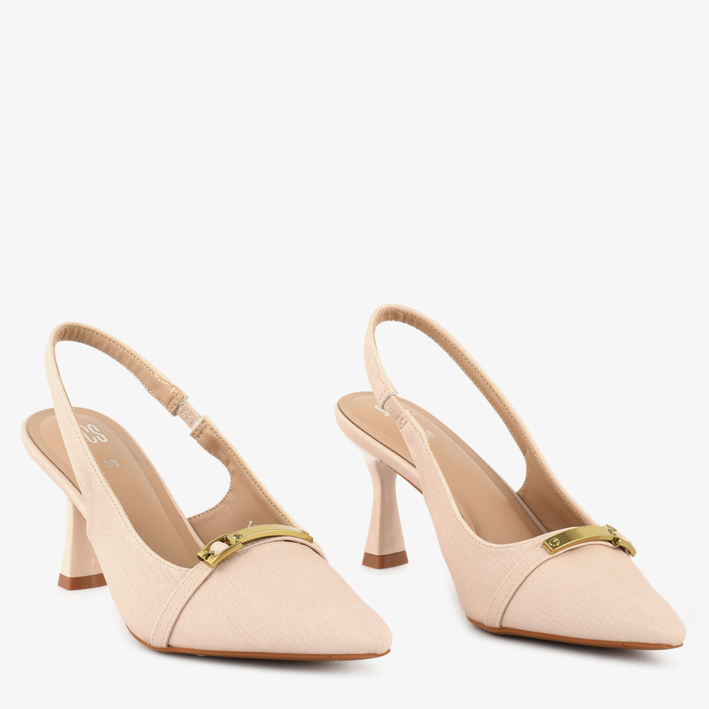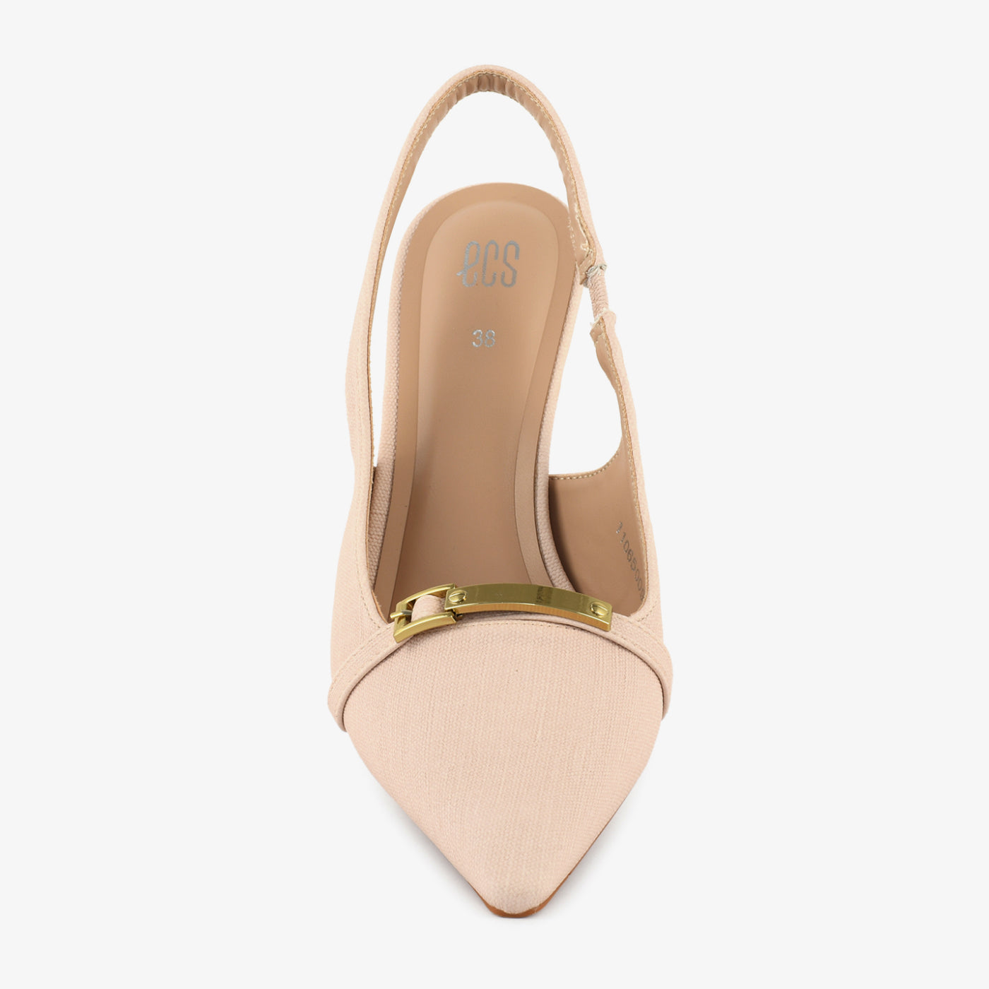 A refined sling-back court shoe crafted for timeless grace and comfort. Its sharp pointed toe and sleek profile make it a perfect balance of elegance and sophistication. The cushioned insole ensures relaxed wear, while the structured shape offers a flattering refined look. A subtle metallic detail adds a polished touch to your steps, making it ideal for formal or festive occasions.