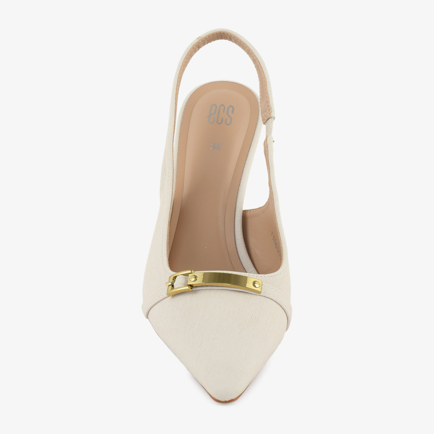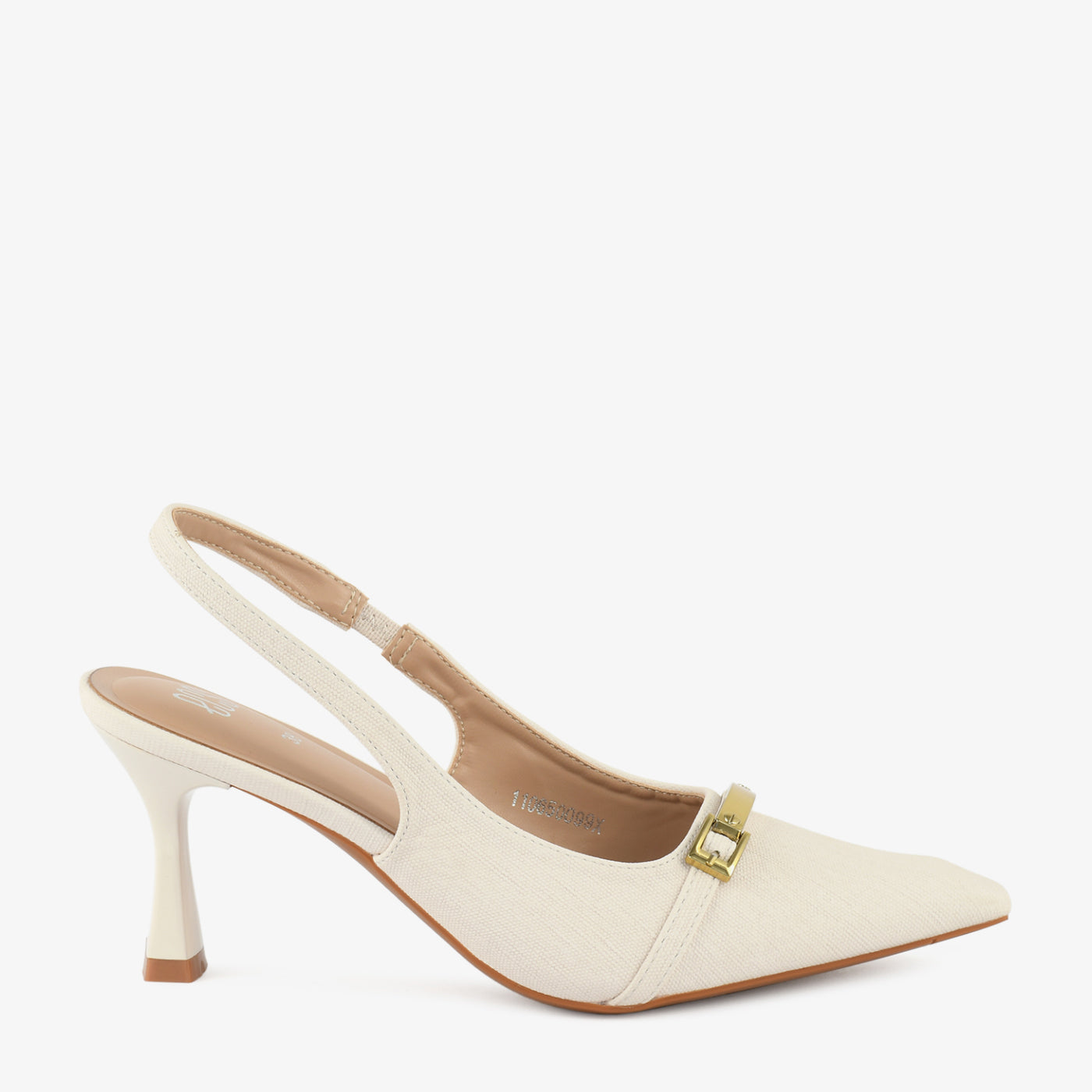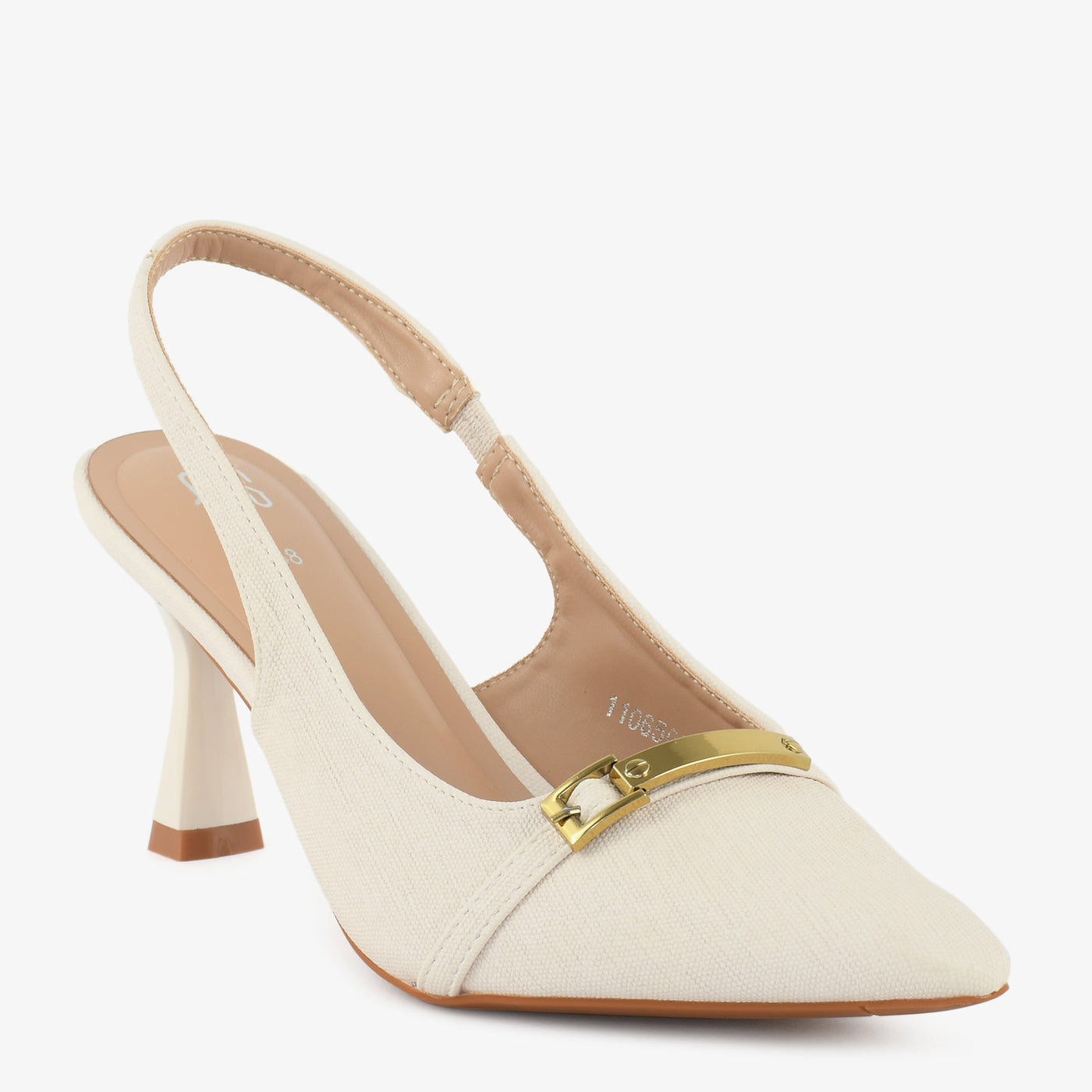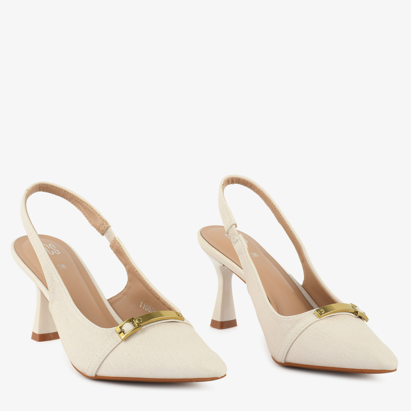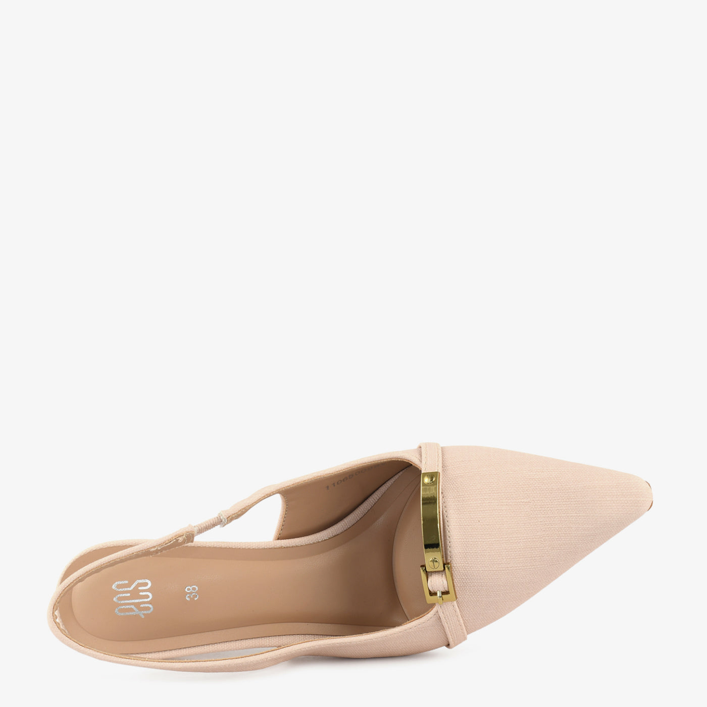 A refined sling-back court shoe crafted for timeless grace and comfort. Its sharp pointed toe and sleek profile make it a perfect balance of elegance and sophistication. The cushioned insole ensures relaxed wear, while the structured shape offers a flattering refined look. A subtle metallic detail adds a polished touch to your steps, making it ideal for formal or festive occasions.