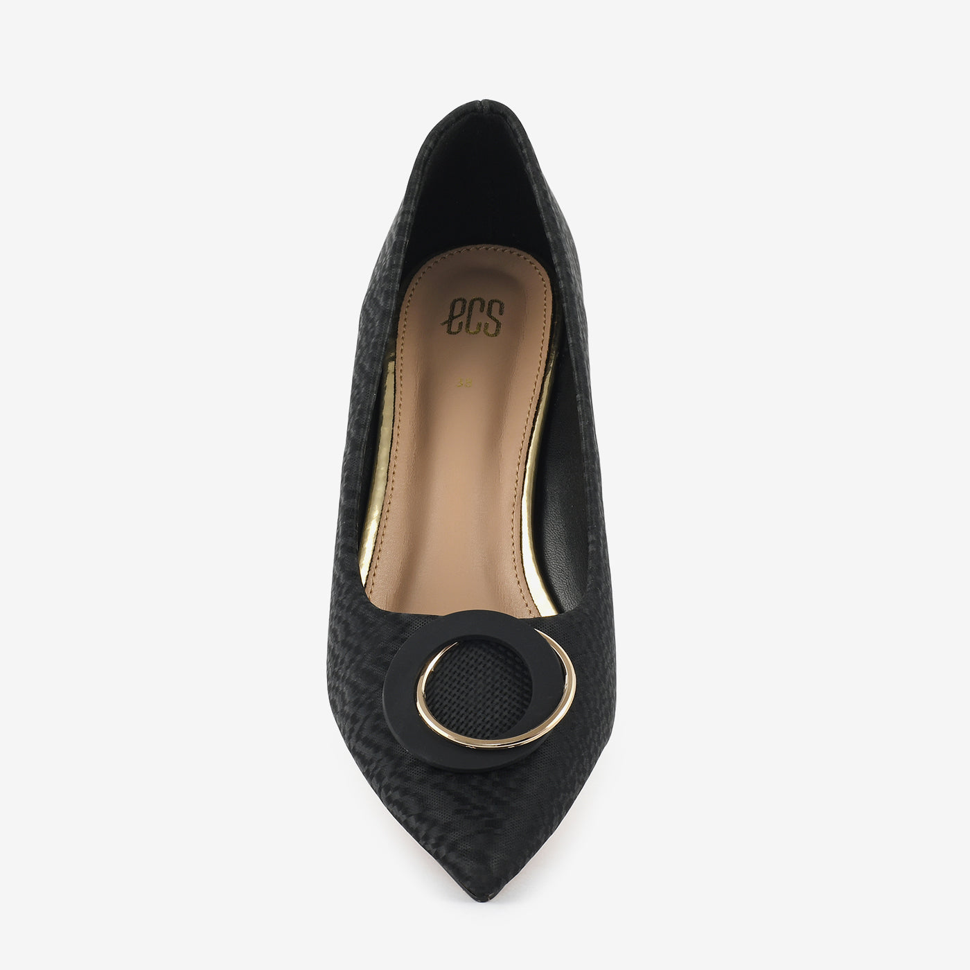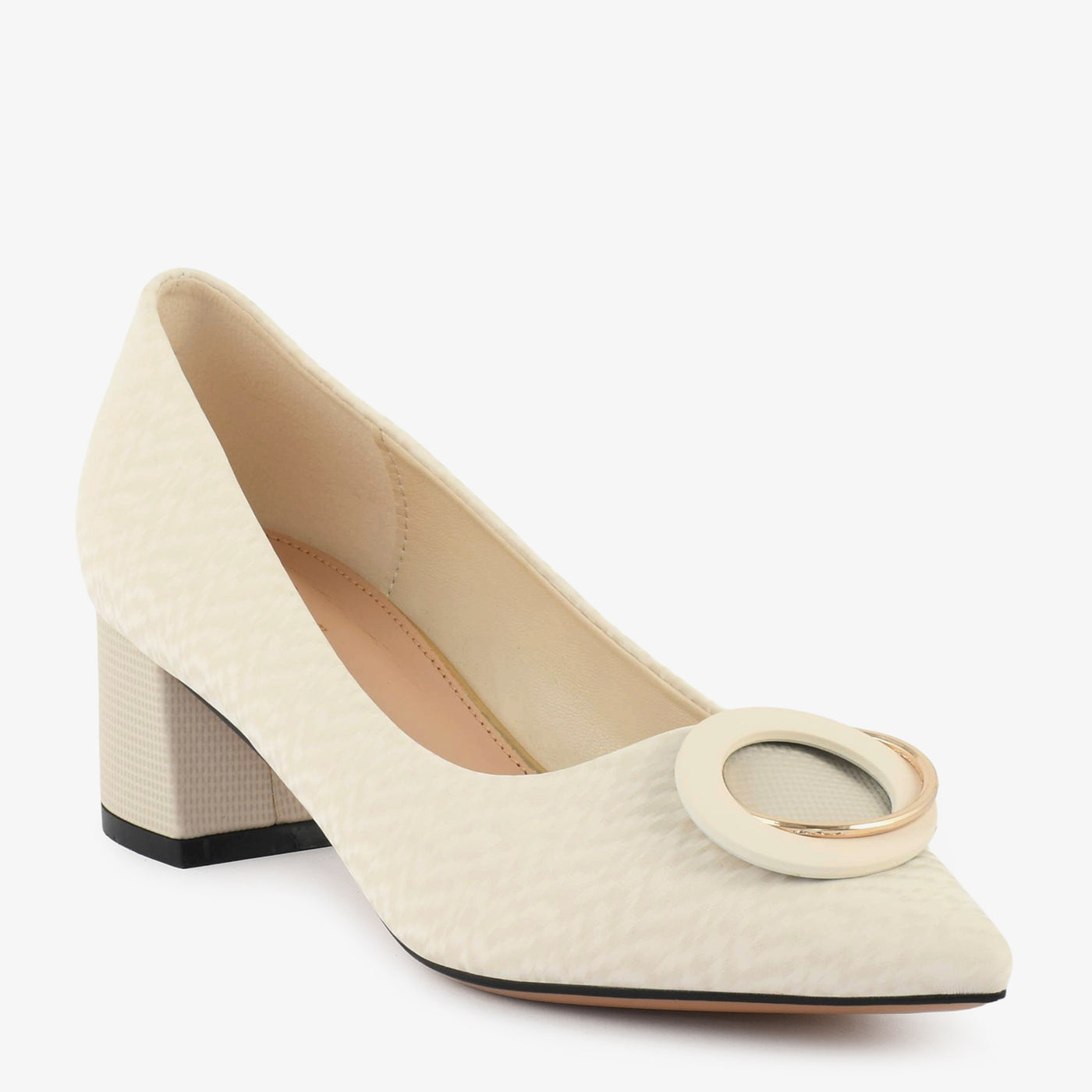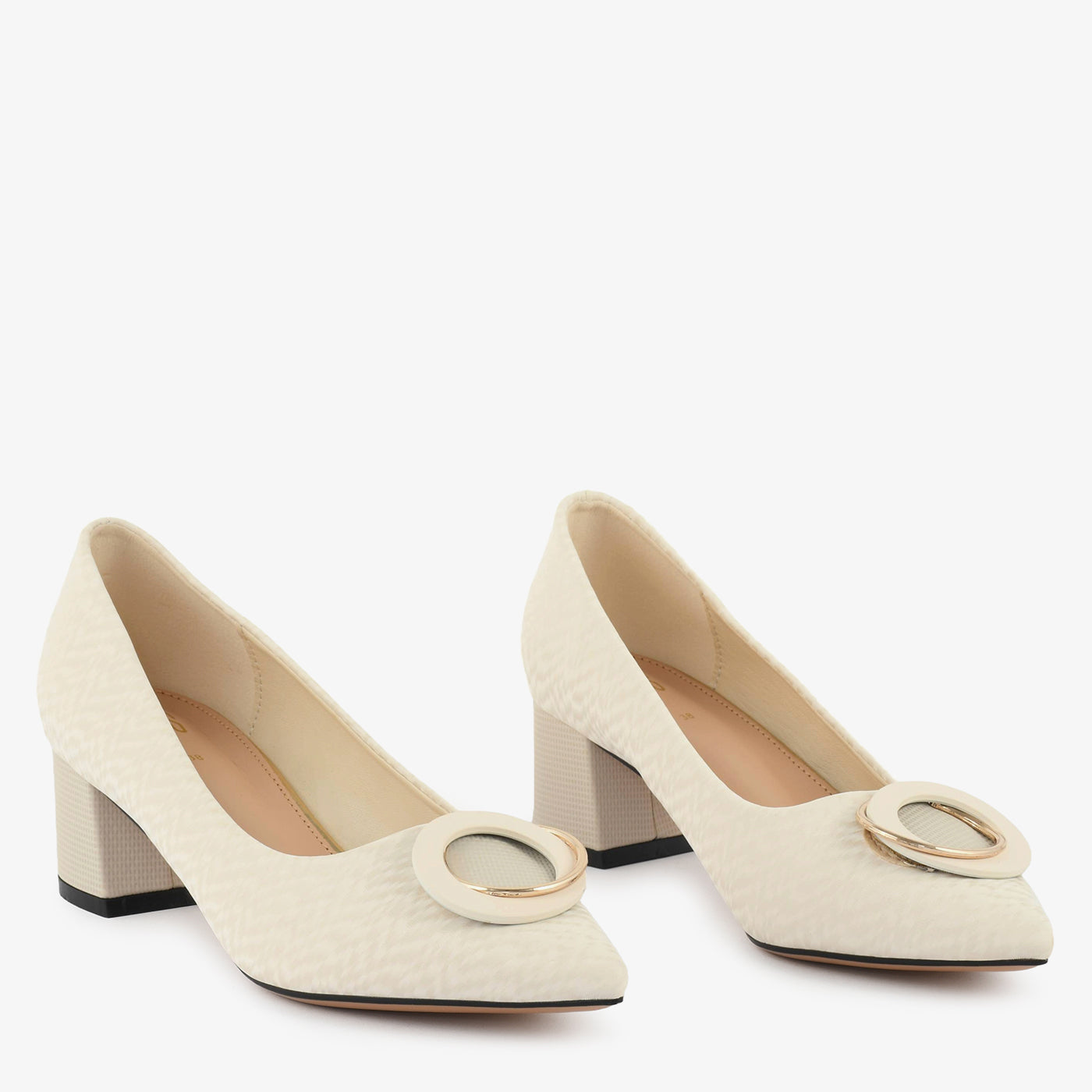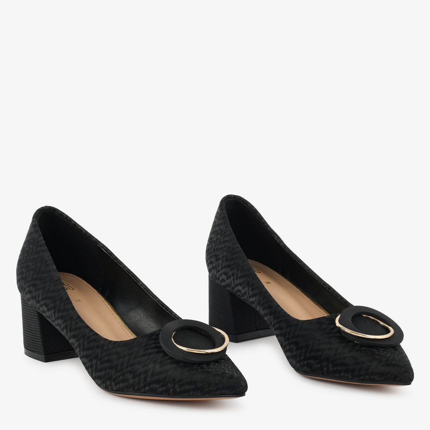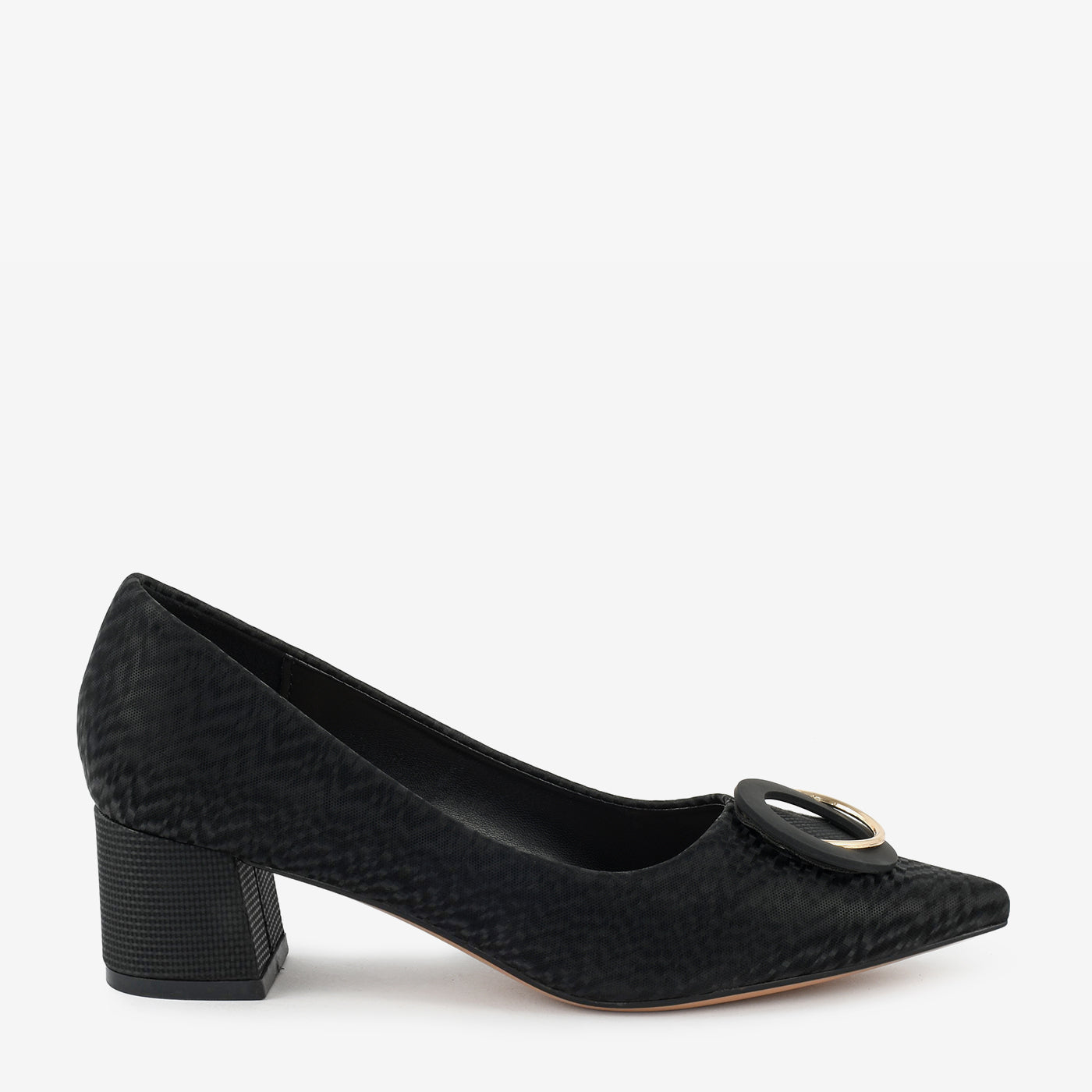 A refined coat shoe designed to bring polished elegance to everyday formalwear. The textured upper and structured pointed silhouette offer a sleek, confident presence, while the circular ornament adds a modern touch of sophistication. Its stable block heel ensures lasting comfort throughout long workdays, making it ideal for coat-shoe styling. Perfect for office routines, business meetings, and modest formal settings.