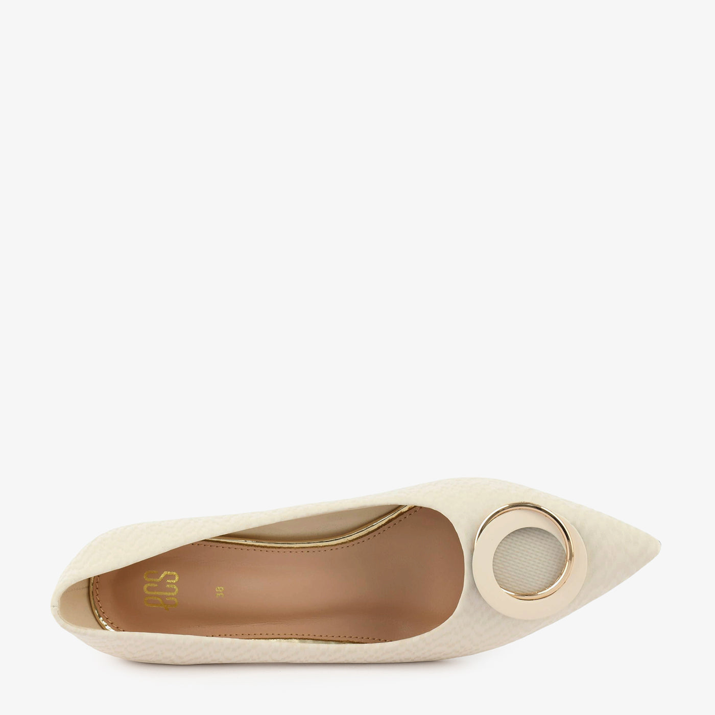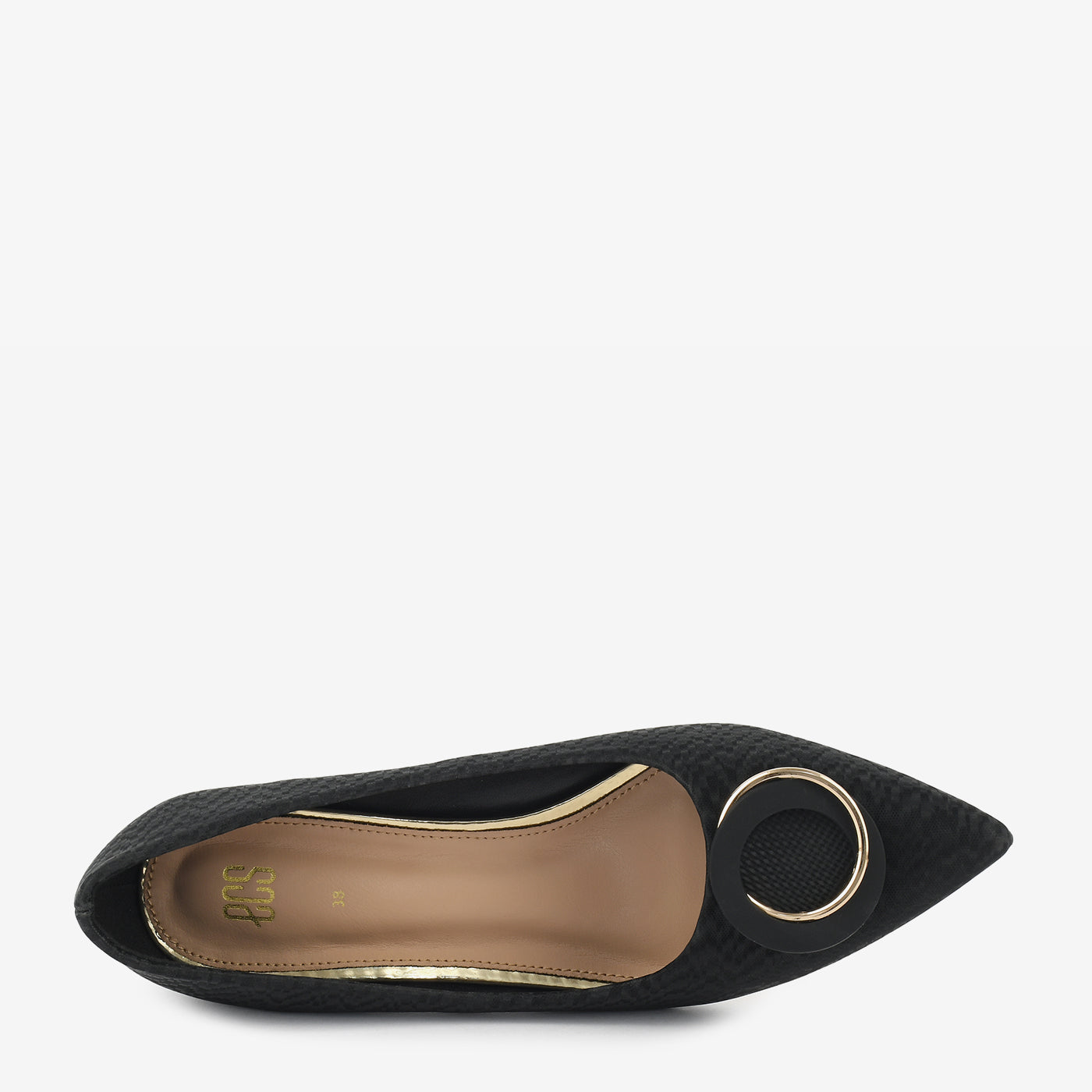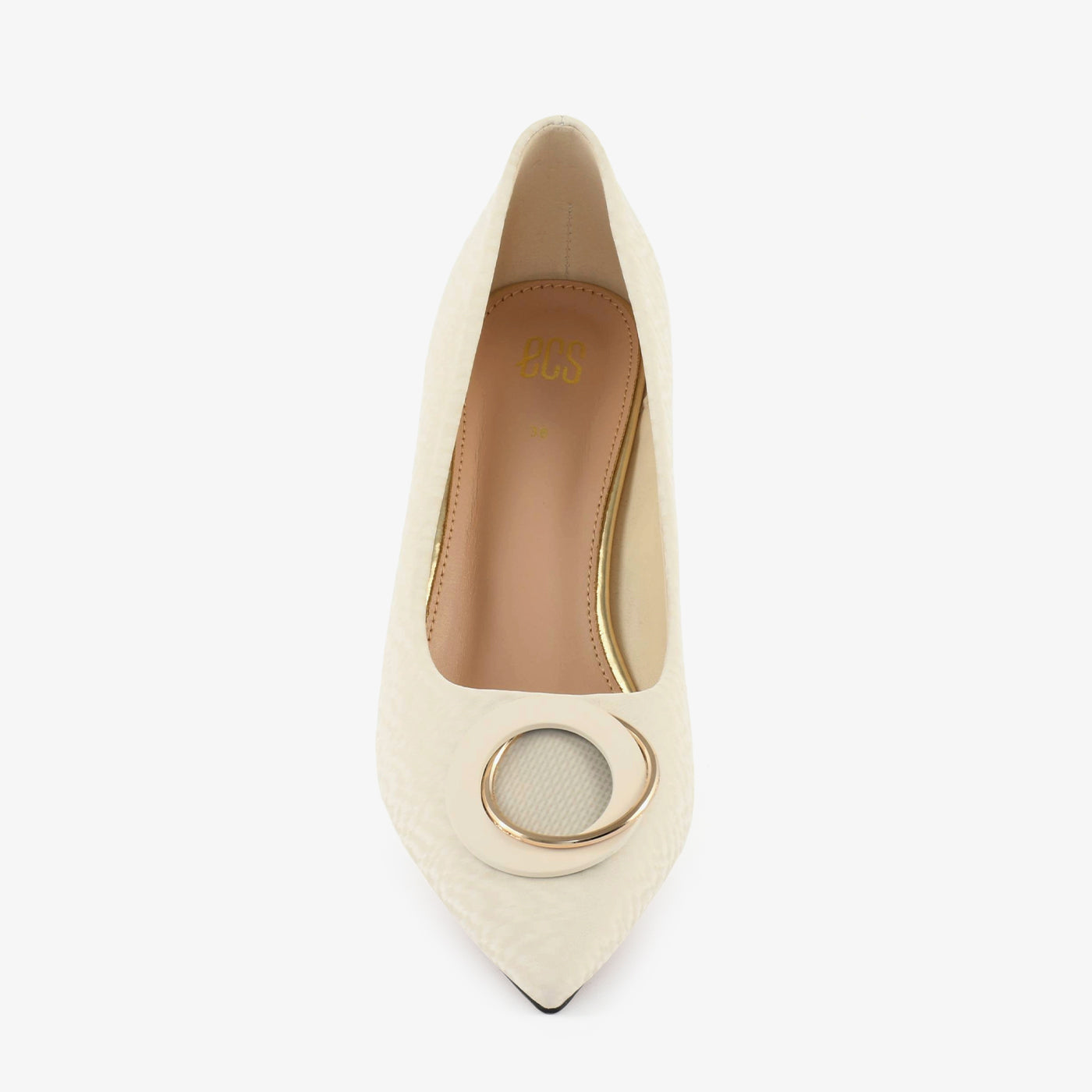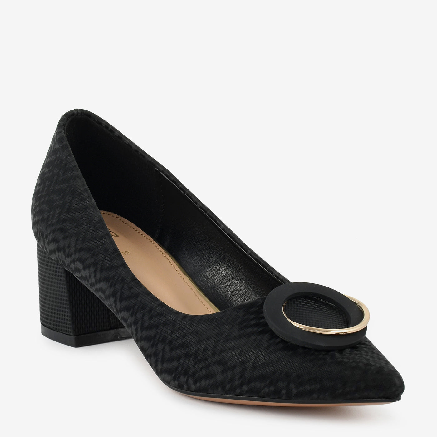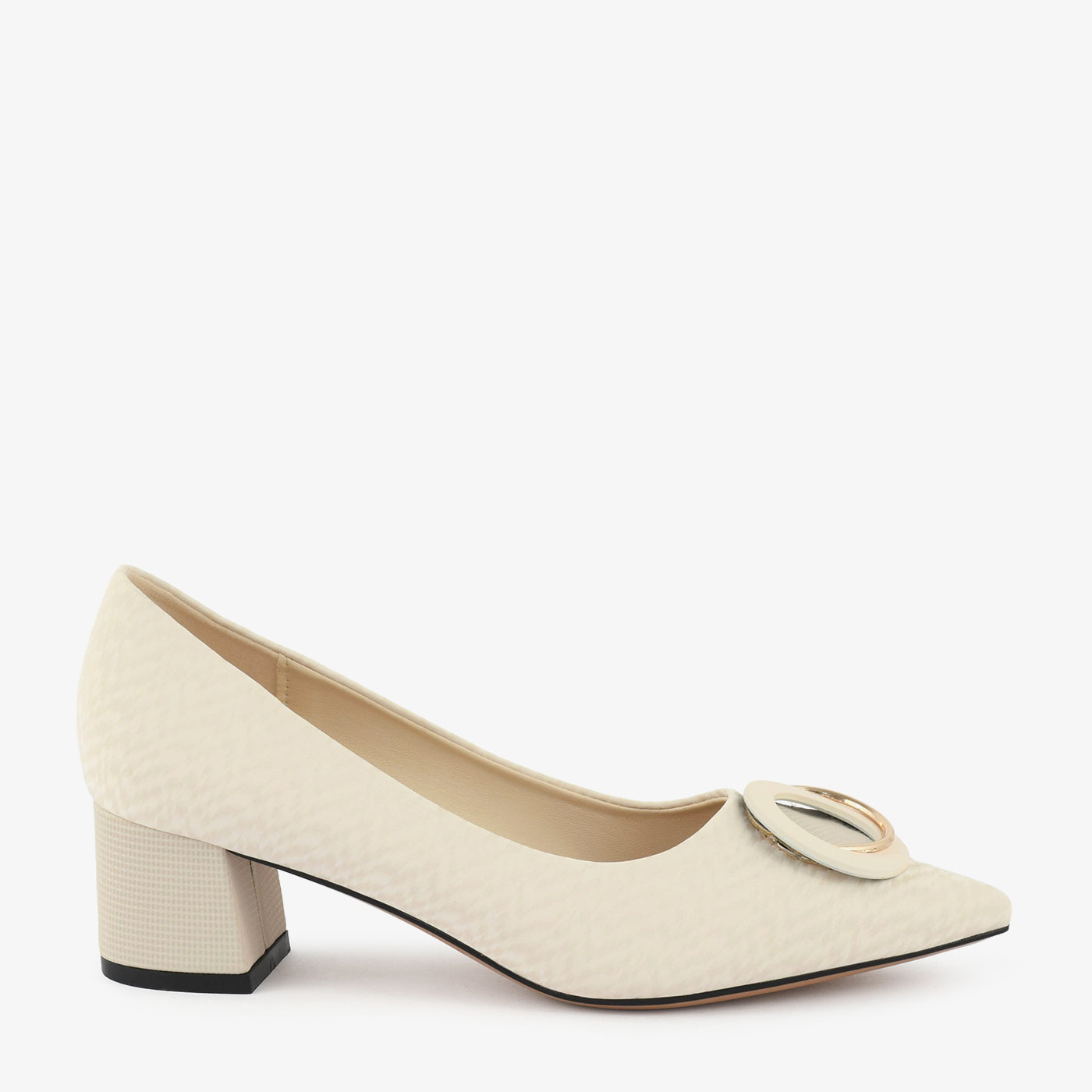 A refined coat shoe designed to bring polished elegance to everyday formalwear. The textured upper and structured pointed silhouette offer a sleek, confident presence, while the circular ornament adds a modern touch of sophistication. Its stable block heel ensures lasting comfort throughout long workdays, making it ideal for coat-shoe styling. Perfect for office routines, business meetings, and modest formal settings.