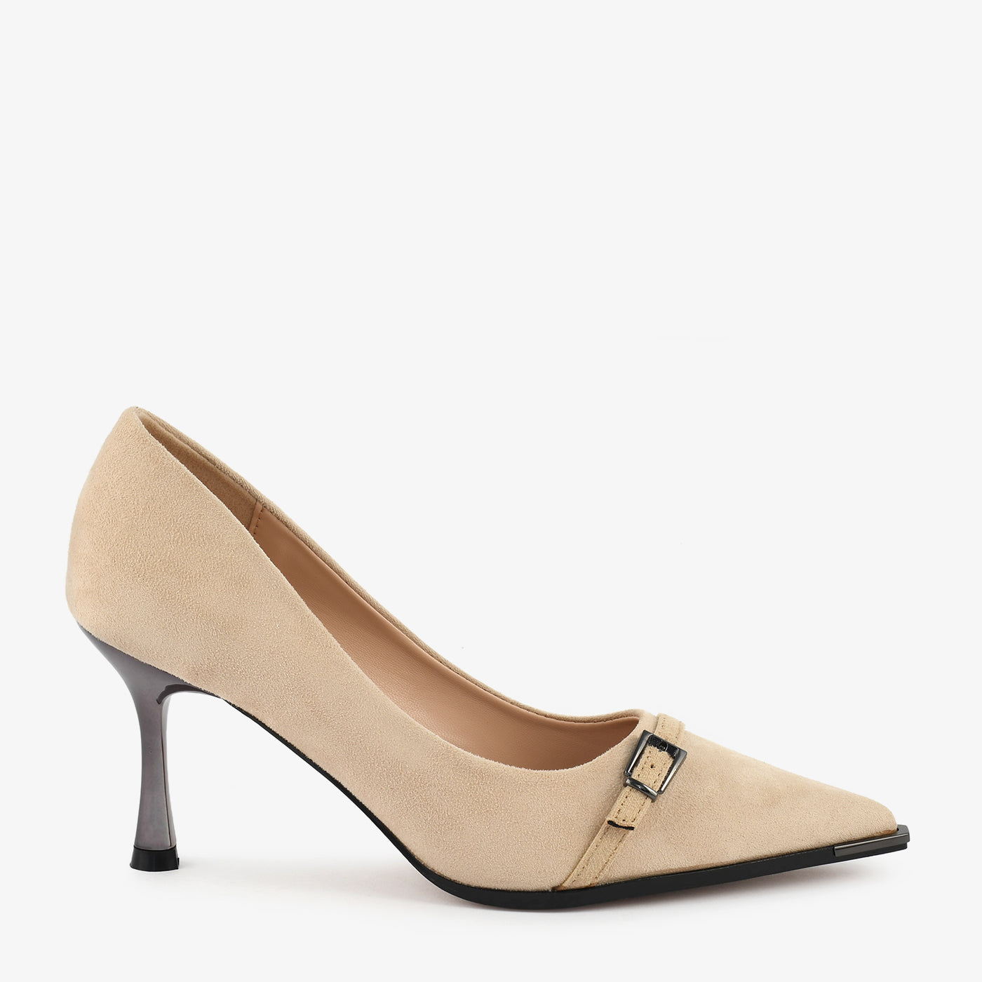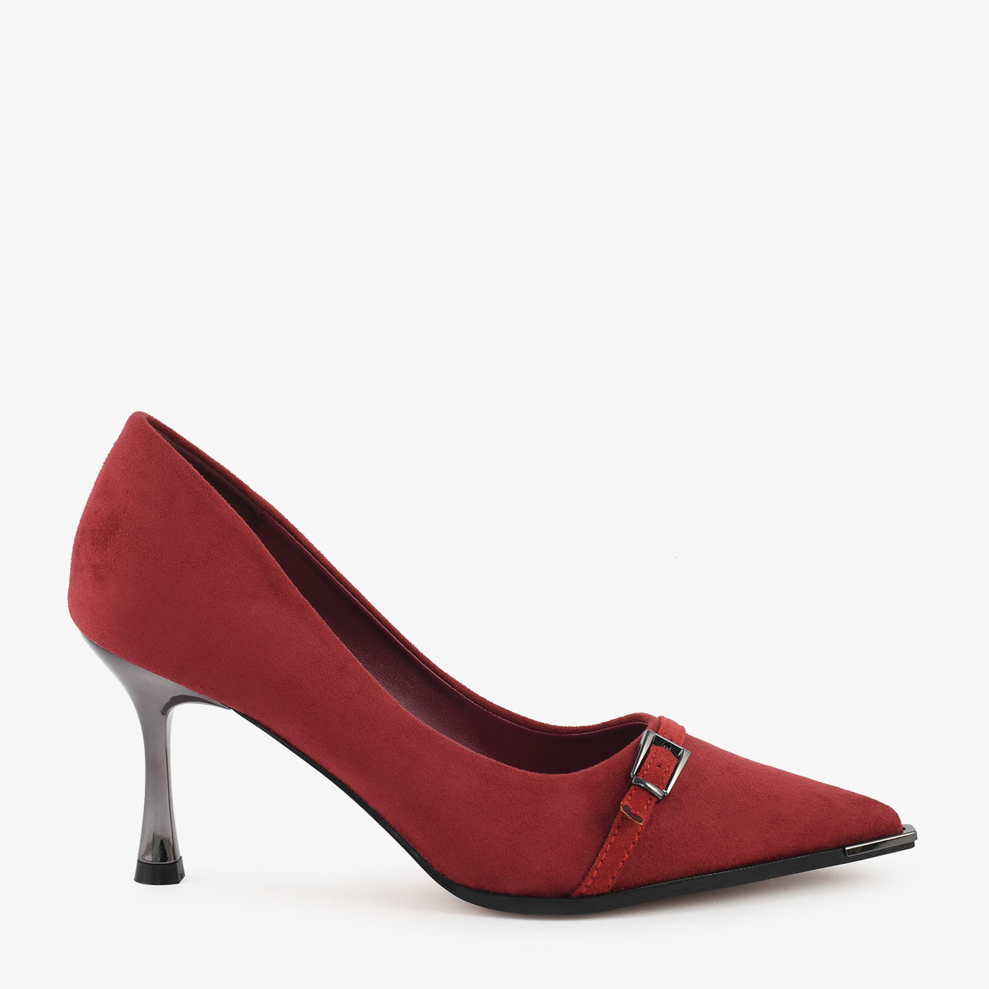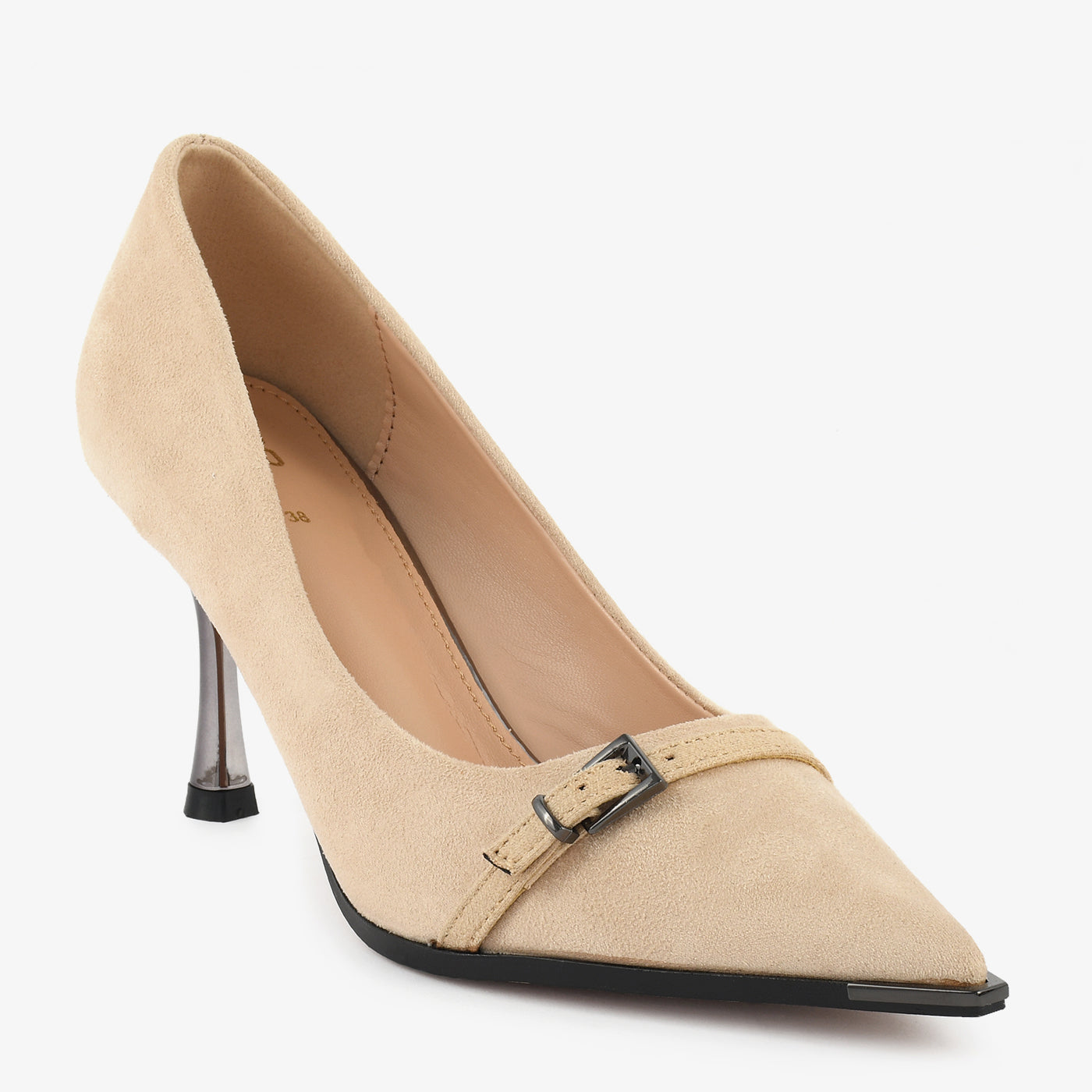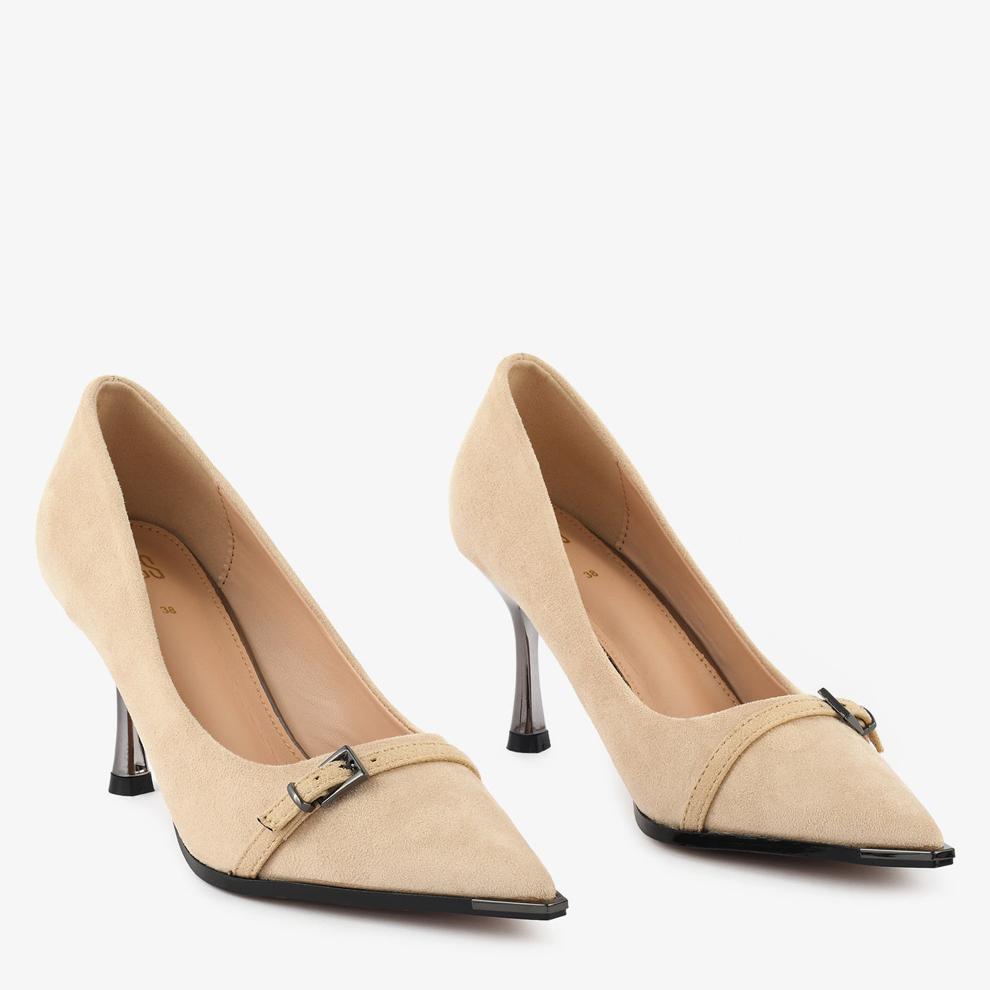 A modern coat shoe designed with a pointed toe and sleek buckle strap for a refined appearance. Its narrow heel and smooth texture make it ideal for formal and professional settings.