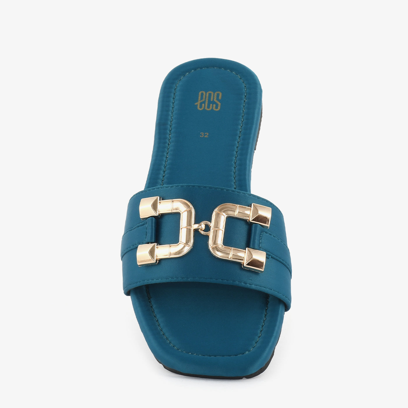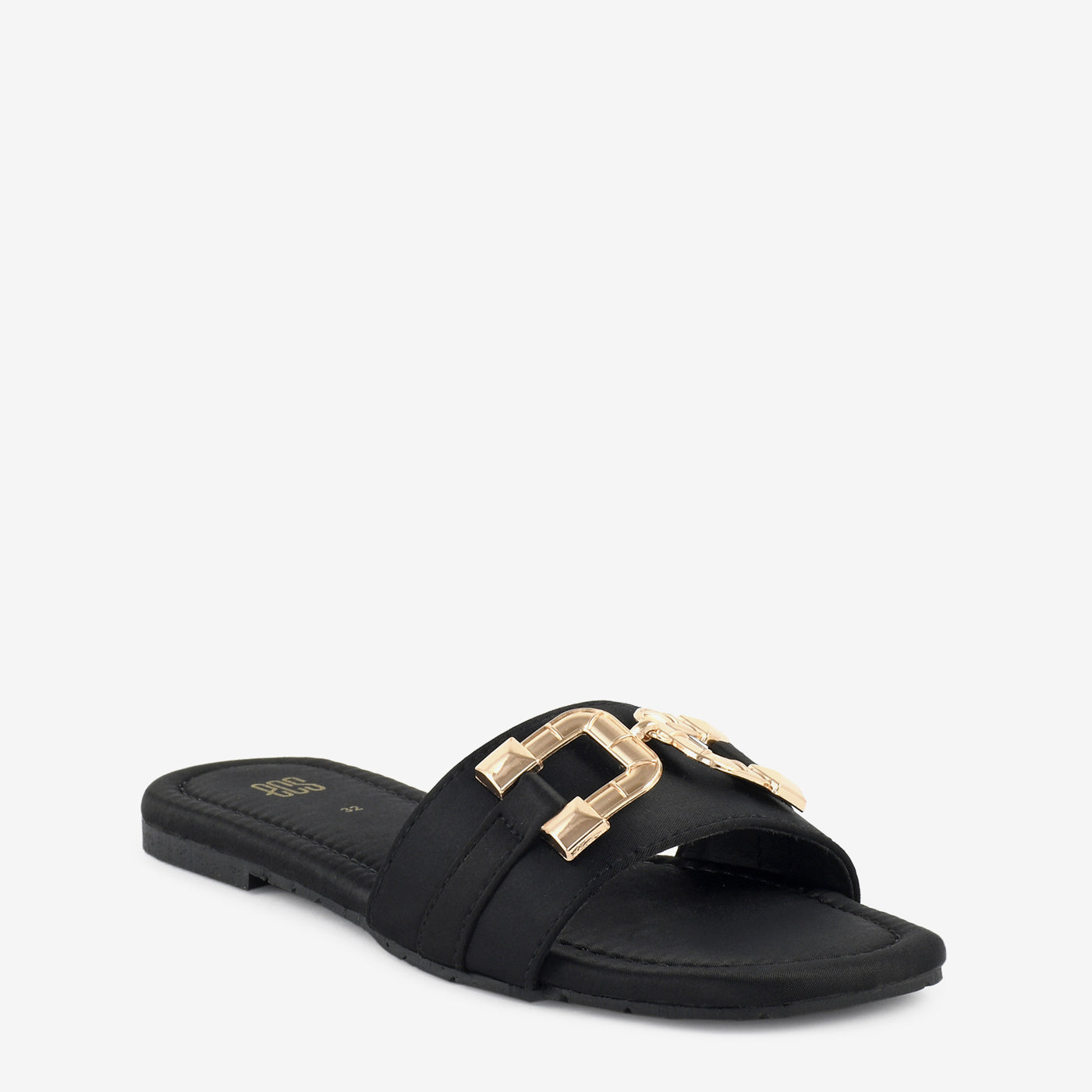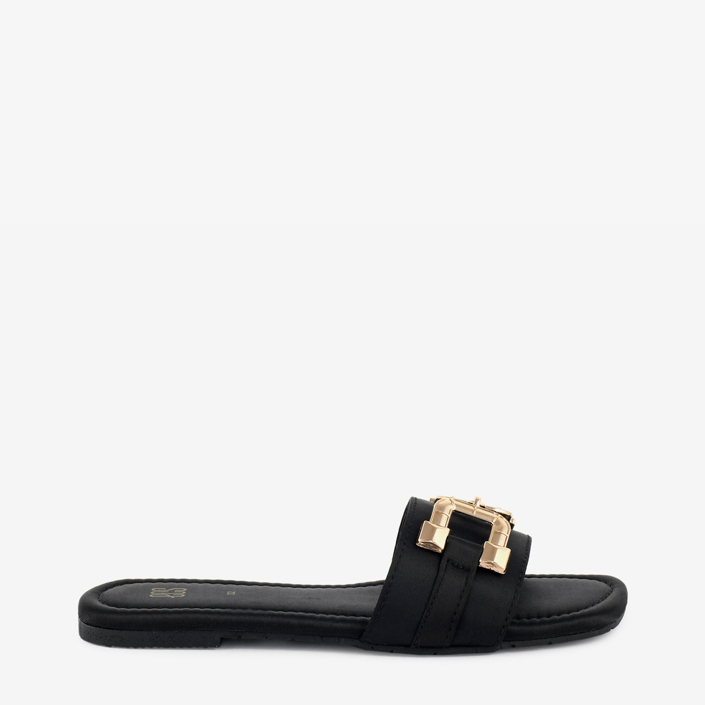 This stylish slipper features a clean and modern design with a sleek upper enhanced by bold metallic accents for a standout look. The wide strap offers a secure and comfortable fit, while the cushioned footbed ensures ease throughout the day. Its lightweight sole allows smooth movement, making it perfect for daily wear. The minimal yet striking design adds a contemporary touch to your casual wardrobe. Ideal for quick outings, travel, or relaxed days, it combines comfort with effortless style. A versatile choice that blends simplicity with a fashionable edge.