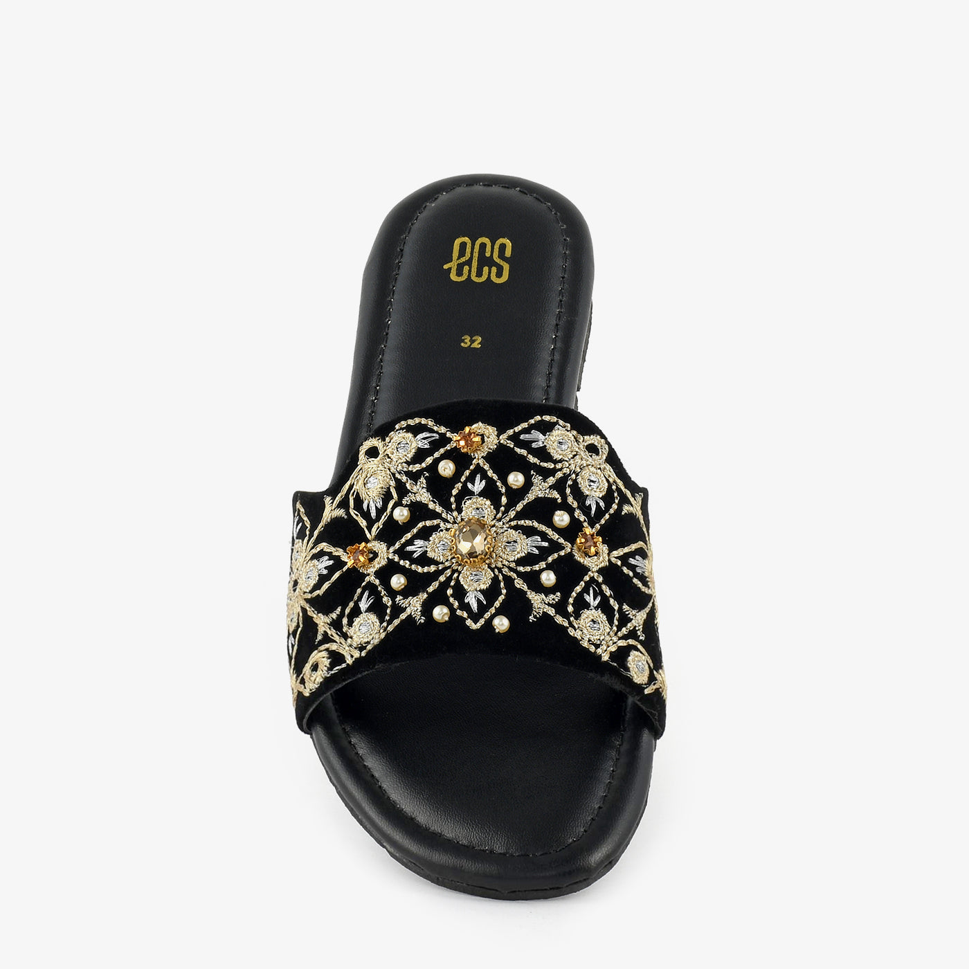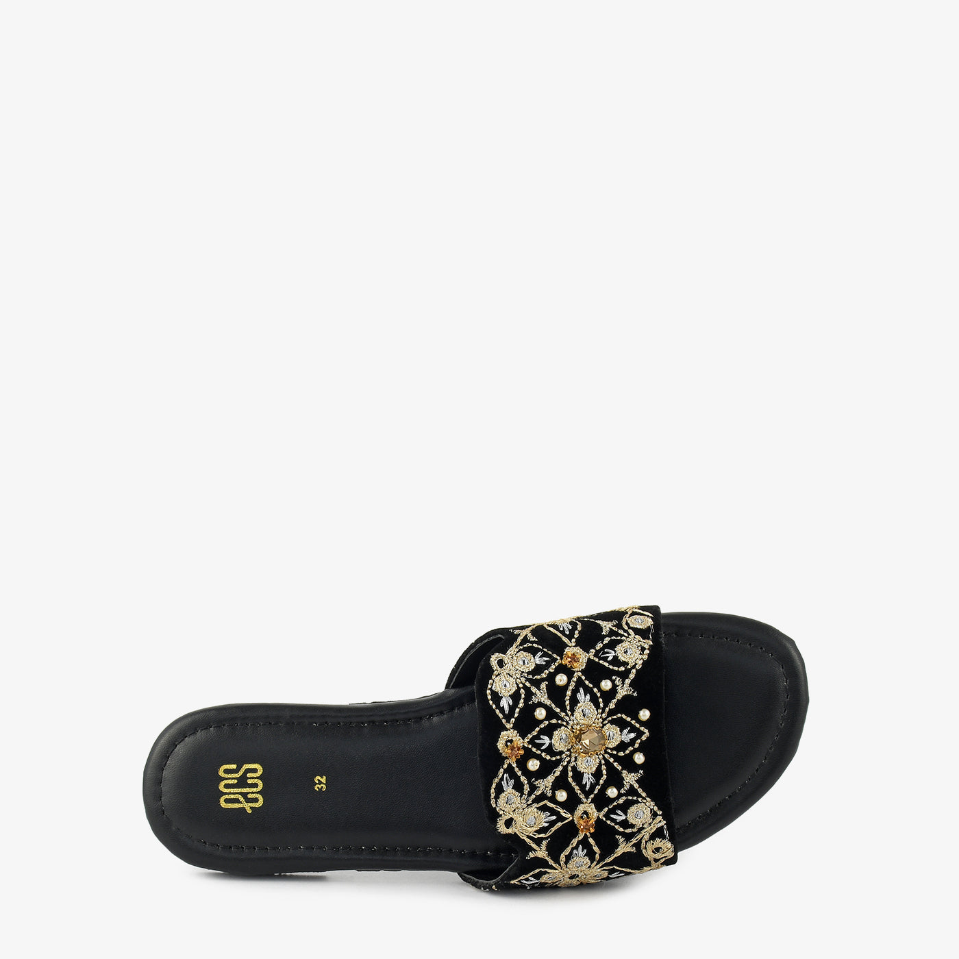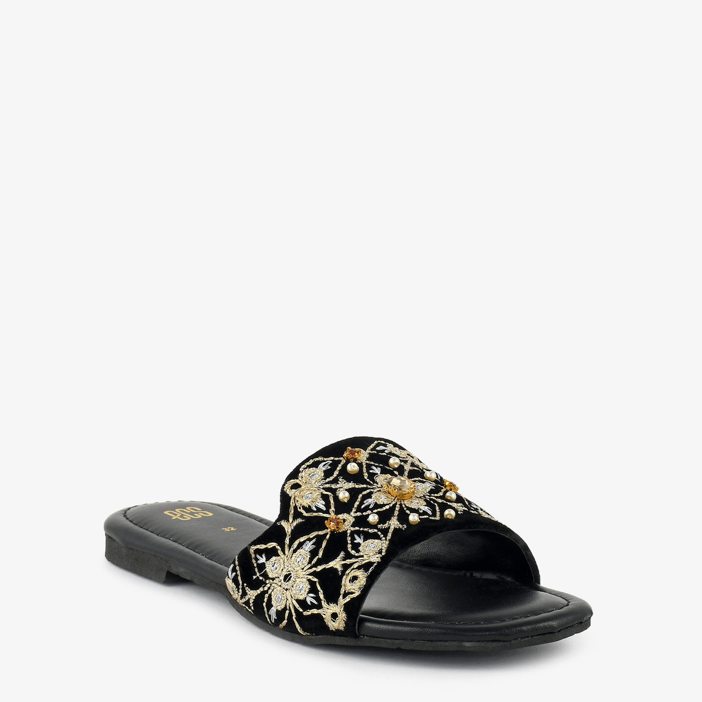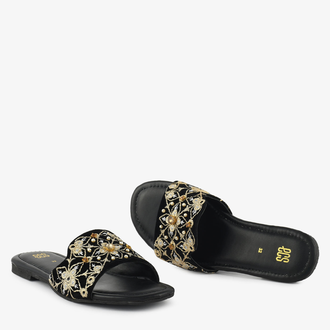 Flat slippers with a wide upper featuring floral embroidery in gold and cream tones with pearl accents. The slip-on design offers effortless wear for special occasions and festive settings. Crafted with a cushioned footbed that provides comfort throughout extended periods. The flat sole ensures ease of movement while maintaining a refined aesthetic. Perfect for celebrations that call for both comfort and decorative detailing. A versatile addition that complements formal separates and festive ensembles with ease.