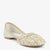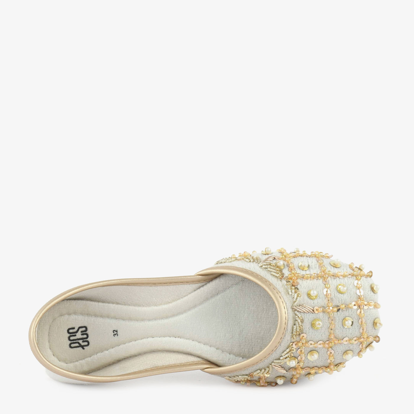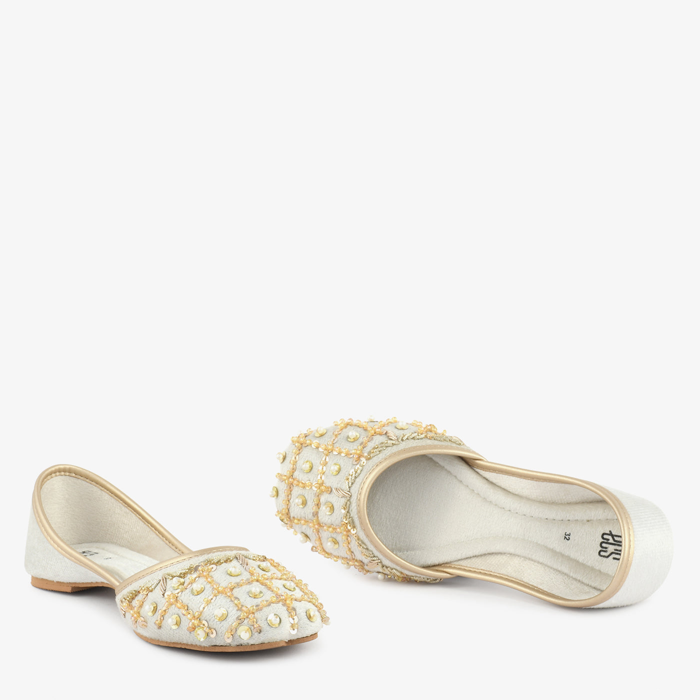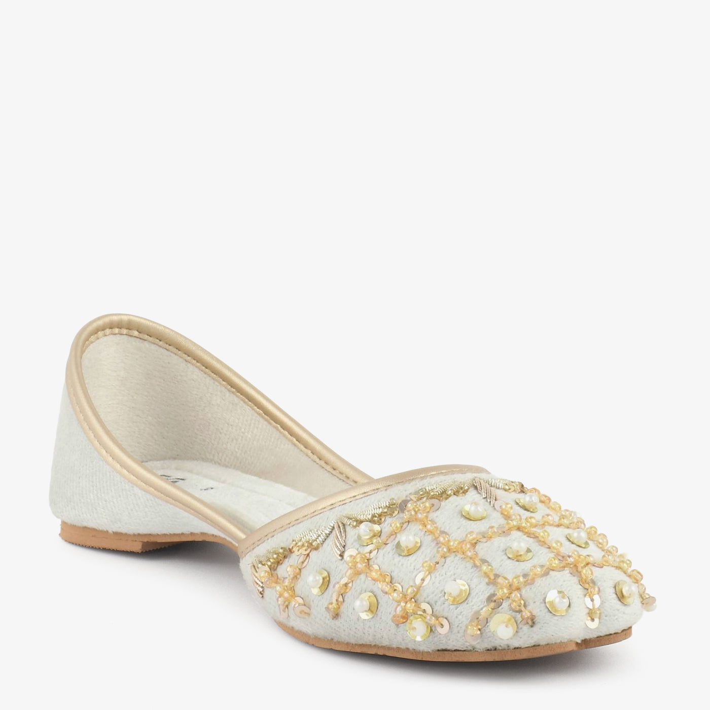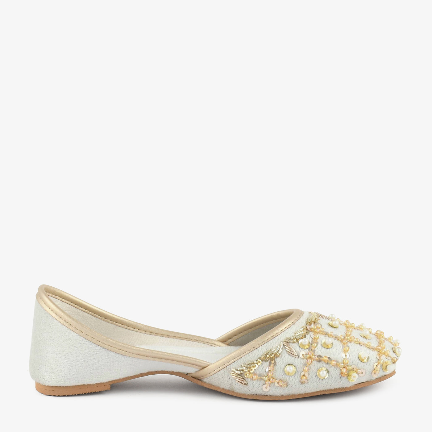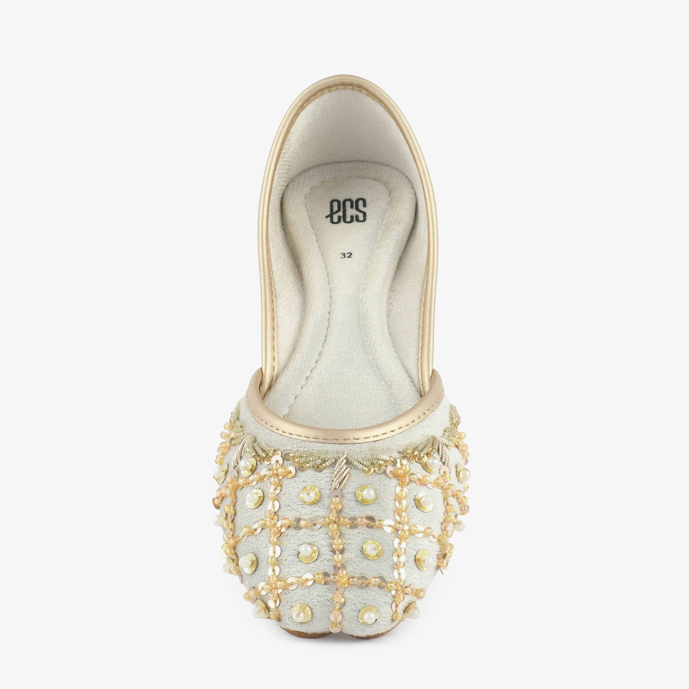 This khussa blends traditional elegance with modern comfort, making it a graceful addition to your footwear collection. The soft textured upper is beautifully adorned with delicate bead and sequin embellishments arranged in an intricate patterned design. Designed in a classic slip-on silhouette, this khussa offers easy wear while maintaining a refined and festive appeal. The lightly cushioned insole ensures comfort for extended hours, making it suitable for gatherings, celebrations, or special daytime events. Crafted with attention to detail, this khussa delivers charm, comfort, and timeless style in one elegant pair.