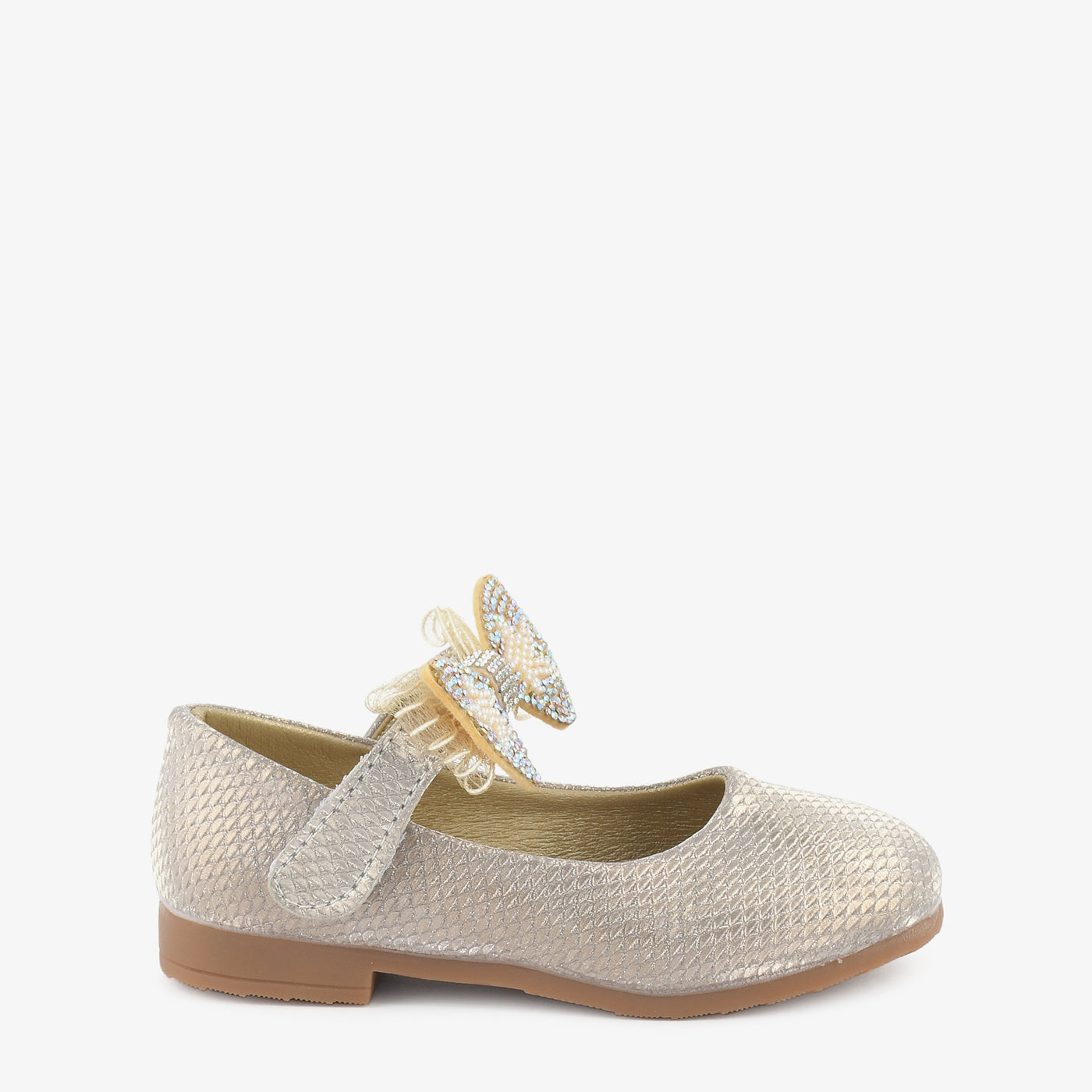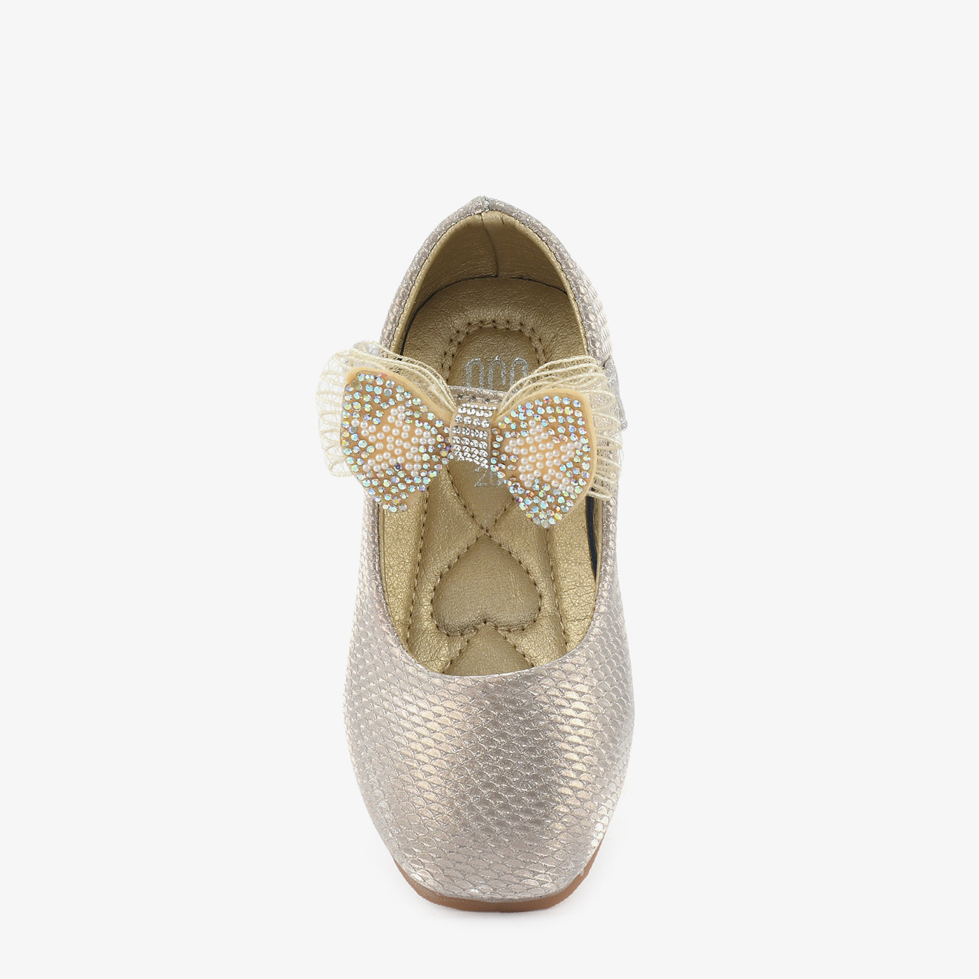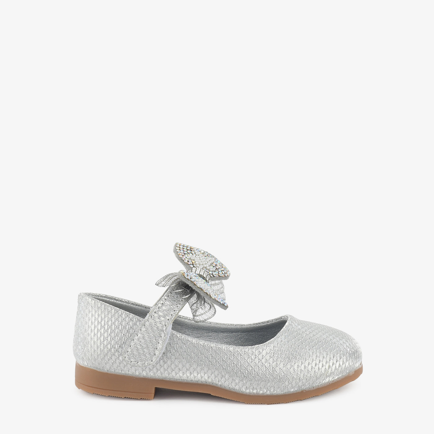 Fun and sparkly, featuring an oversized embellished bow with a glittery touch. The flat sole ensures comfort while maintaining festive flair.
