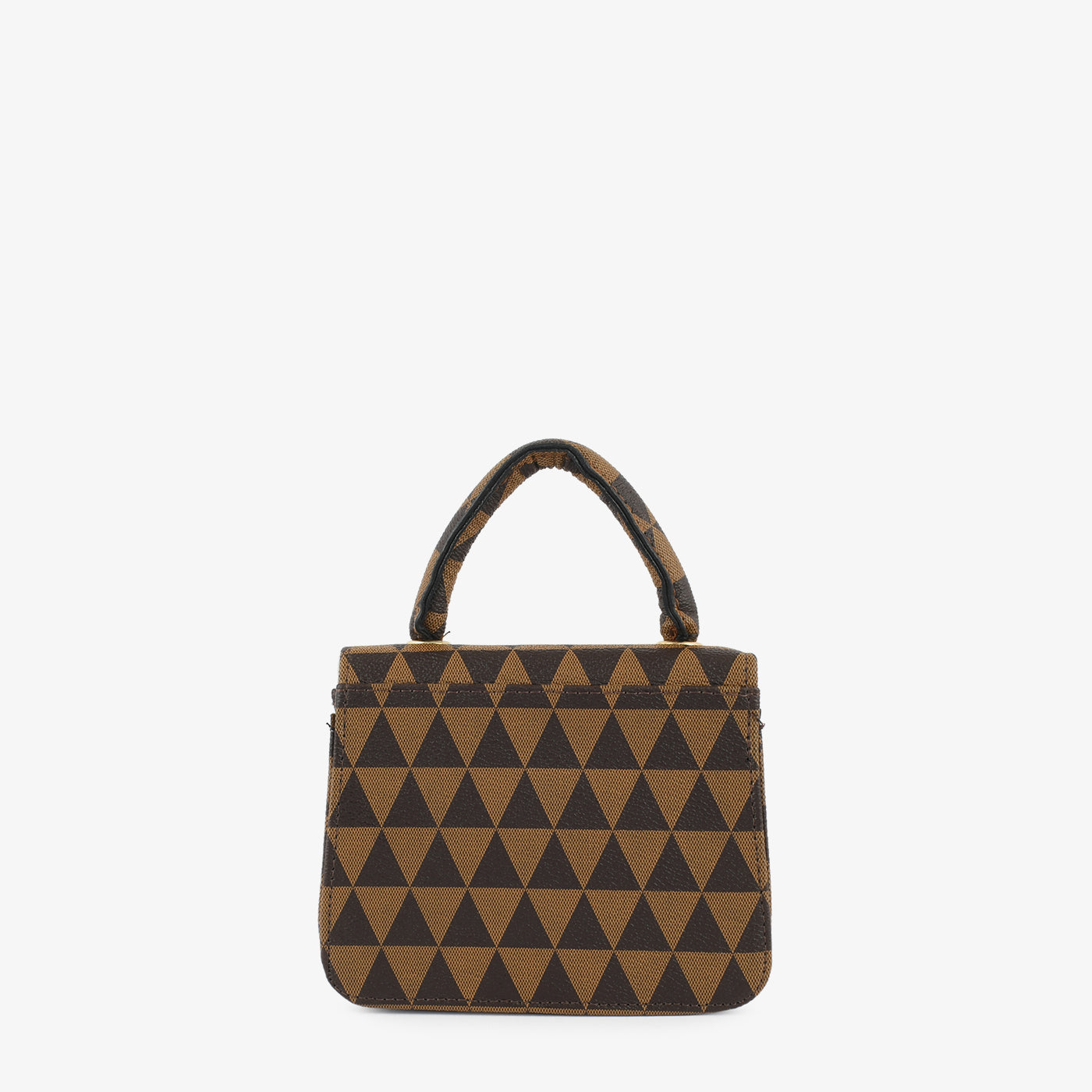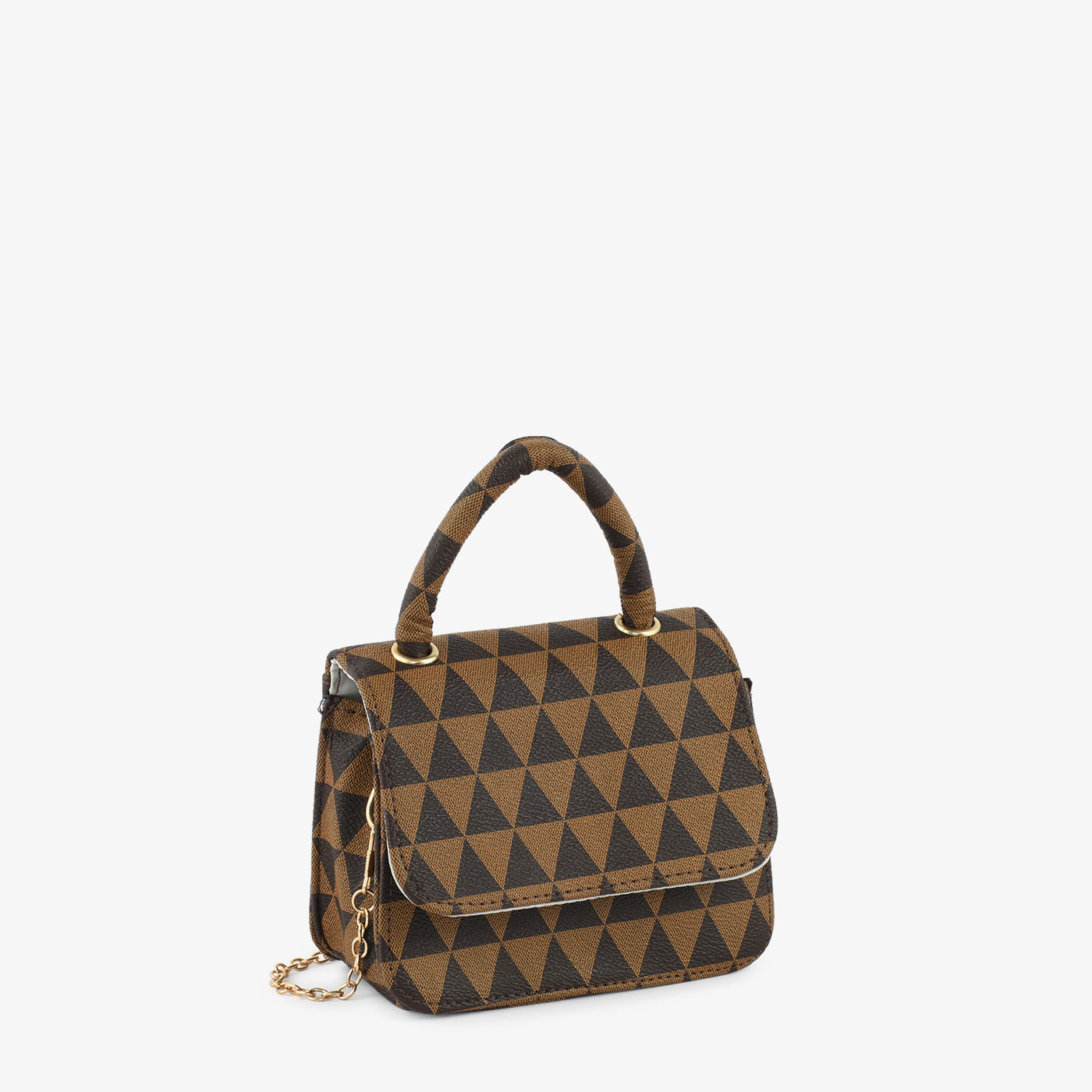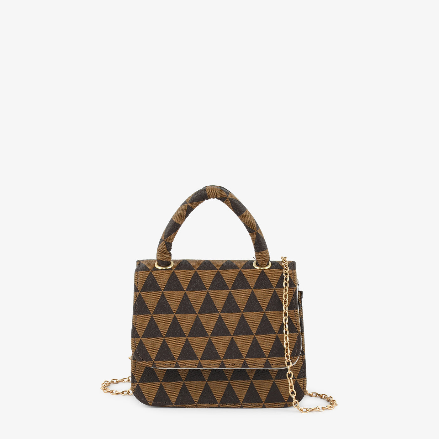 This trendy handbag features a bold geometric pattern and structured body for a modern look. With a chain strap and compact size, it’s the ideal accessory for effortless elegance.